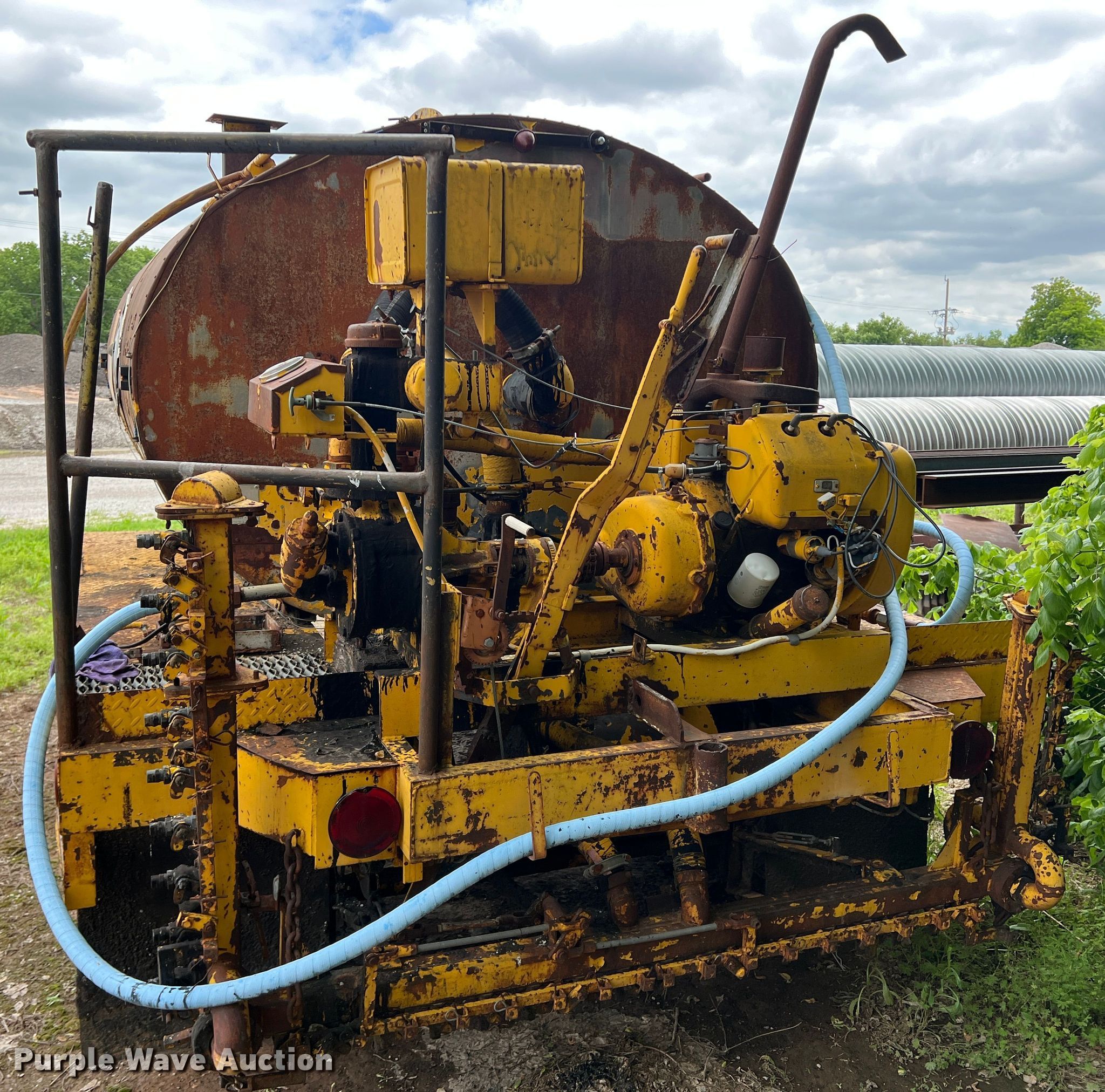 Wales MU-1000 oil distributor trailer. VIN: 0880991. Dimensions Overall: 15' L x 8' W. Features Tank type: Steel, No. of manways/manholes: 1 Width: 20", Pump Houdaille LL124, Spray boom Width: 11', Engine Cylinders: 4, Fuel Type: Gas. Chassis Hitch: Pintle, Landing gear: Single. Tires Steel wheels, Size: 12-16.5. This is worksite support equipment and will not come with a title. Transfer of ownership documentation will be a bill of sale. 102 West College Street. Burkburnett, TX 76354