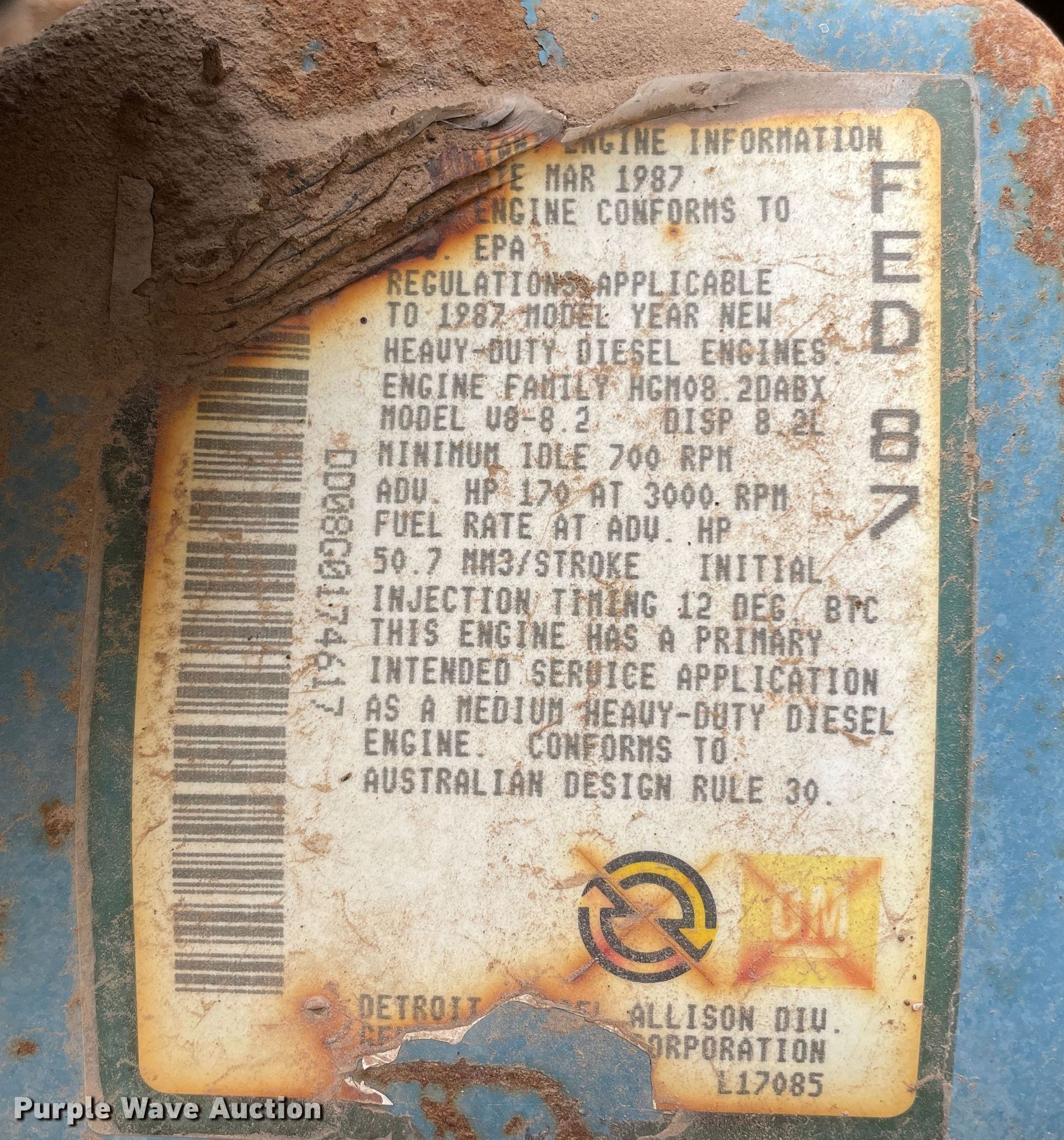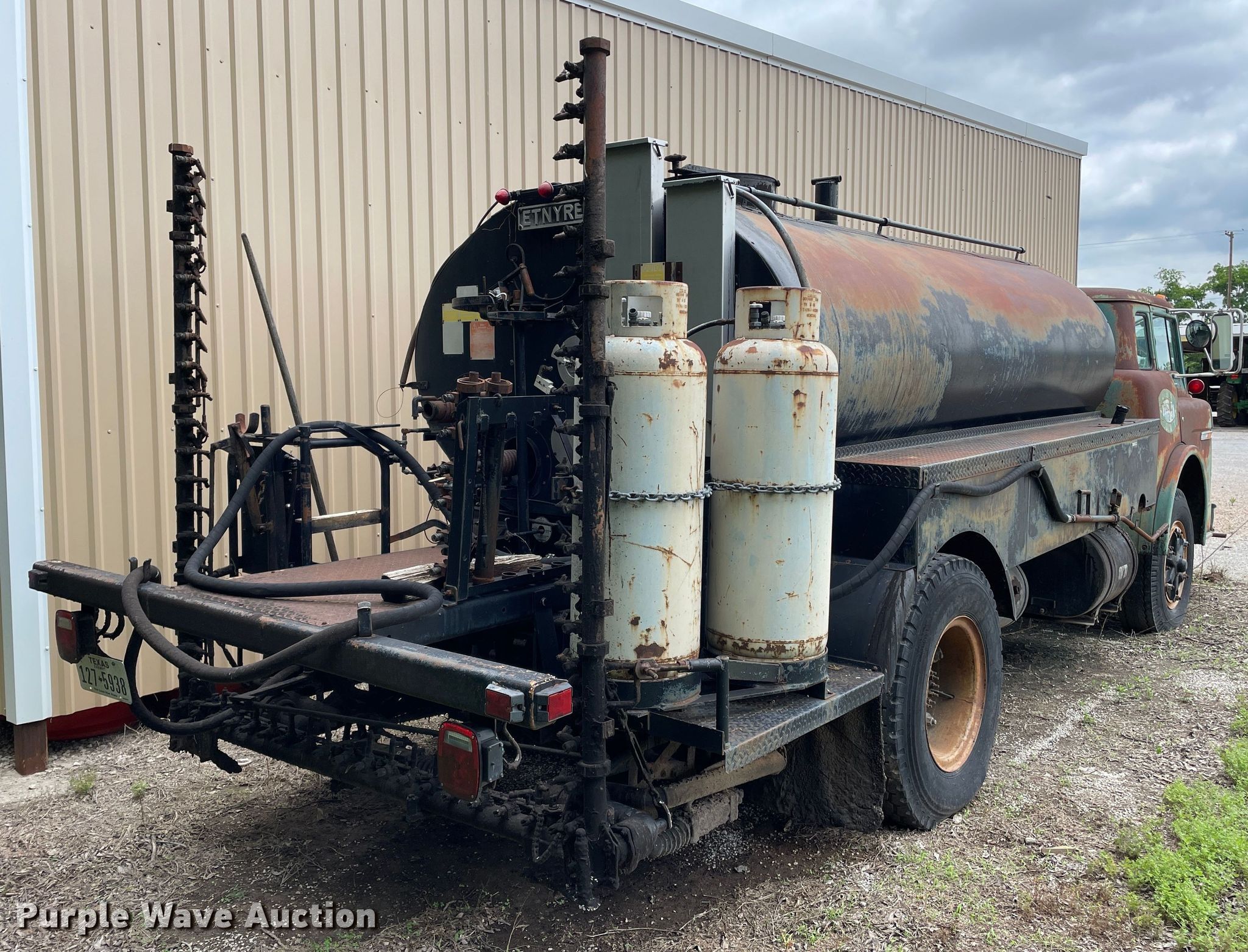 1987 Ford C800 oil distributor truck. Miles: 6,092 on odometer, VIN: 1FDXD84N0HVA37485. Engine Detroit Diesel 40877100, Displacement: 8.2L, Cylinders: 8, Fuel type: Diesel. Transmission Manual, Speed: 5, plus 2. Chassis Axles: Single, Suspension: Spring, Brakes: Air. Features Bed / tank Etnyre BT-HS, Serial: J9032, Capacity: 1,518 gallons, 17' L x 93" W, Burner: LPG, In-cab controls, Spray boom Width: 20', Folding.. Tires Front: 10.00-20, Rear: 10.00R20. Notes Dead battery, Non-operational clutch. Texas title. Mileage has not been verified. Exempt will be written in the odometer disclosure on the title. Title distribution may be delayed up to 30 days from verification of funds. 102 West College Street. Burkburnett, TX 76354
