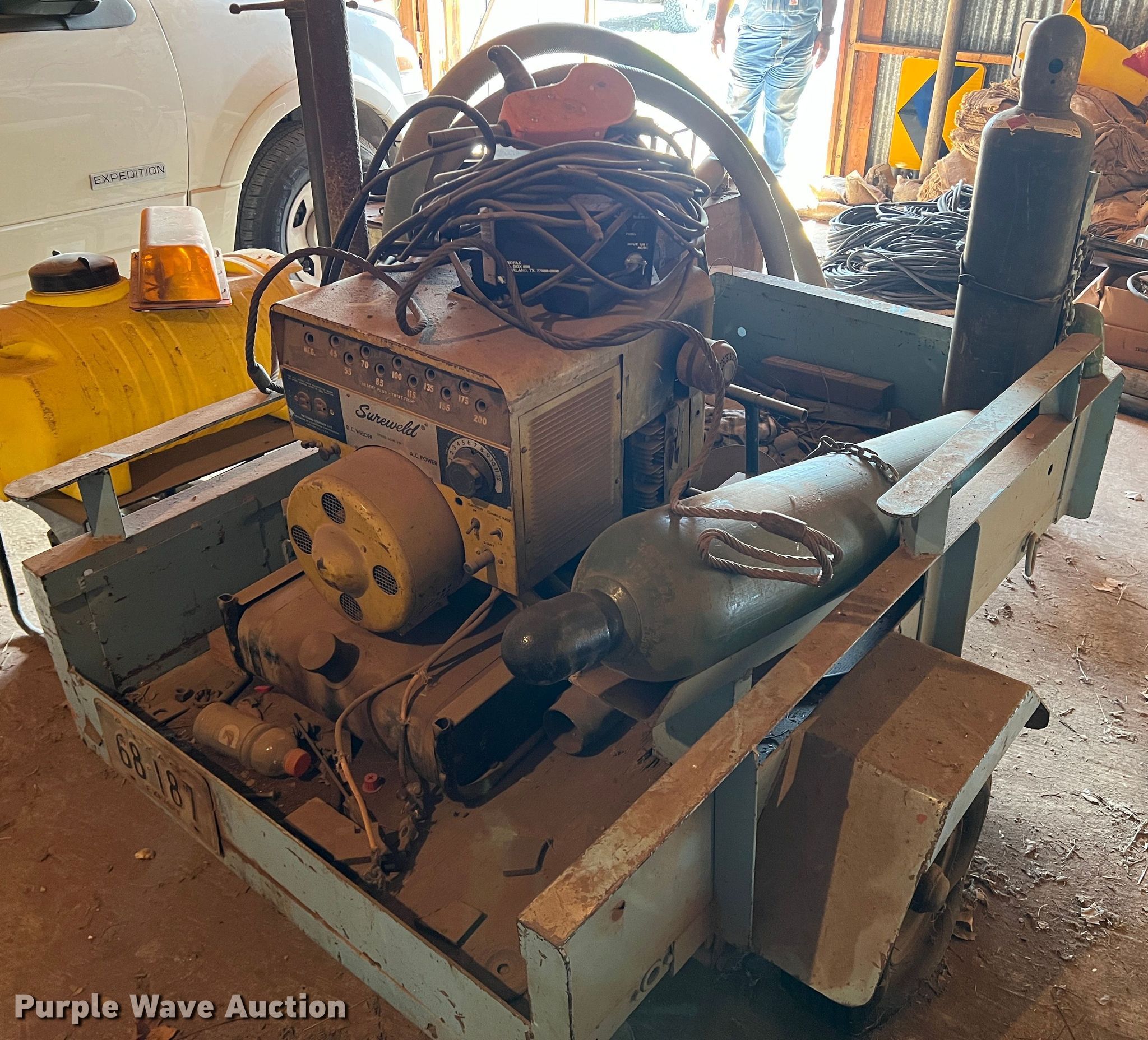 Sureweld 6CCK-331E/1F welder/generator. Serial: 60C640798. Features Welder Capabilities: DC, AC, Leads, Fuel tank, Bottles not included, Trailer mounted, Generator Watts: 3,500, kVA: 35, Phase: Single. Trailer 10' L x 64" W, Ball hitch size: 2", Axles: Single. Notes Flat tires. 610 East Jefferson Avenue. Iowa Park, TX 76367