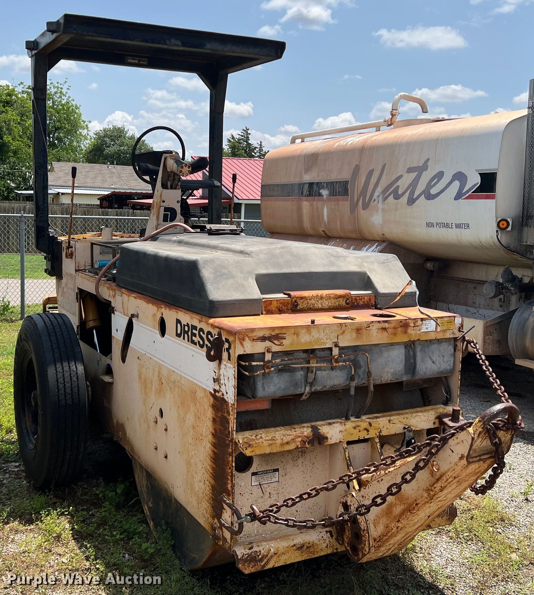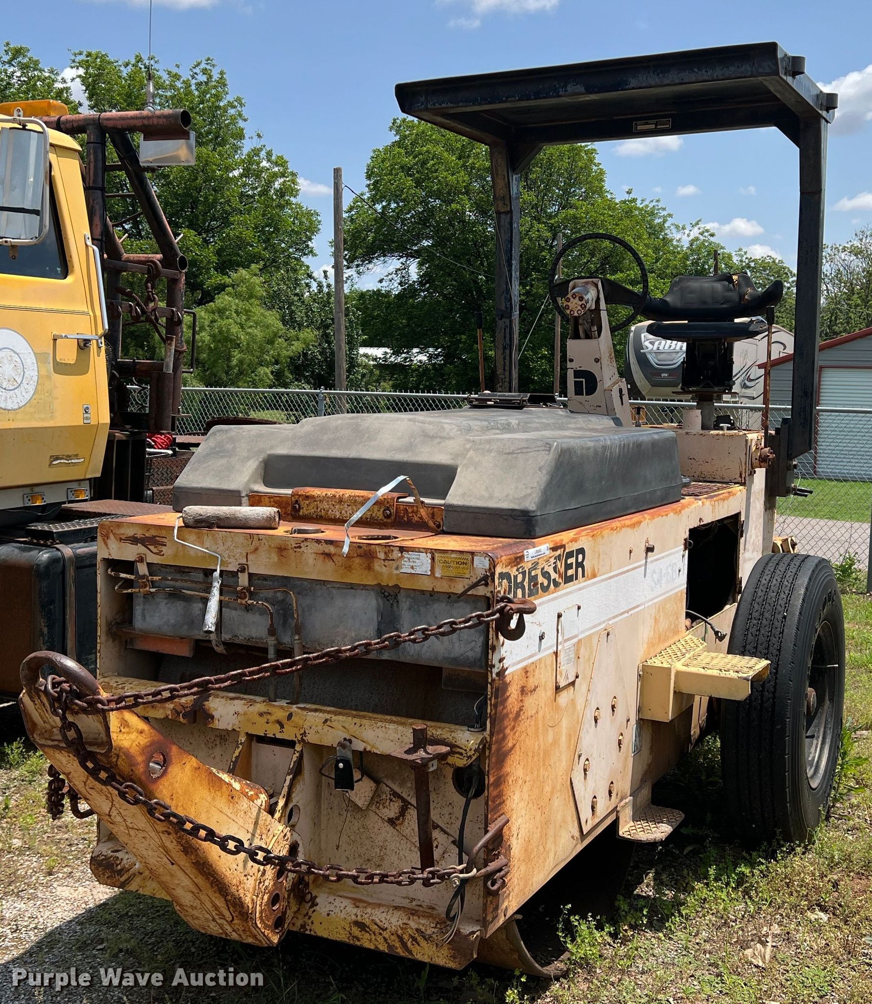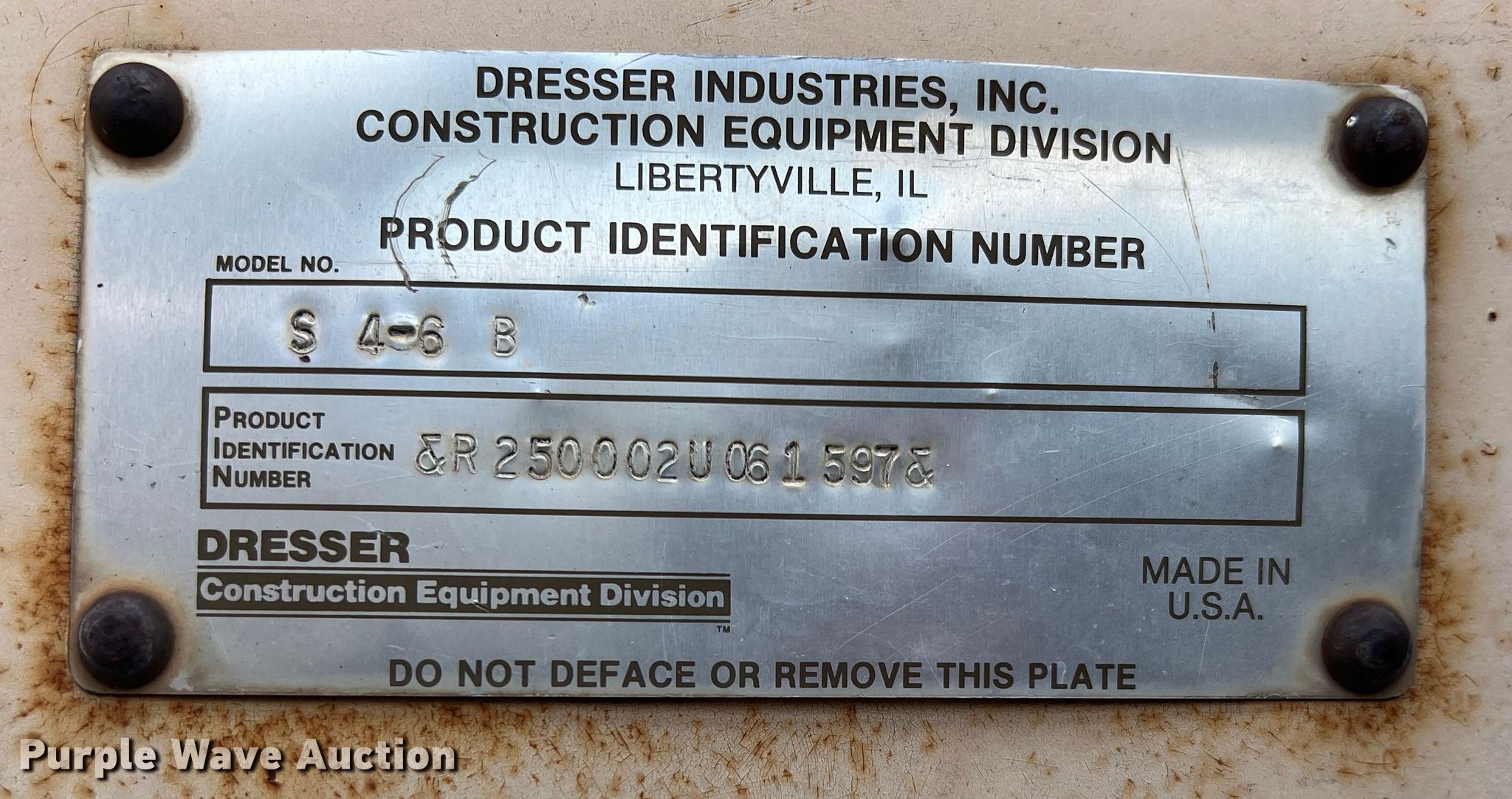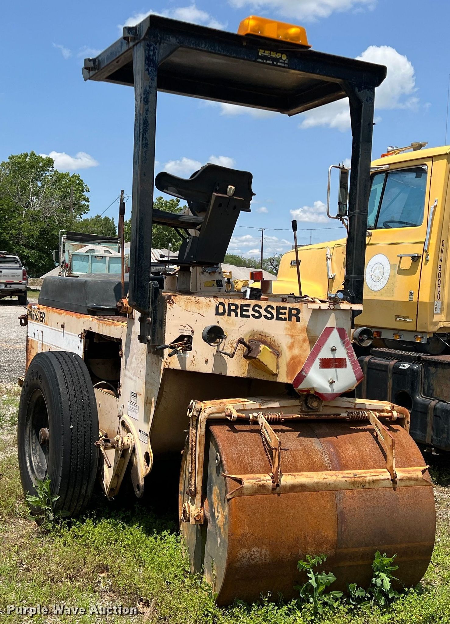 Dresser S4-6B double drum roller. Serial: R250002U061597. Engine Cylinders: 4, Fuel type: Diesel. Transmission Hydrostatic. Features Drum: Smooth, Front drum Width: 44", Diameter: 48", Rear drum Width: 40", Diameter: 34", Drum scrapers: Front, Rear. Tires Size: 10.00R20, Steel wheels. Notes Non-operational unit. 610 East Jefferson Avenue. Iowa Park, TX 76367