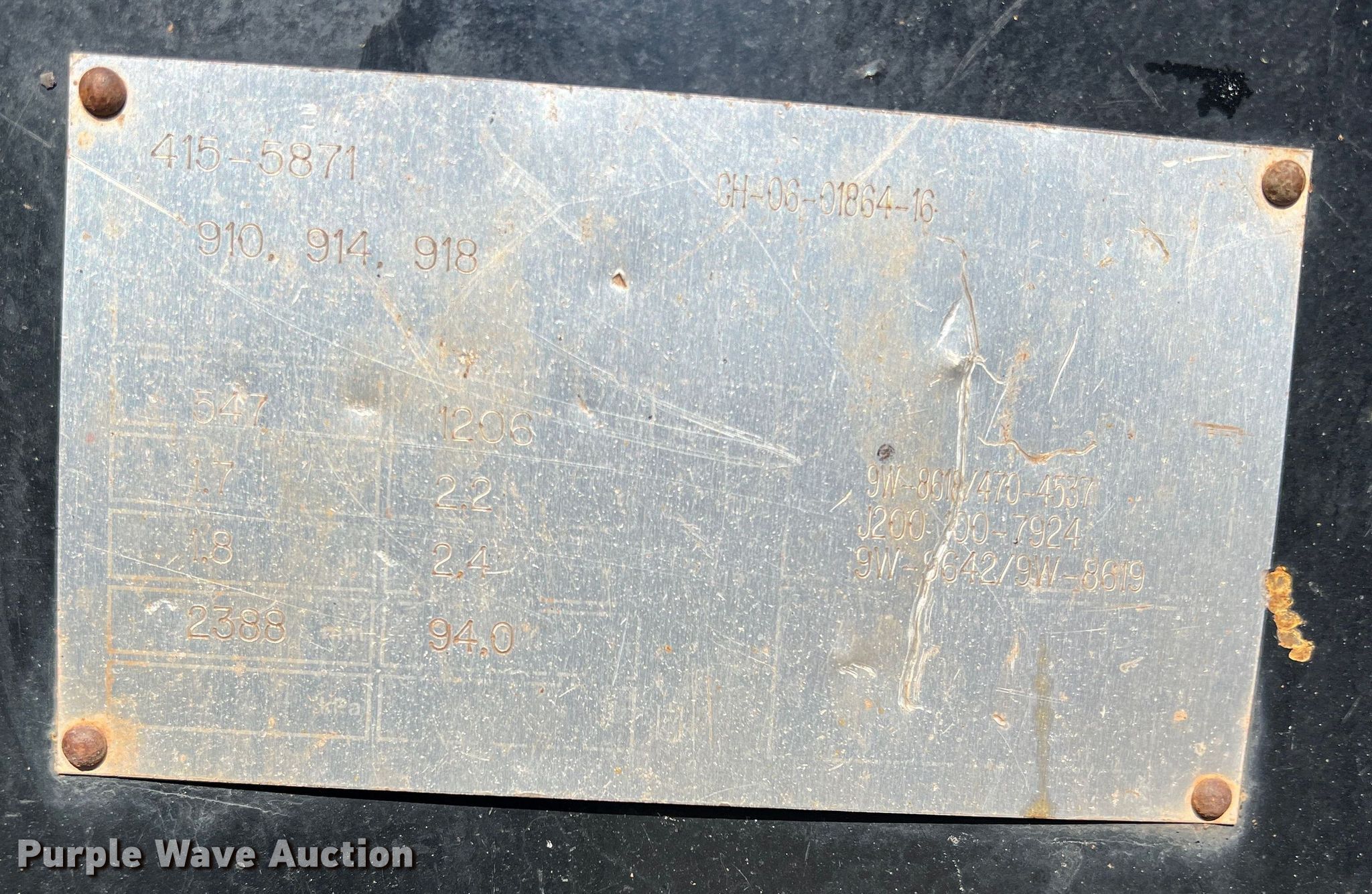 2016 Caterpillar 918M wheel loader. Hours: 2,380 on meter, Serial: CAT0918MVH2600170. Engine Caterpillar, Cylinders: 4, Fuel type: Diesel. Transmission Hydrostatic, Two speed travel. Chassis Differential lock. Operators station Enclosed cab, AC, Heat, Bucket controls: Joystick. Features Auxiliary hydraulics: Front, Bucket Caterpillar 415-5871, Capacity: 2.4 cu.yd., Width: 93", Forks Caterpillar 6W-8832, Length: 54". Tires Size: 17.5R25. Wichita County, TX. 2023 State Highway 25. Electra, TX 76360