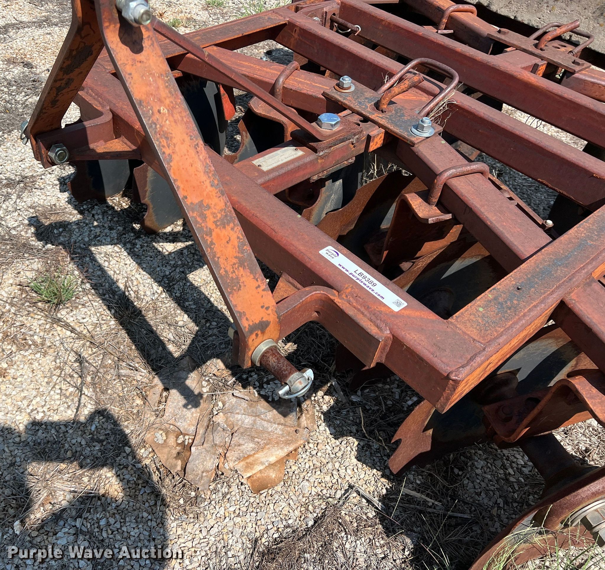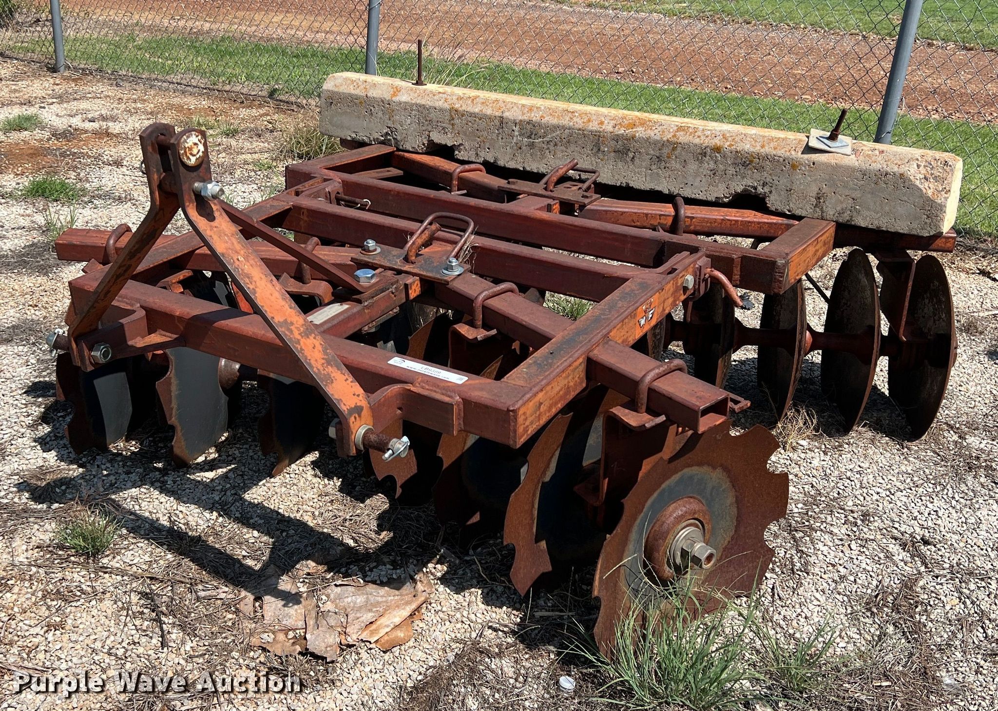 Massey Fergusen MF27 tandem disk. Overall width: 6', Serial: 16097. Features Front blades Diameter: 20", Spacing: 7", Rear blades Diameter: 20", Spacing: 7", Disk scrapers, Hitch: Three point. Wichita County, TX. 2023 State Highway 25. Electra, TX 76360