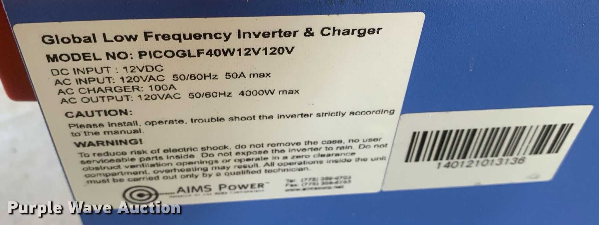 Purple Wave is selling a used Tools in Texas. This item is a Aims Power inverter with the following: Serial: 140121013136, Watts: 4000, Hertz: 50/60, Amps: 50, DC input, AC input, Unknown operating condition