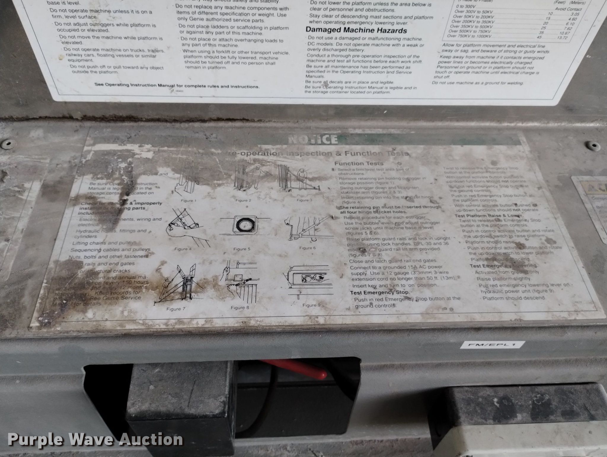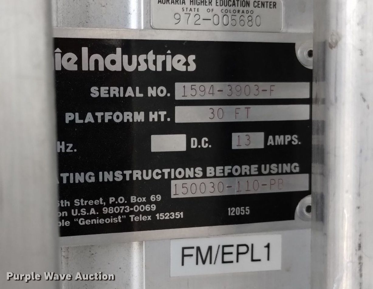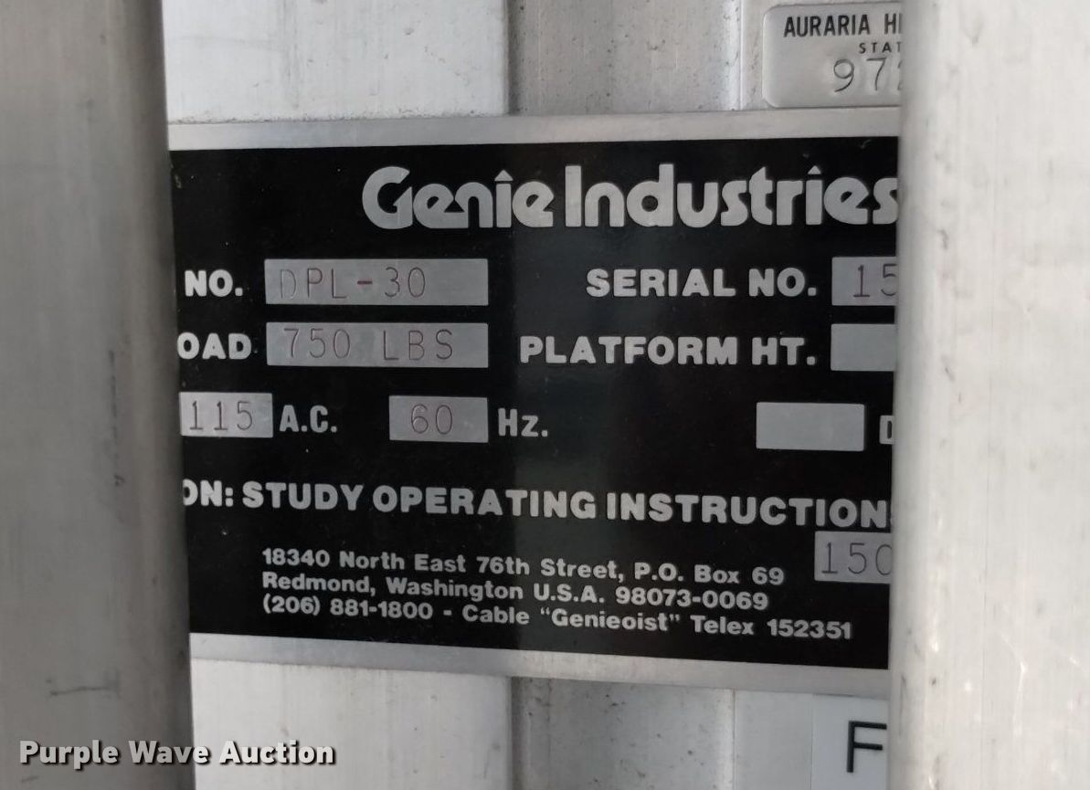 Purple Wave is selling a used Scissor or Vertical Lift in Colorado. This item is a Genie DPL-30 vertical lift with the following: Serial: 1594-3903-F