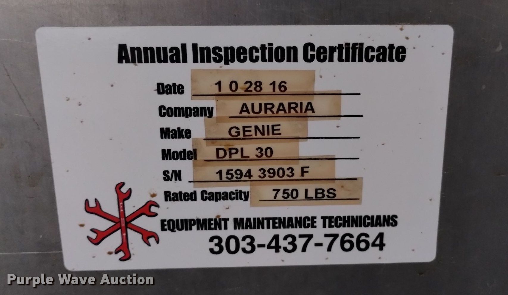 Genie DPL-30 vertical lift. Serial: 1594-3903-F. Features Maximum lift capacity: 750 lbs, Maximum lift height: 30', Platform: 72" L x 26" W. Tires Solid. Notes Unknown operating condition. Auraria Higher Education Center. 1156 7th Street. Denver, CO 80217-3361