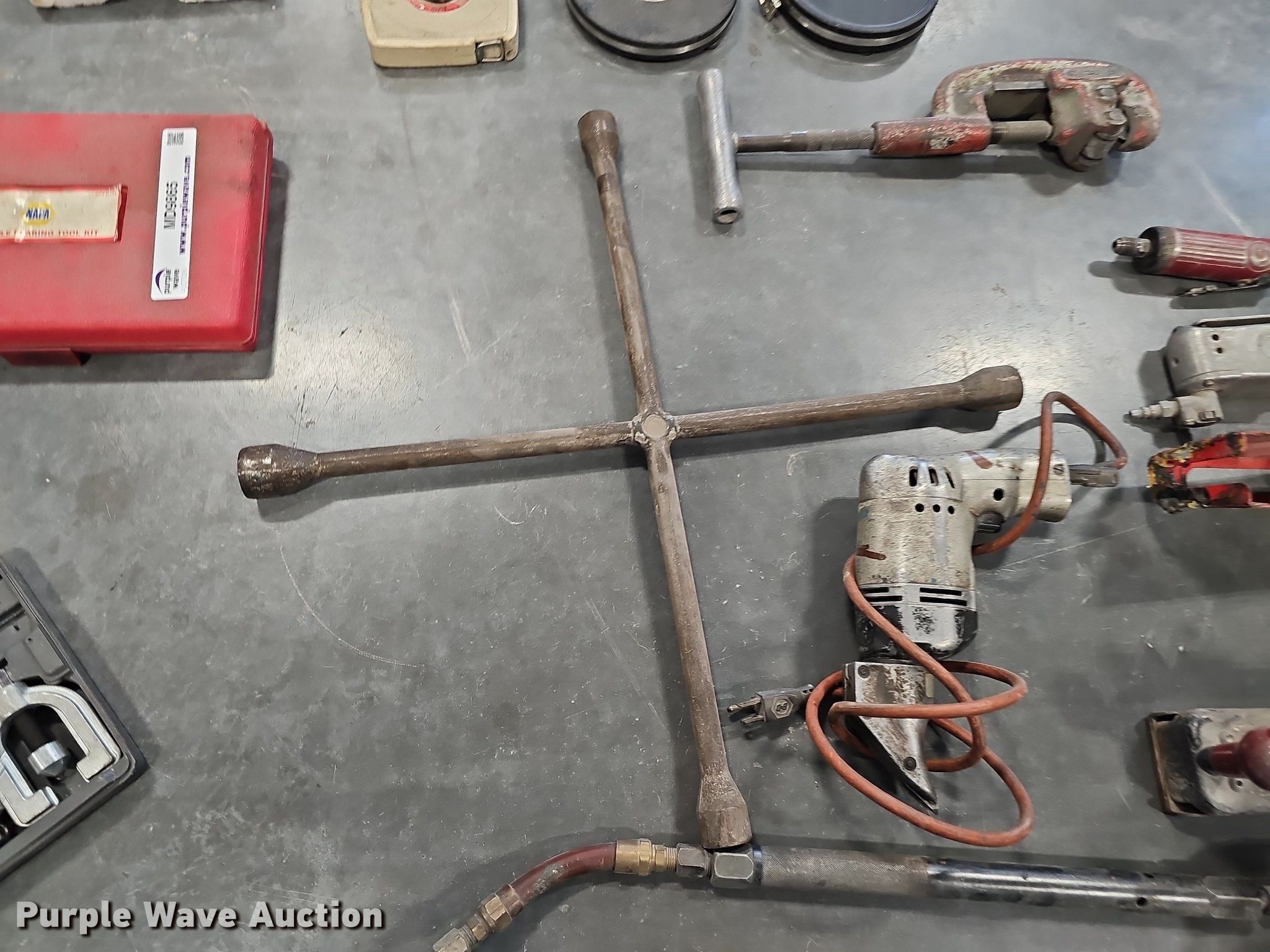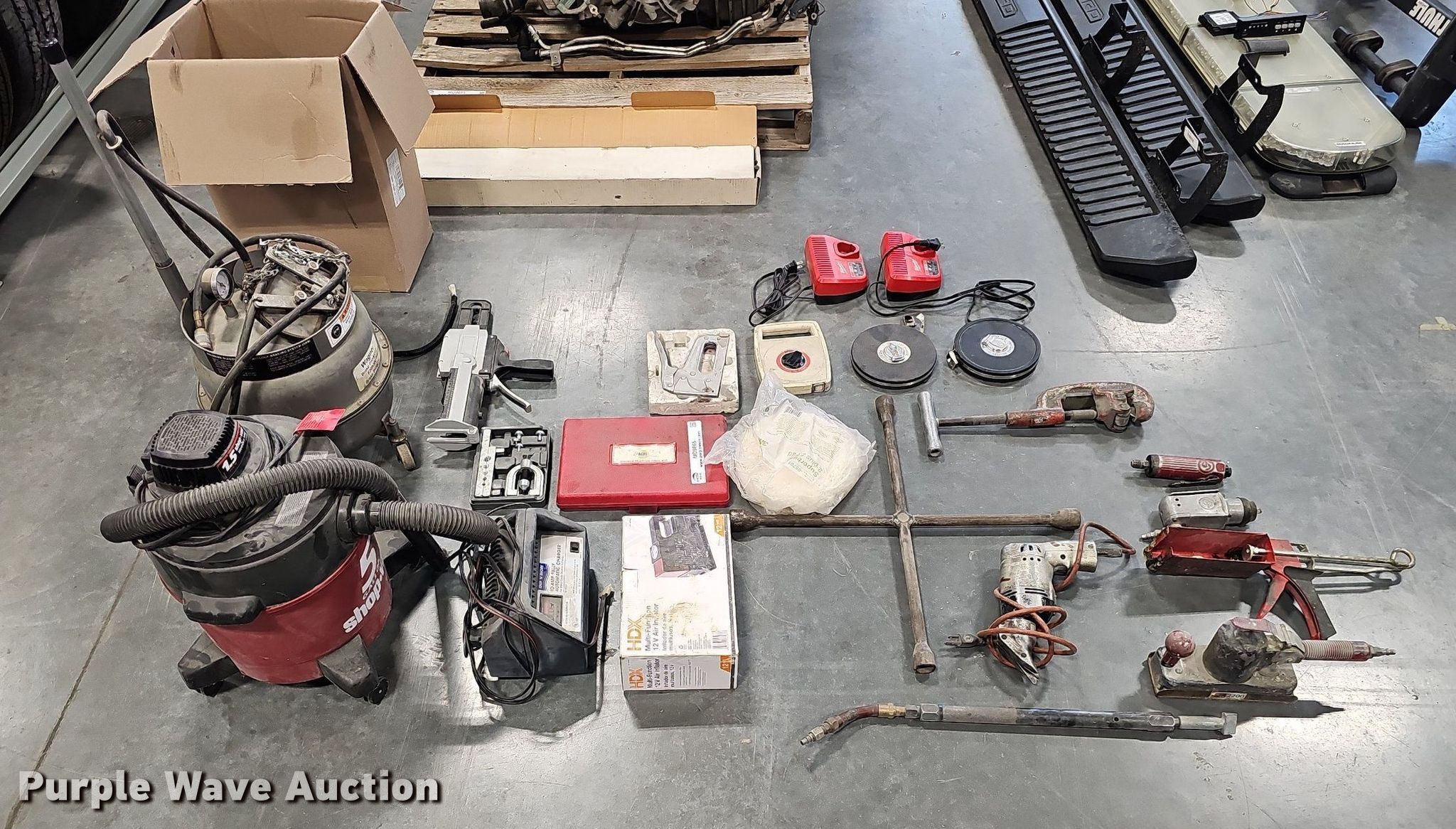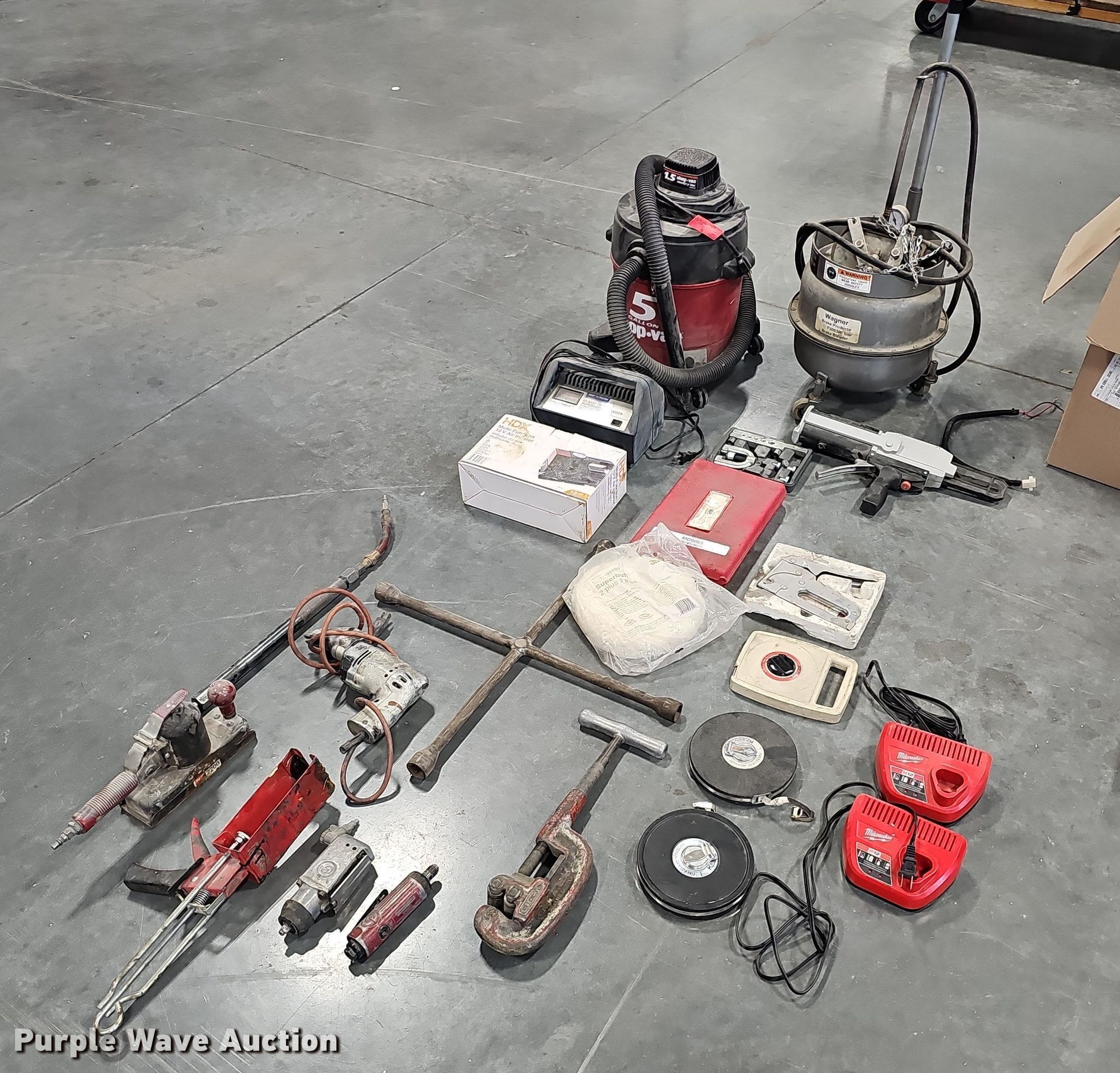 Purple Wave is selling a used Tools in Nebraska. This item is a Tools with the following: Shop vacuum, Capacity: 5 gallons, Wagner brake bleeder, (2) caulk guns, (2) flaring tool kits, HDX air pump, Battery charger, Air sander, Air ratchet, Dotco air grinder, Head missing, Lug wrench, (3) tape measures, (2) Milwaukee M12 battery chargers, Stapler, Sanding blocks, Pipe cutter