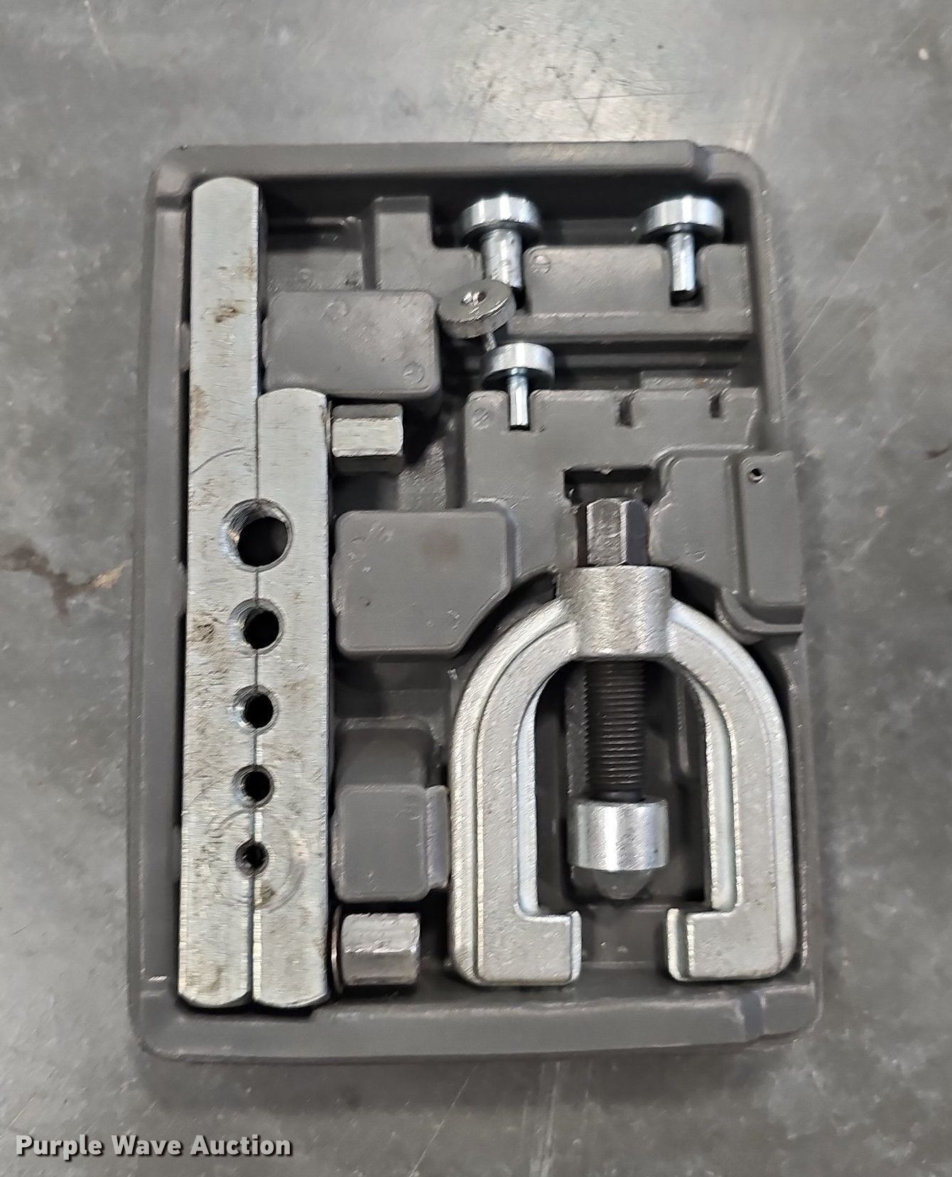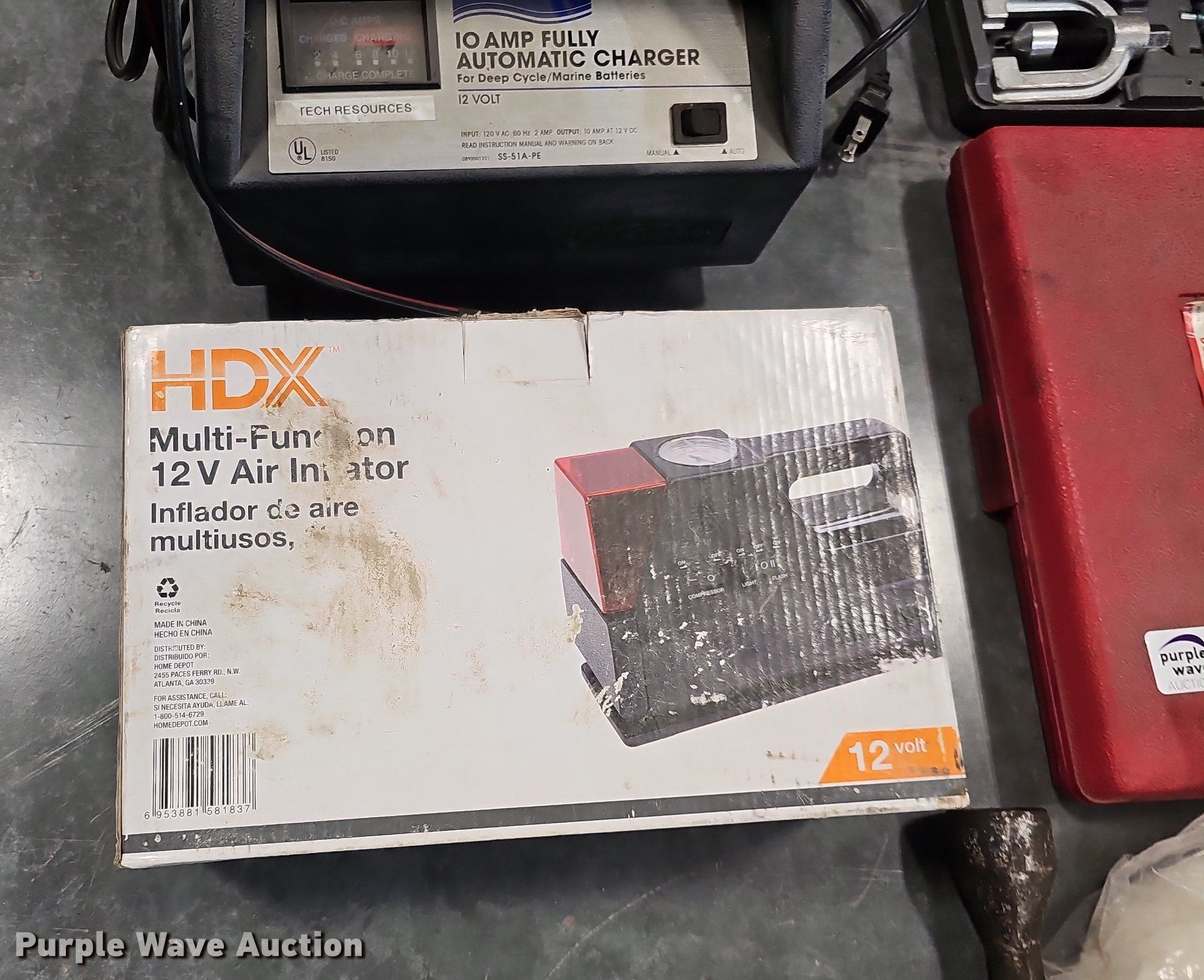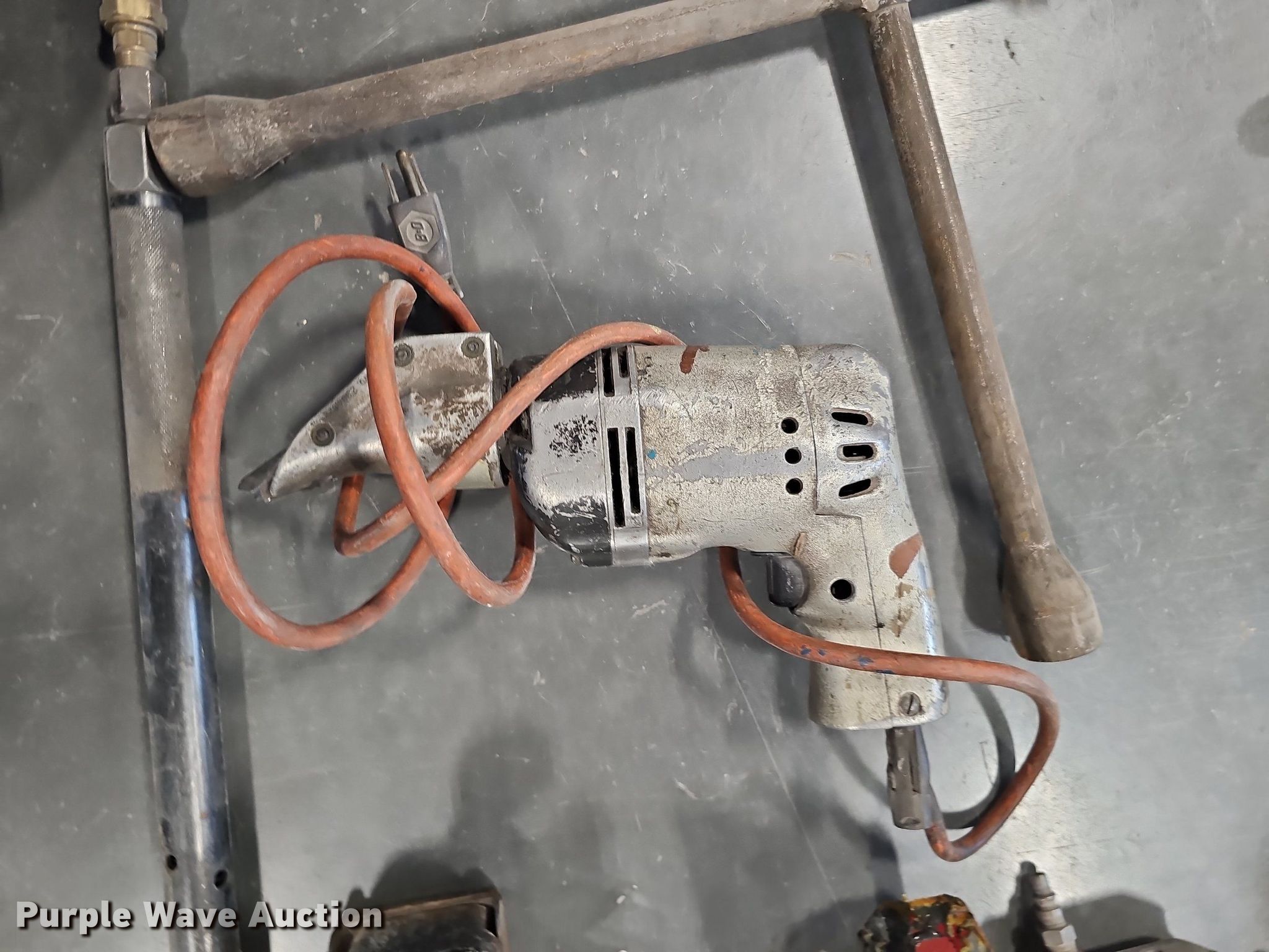 Purple Wave is selling a used Tools in Nebraska. This item is a Tools with the following: Shop vacuum, Capacity: 5 gallons, Wagner brake bleeder, (2) caulk guns, (2) flaring tool kits, HDX air pump, Battery charger, Air sander, Air ratchet, Dotco air grinder, Head missing, Lug wrench, (3) tape measures, (2) Milwaukee M12 battery chargers, Stapler, Sanding blocks, Pipe cutter