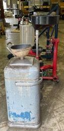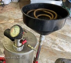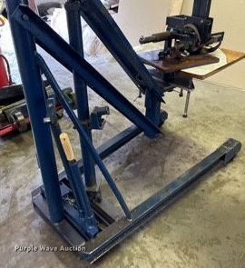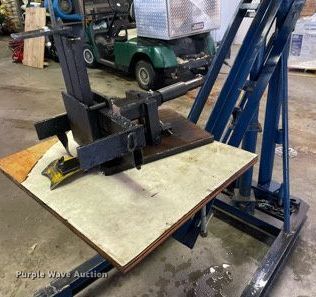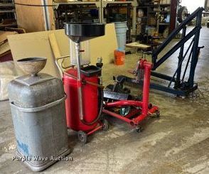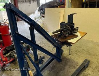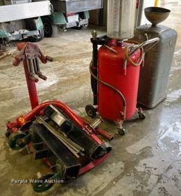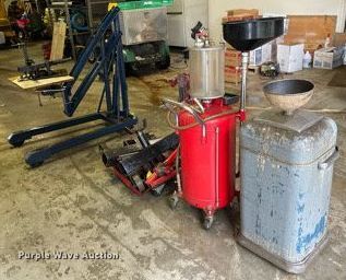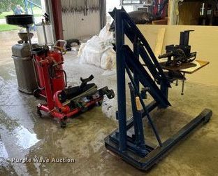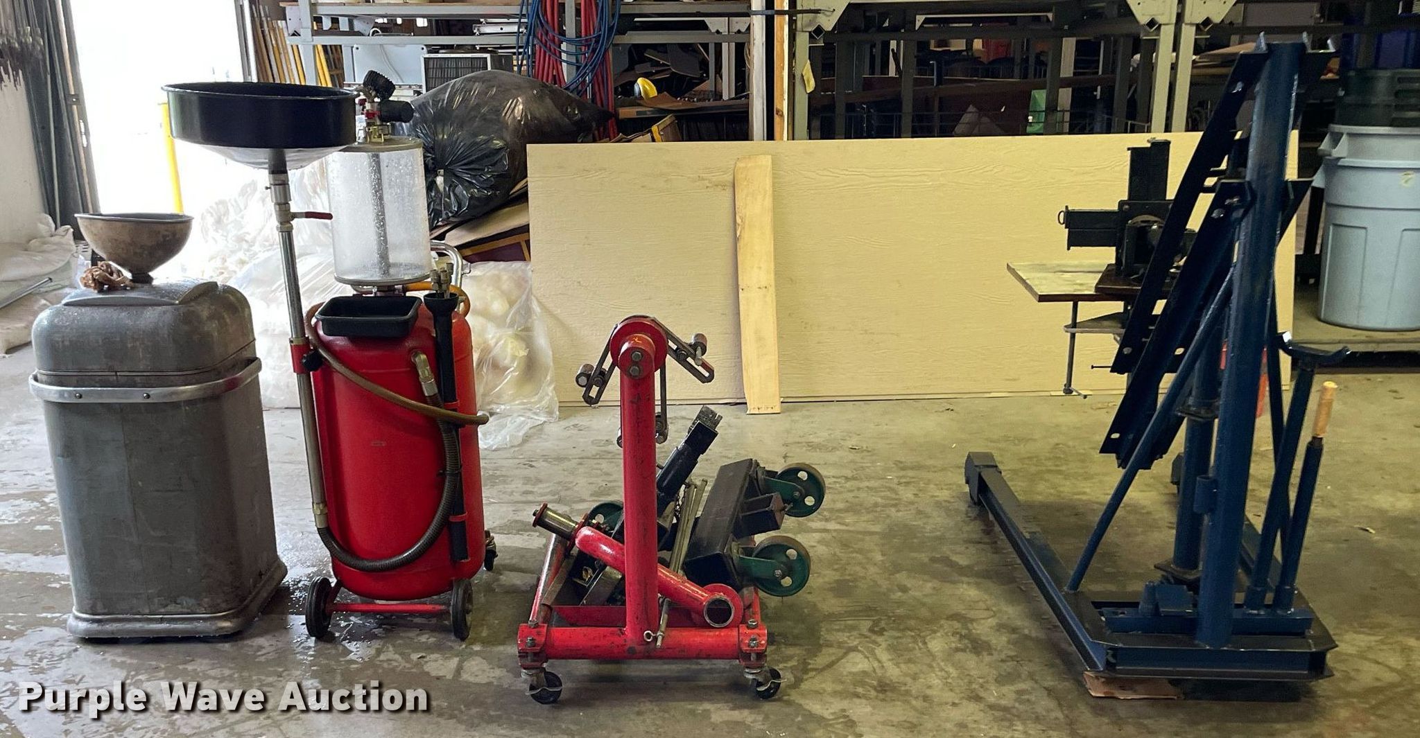 Purple Wave is selling a used Tools in Kansas. This item is a Tools with the following: Transmission lift, Engine stand, (2) waste oil containers