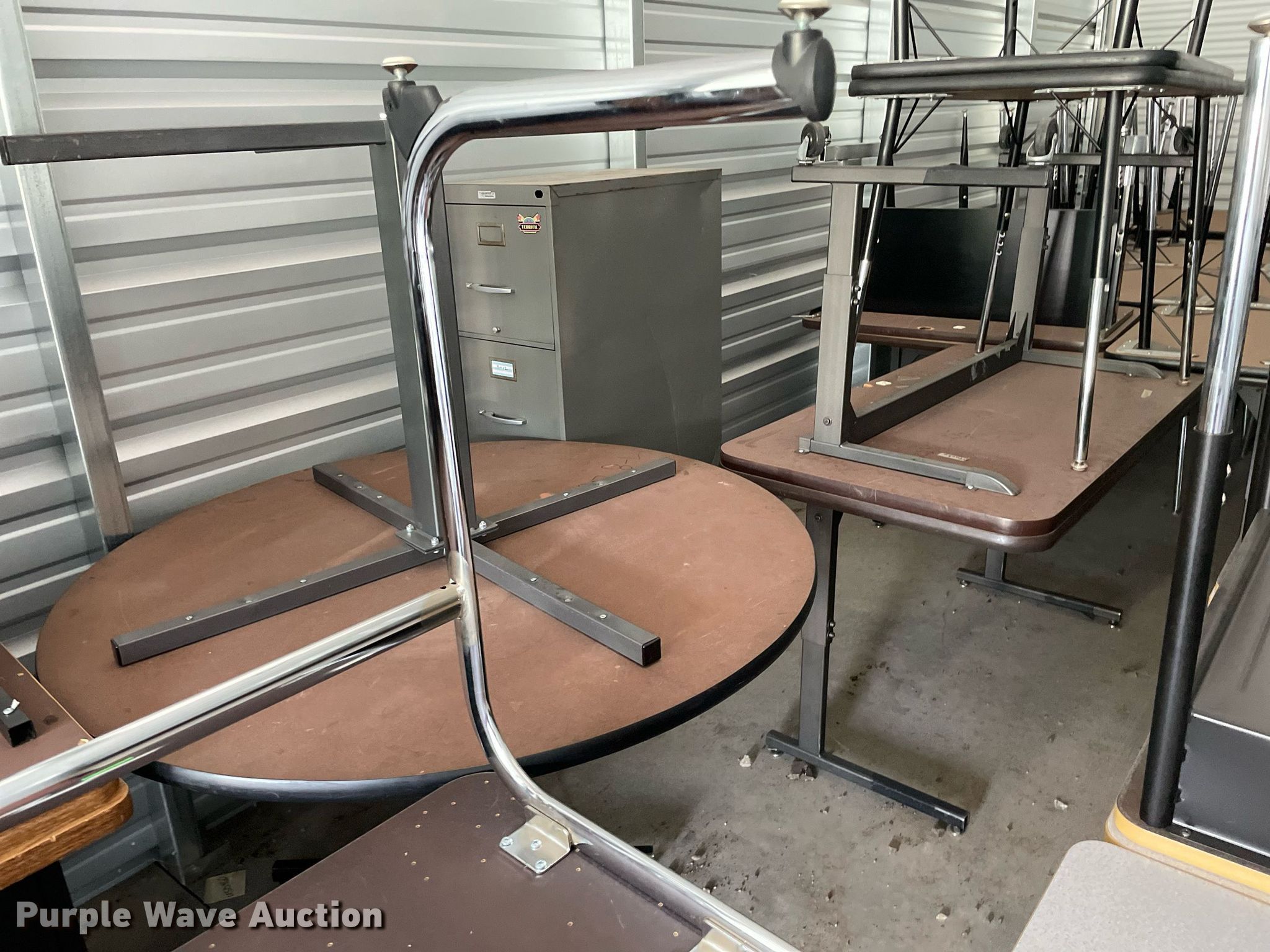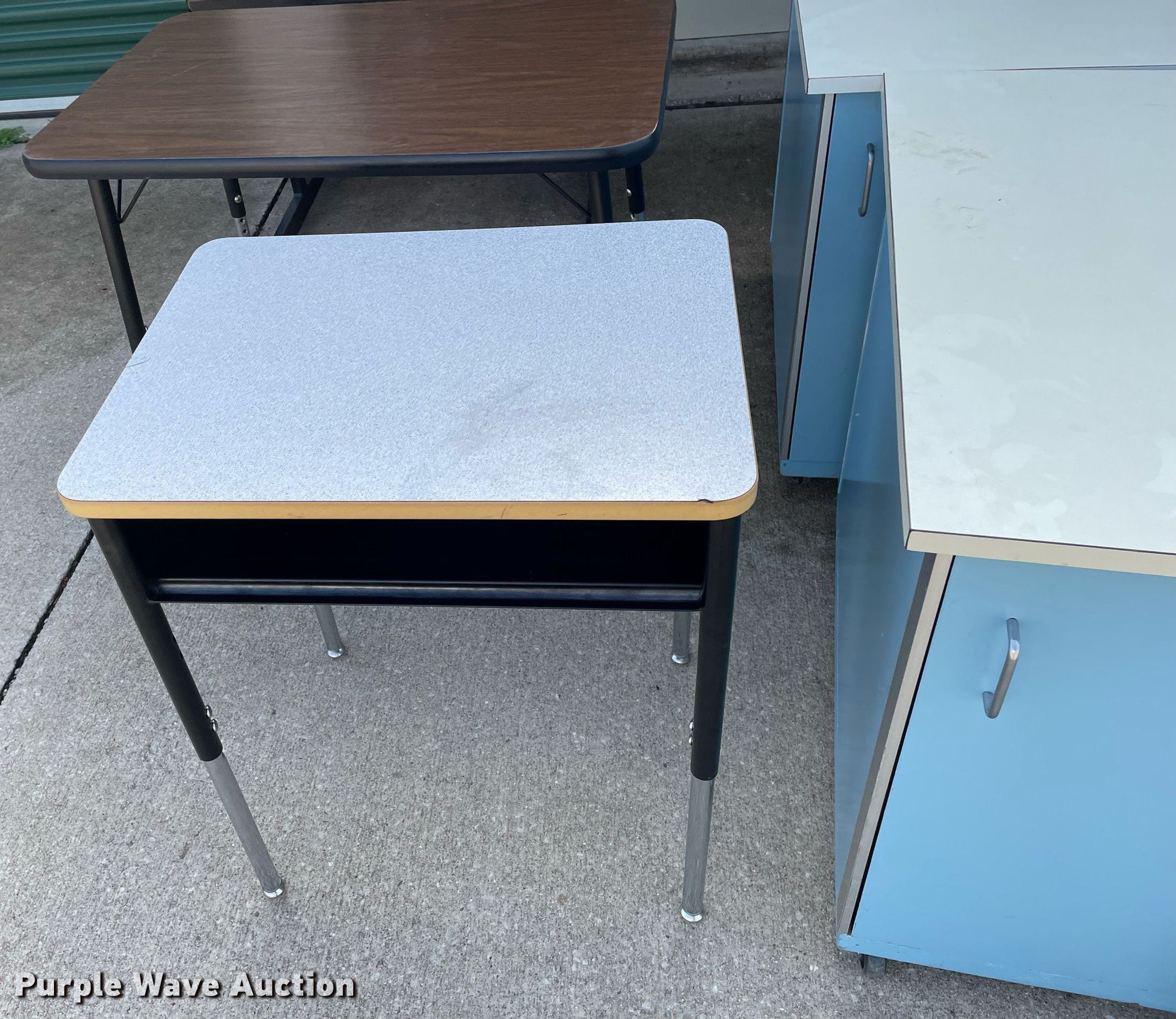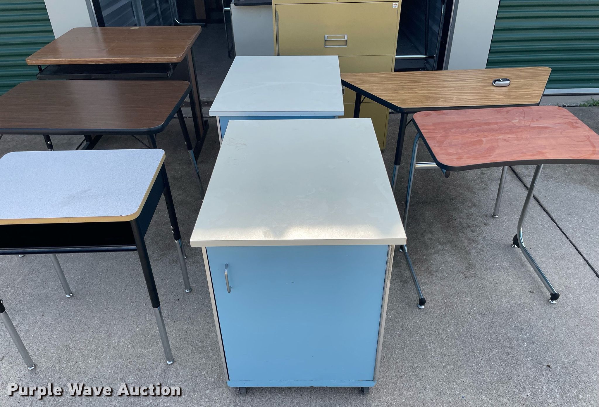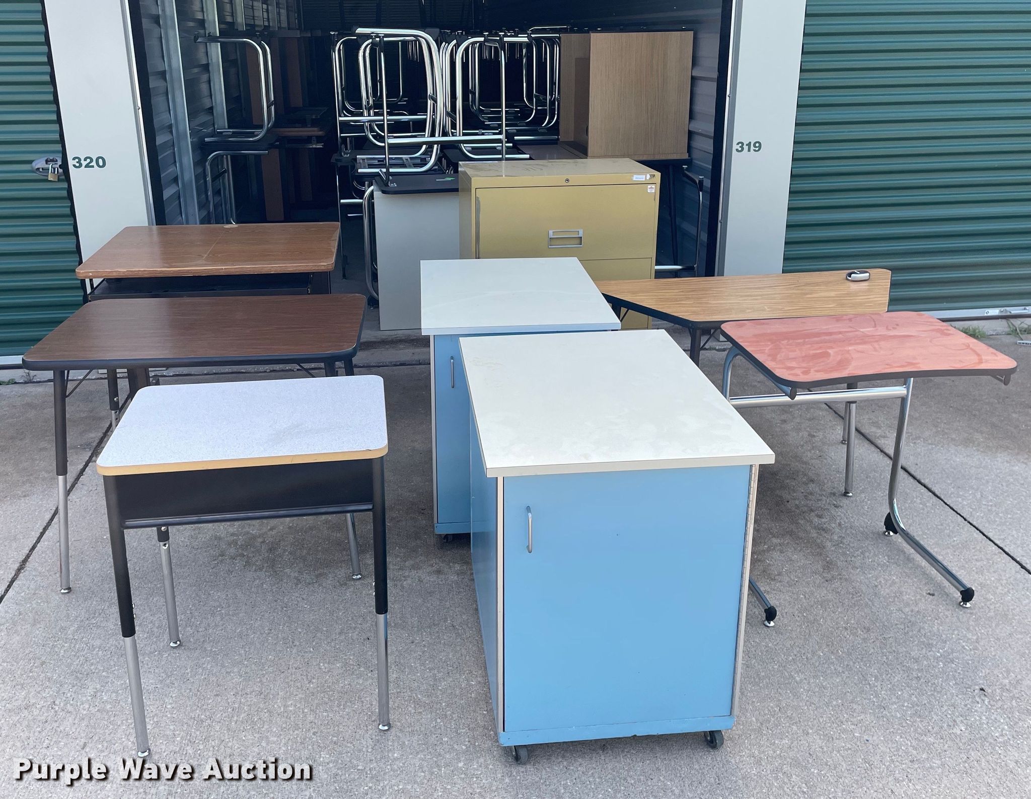 Purple Wave is selling a used Furniture in Kansas. This item is a Furniture with the following: Approx. 100 desks, Approx. 26 desks, 23.5" x 17.5", Approx. 40 desks, 25.5" x 18", Approx. 32 desks, 35.5" x 23.5", (2) 4' round tables, 5' L x 3' W table, (3) file cabinets, (2) sewing machine cabinets, (3) sewing machines, Unknown operating condition