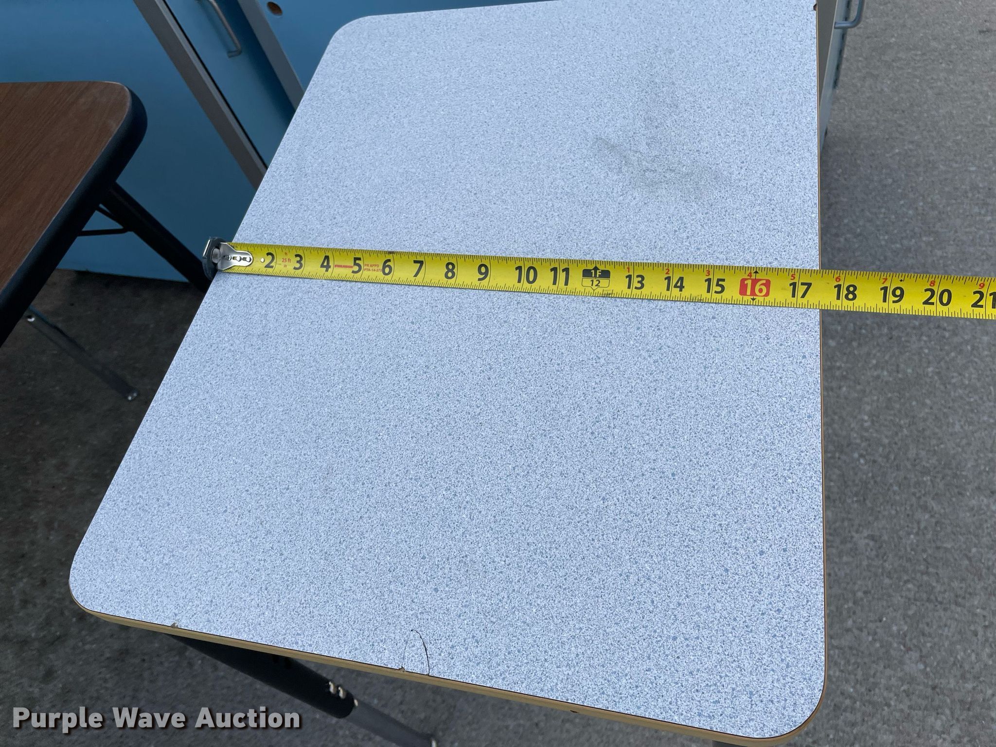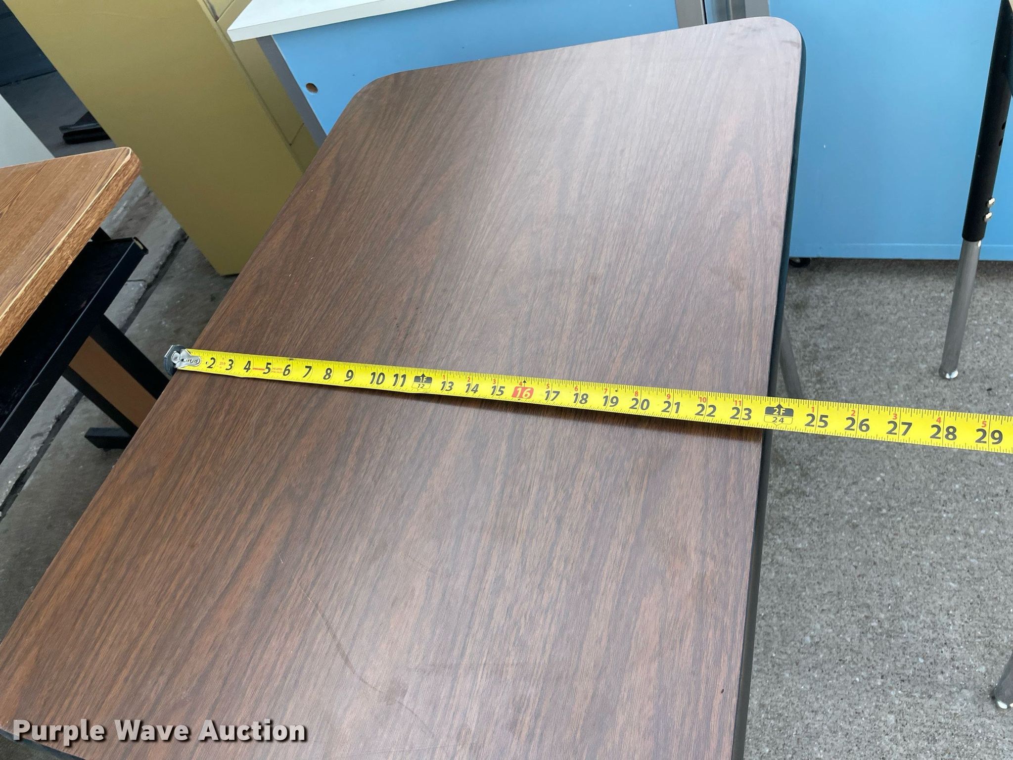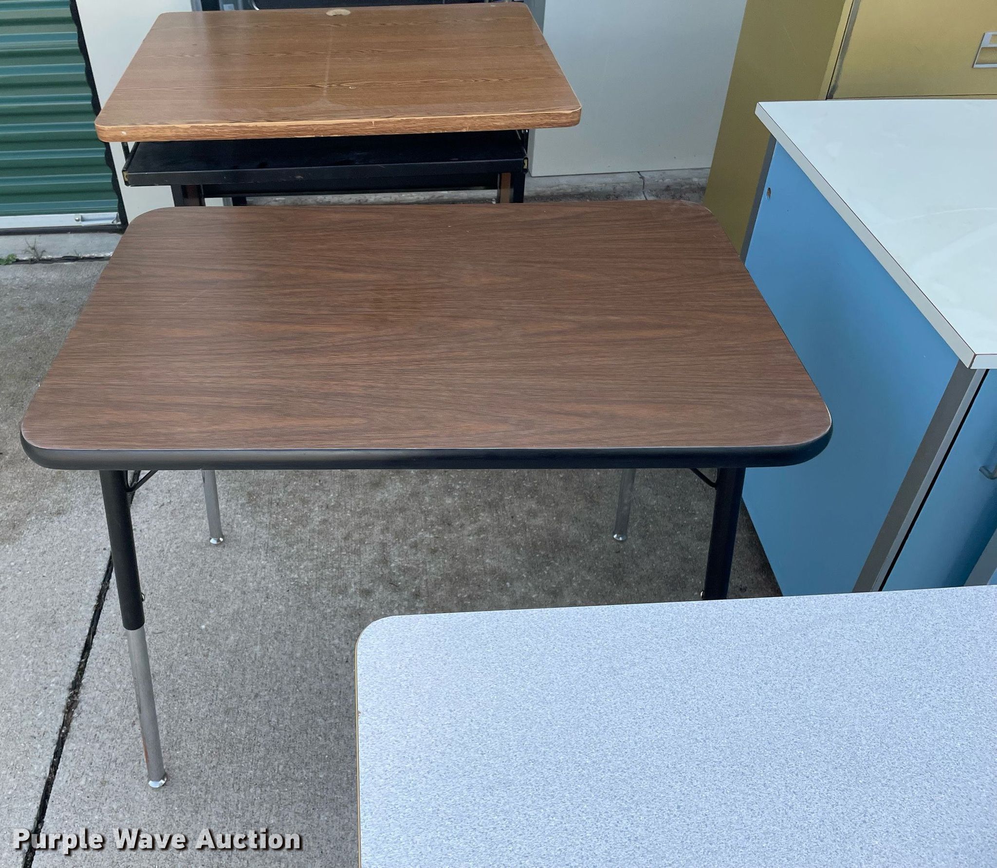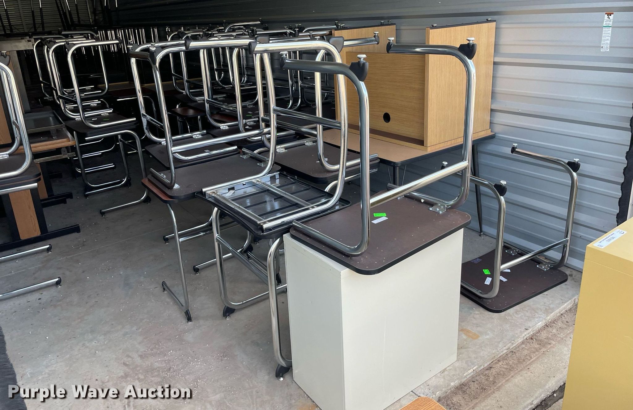 Purple Wave is selling a used Furniture in Kansas. This item is a Furniture with the following: Approx. 100 desks, Approx. 26 desks, 23.5" x 17.5", Approx. 40 desks, 25.5" x 18", Approx. 32 desks, 35.5" x 23.5", (2) 4' round tables, 5' L x 3' W table, (3) file cabinets, (2) sewing machine cabinets, (3) sewing machines, Unknown operating condition