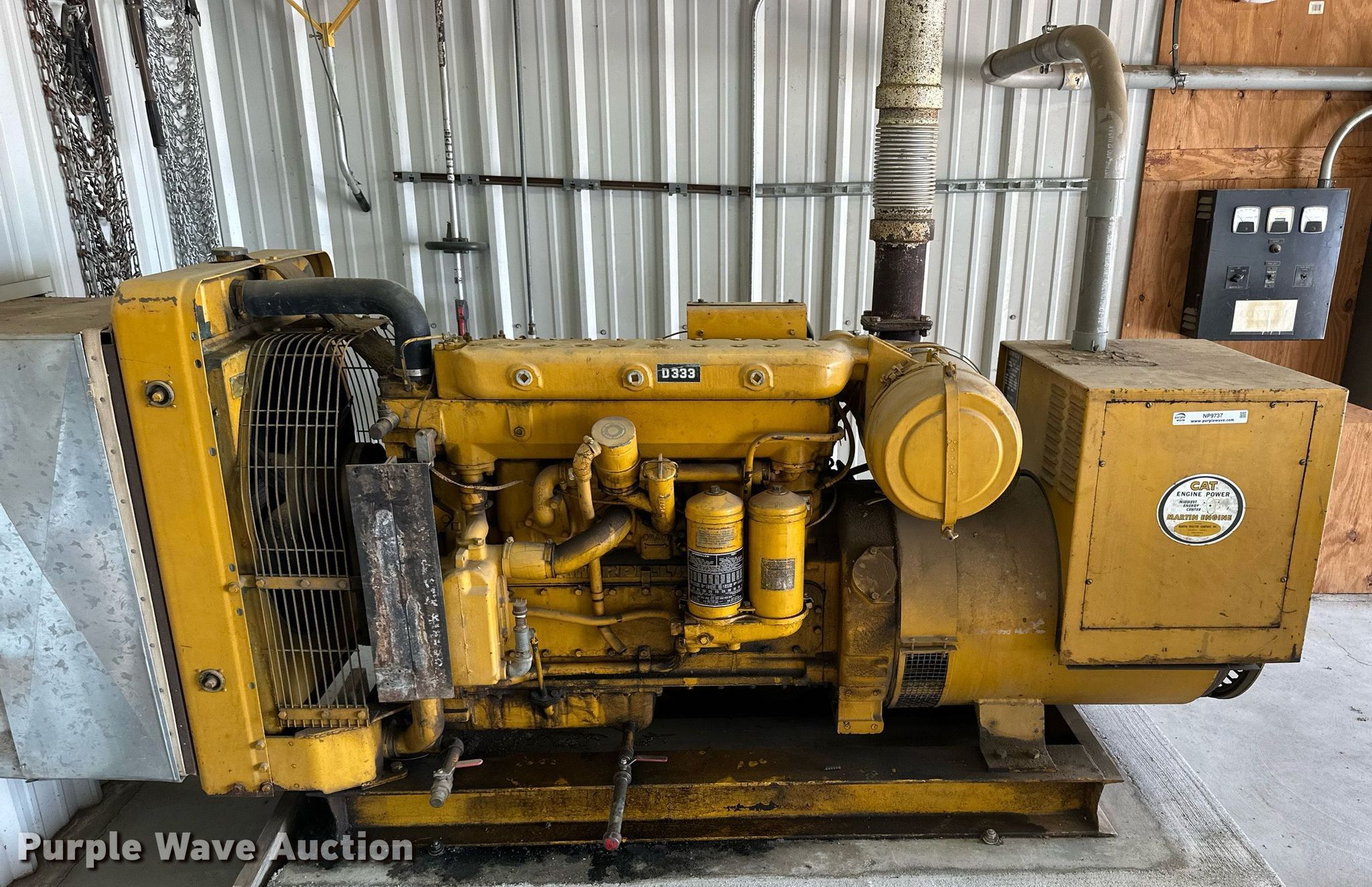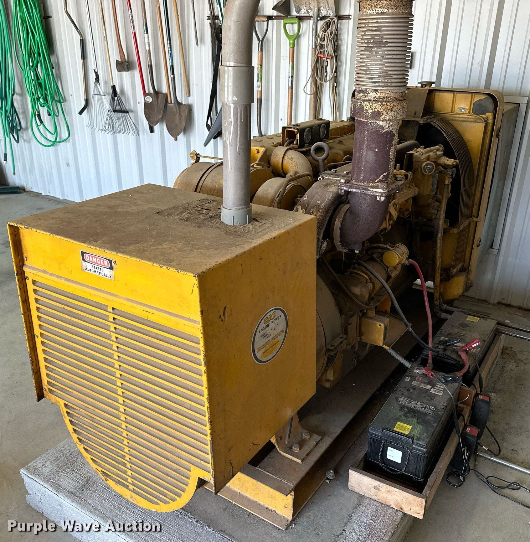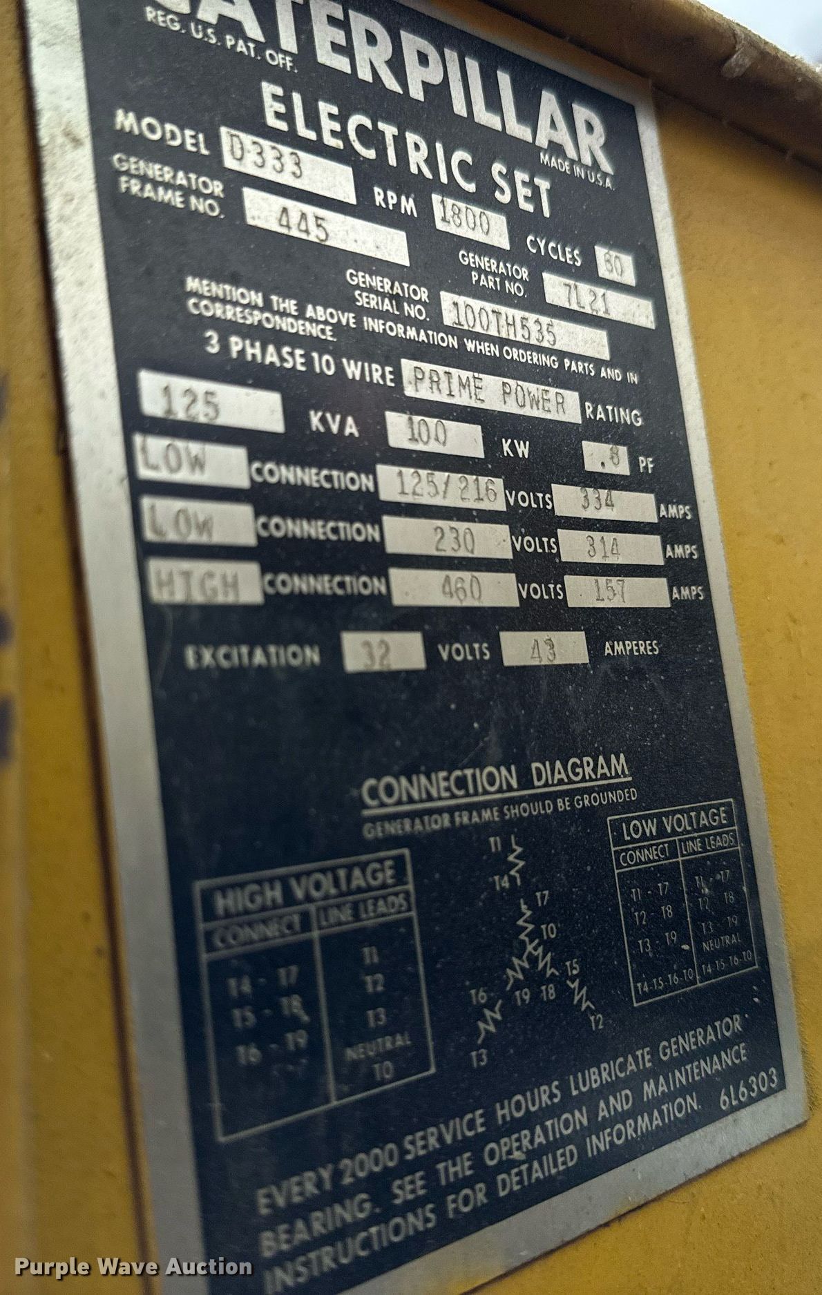 Caterpillar D333 generator. Hours: 1,232 on meter, Serial: 100TH535. Engine Caterpillar D333, Serial: 87B1096, Cylinders: 6, Fuel type: Diesel. Features Generator kVA: 125, kW: 100, Phase: Three, Backup start, Electric start, Fuel tank, Skid mounted, Control panel, Exhaust pipe. Notes Batteries not included. 216 North Main Street. WaKeeney, KS 67672