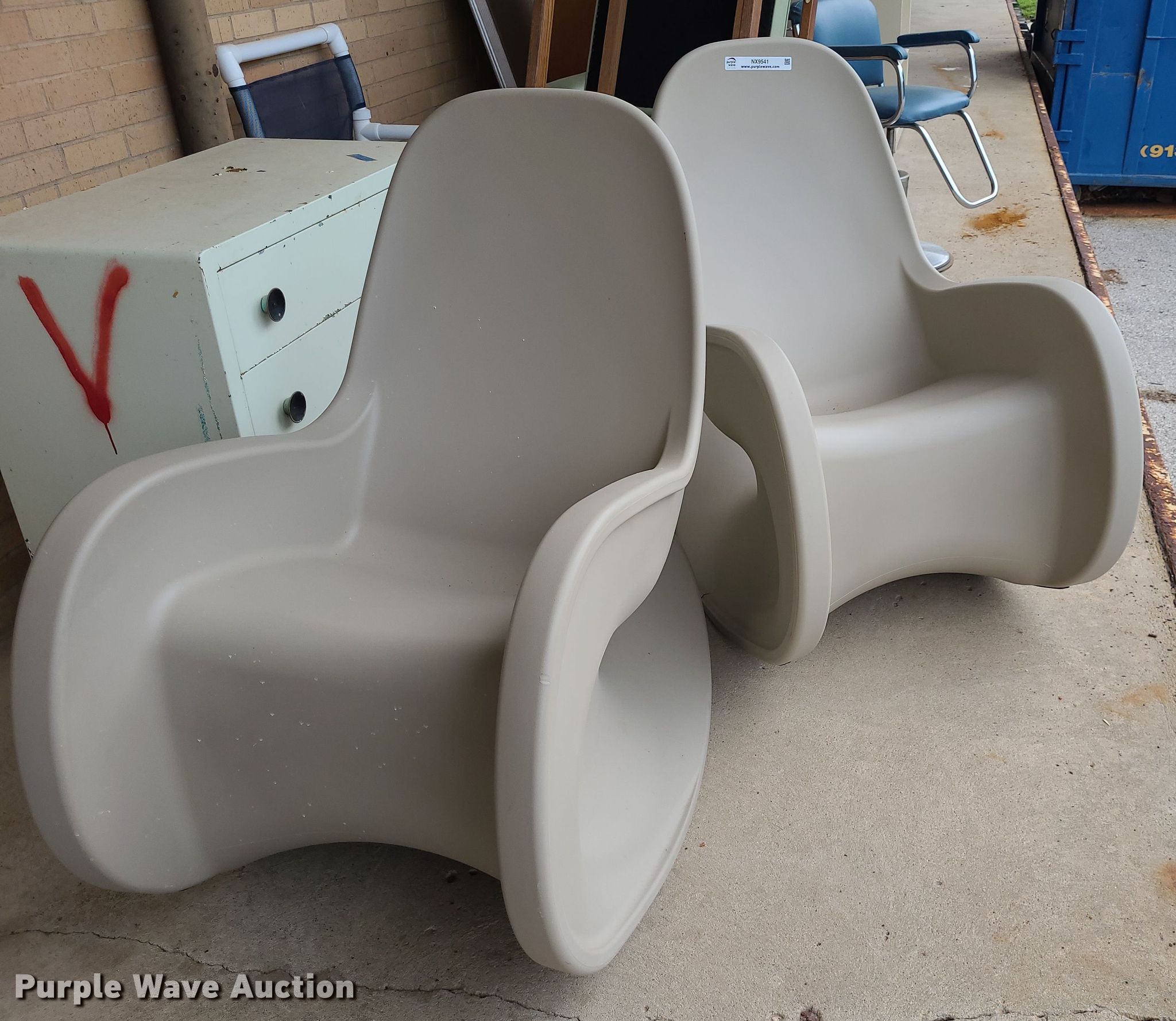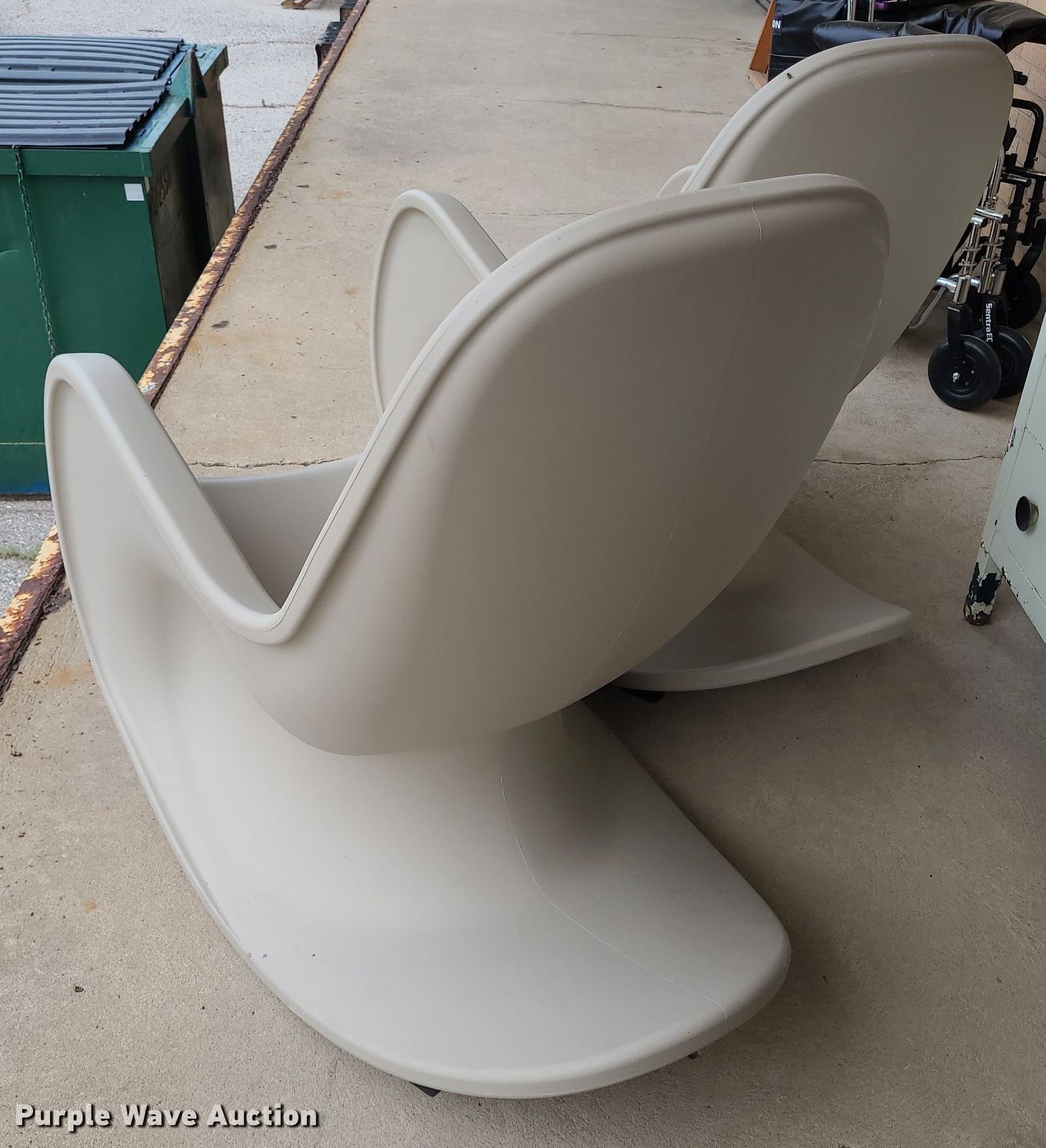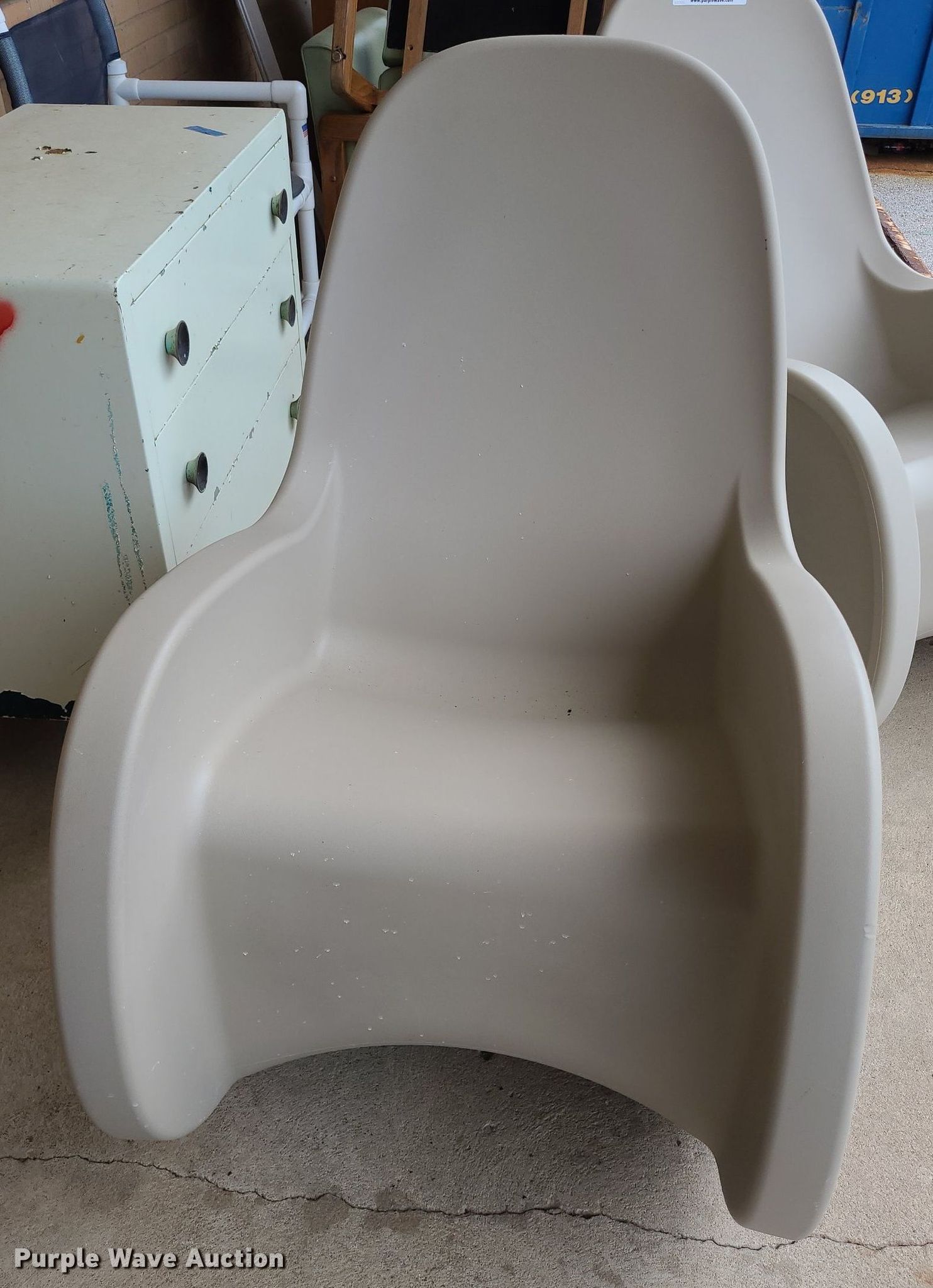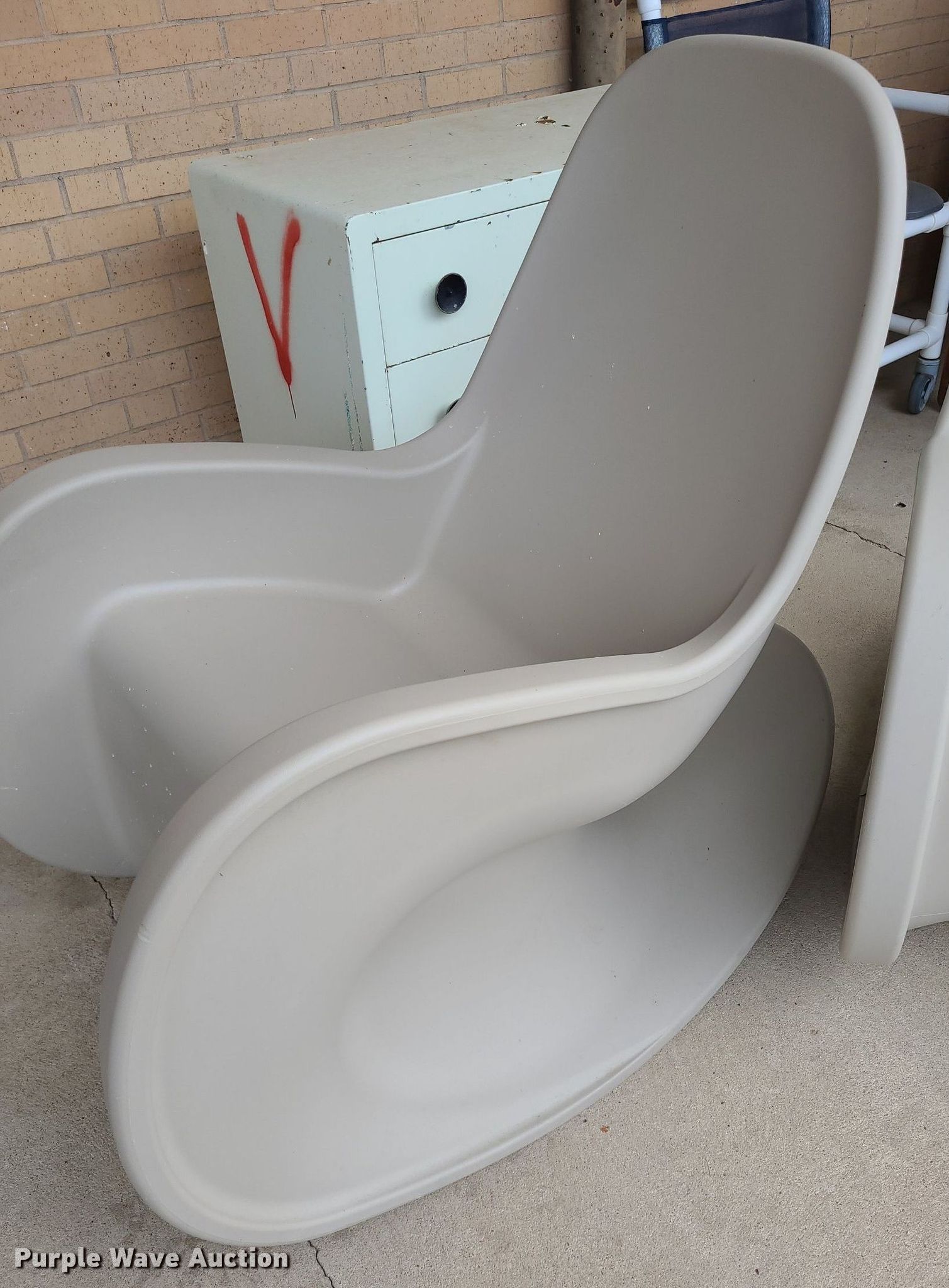 Purple Wave is selling a used Furniture in Kansas. This item is a Furniture with the following: (2) poly rocking chairs, Base cracked, Barber chair