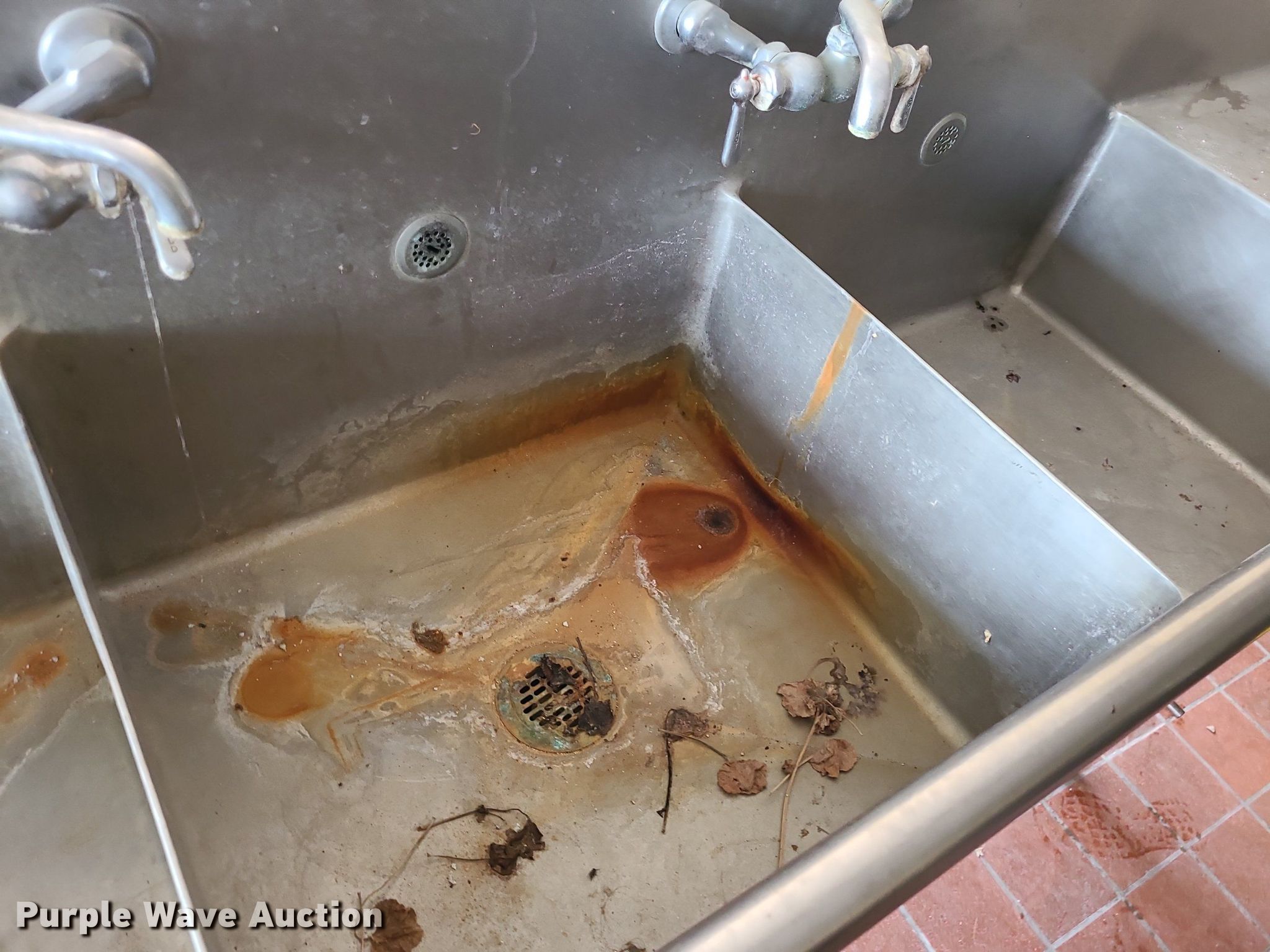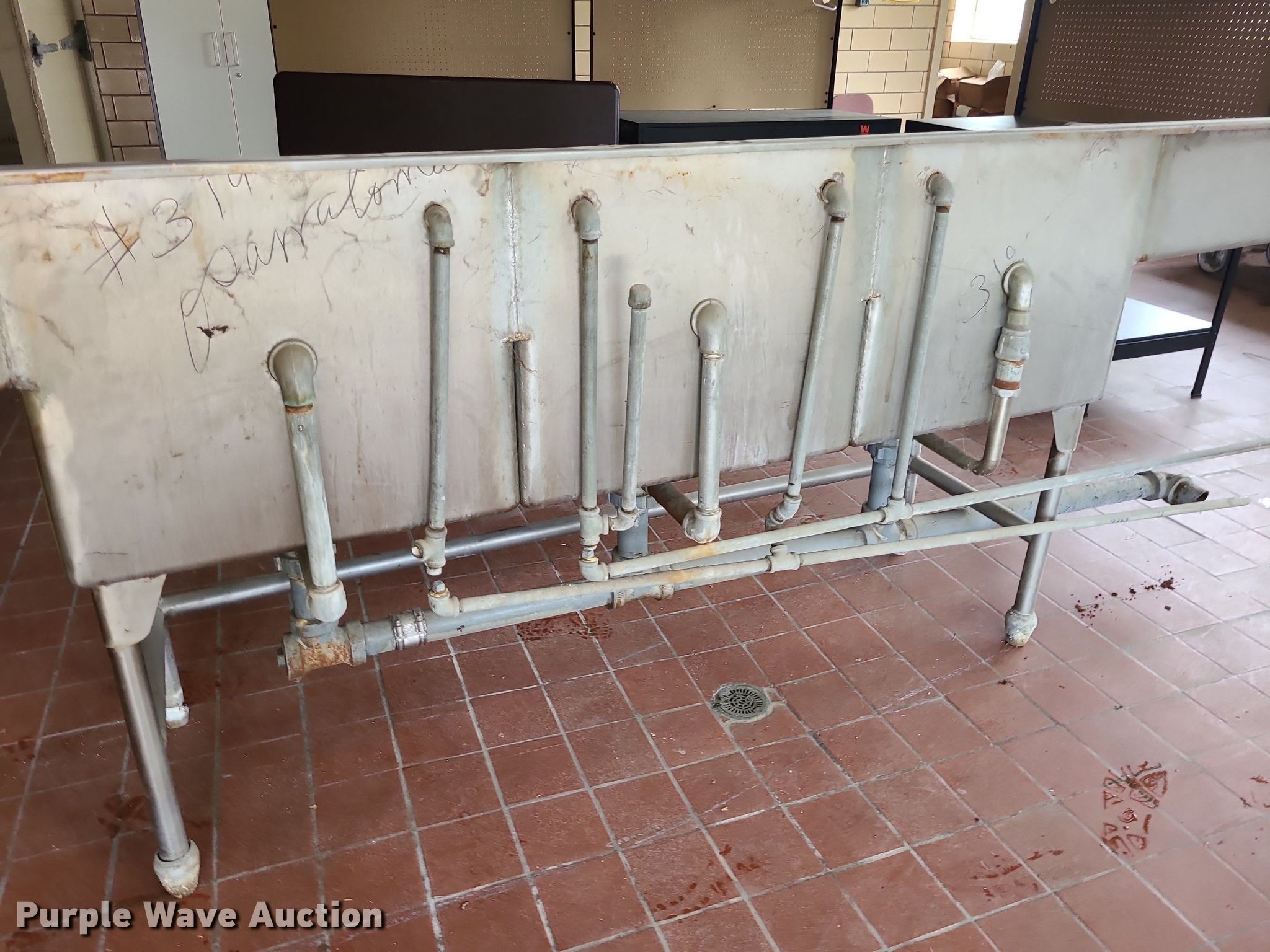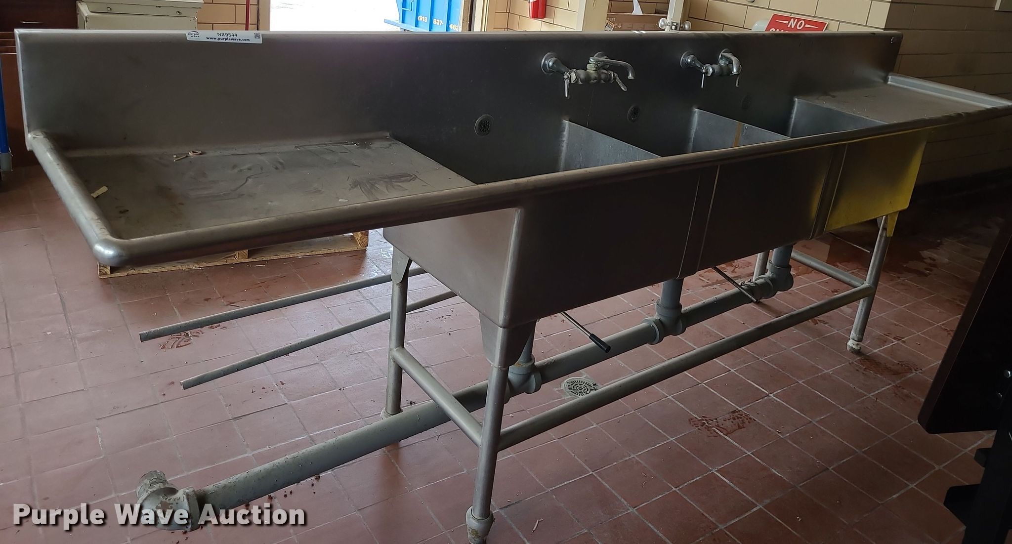 Purple Wave is selling a used Restaurant Equip. in Kansas. This item is a Zahner three basin stainless steel sink with the following: 11' x 2' x 44"
