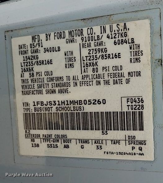 1991 Ford Club Wagon E350 van. Miles: 91,915 on odometer, VIN: 1FBJS31H1MHB05260. Engine Displacement: 5.8L V8 OHV, Cylinders: 8, Fuel type: Gas. Transmission Automatic. Interior Heat, Cruise control. Tires Size: 235/85R16. Notes No battery, Non-operational AC, No rear seats. Kansas title. Title distribution may be delayed up to 14 days from verification of funds. Osawatomie, KS 66064