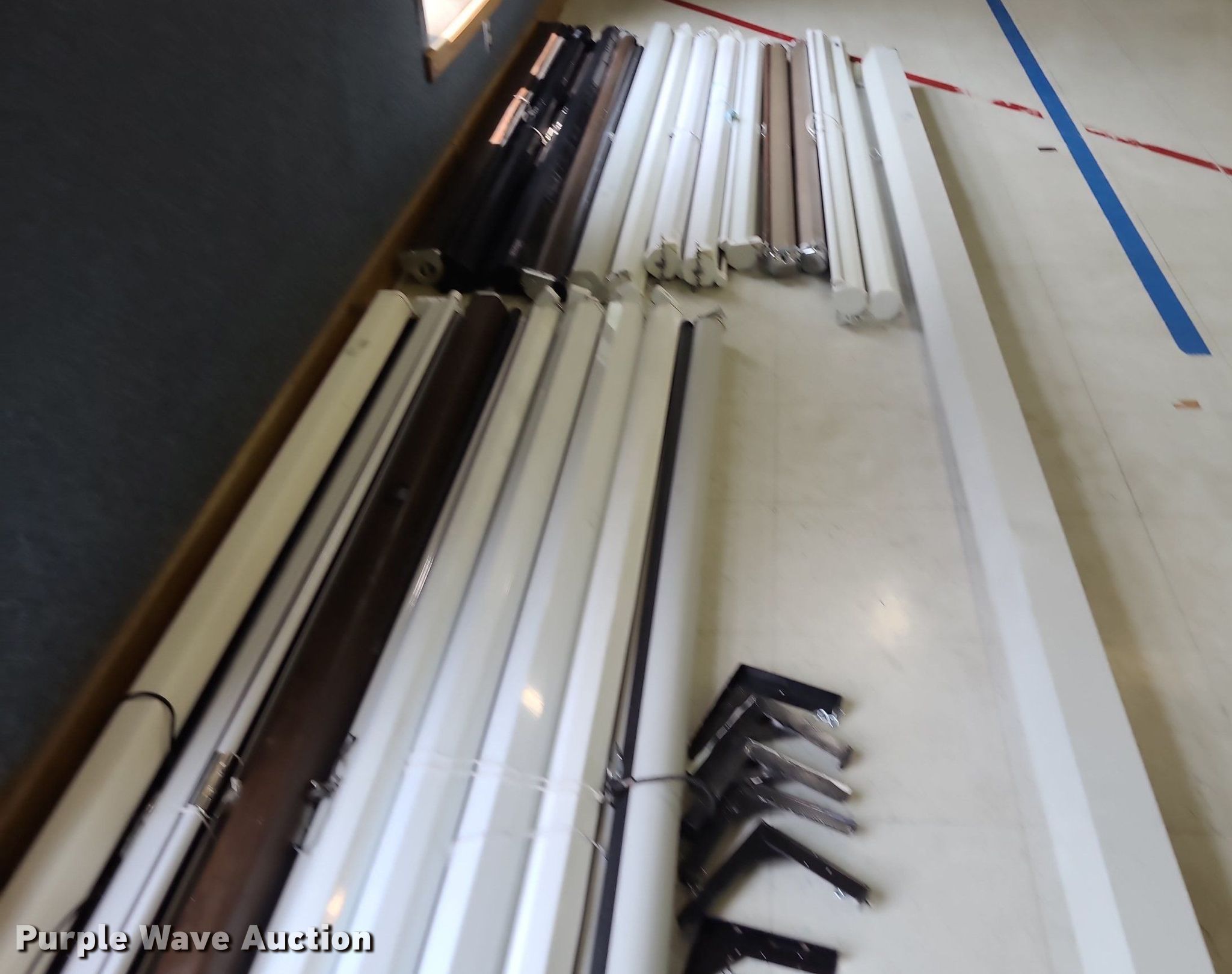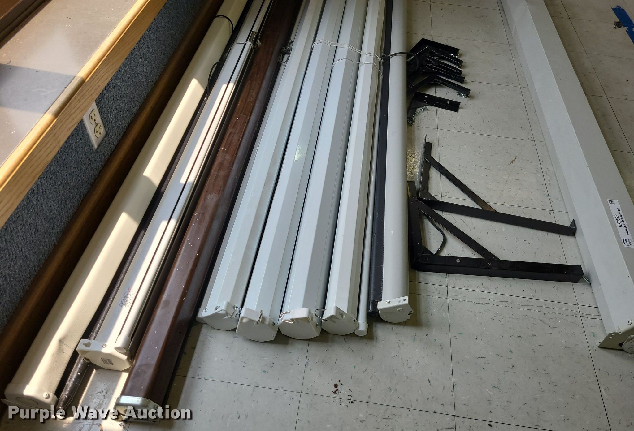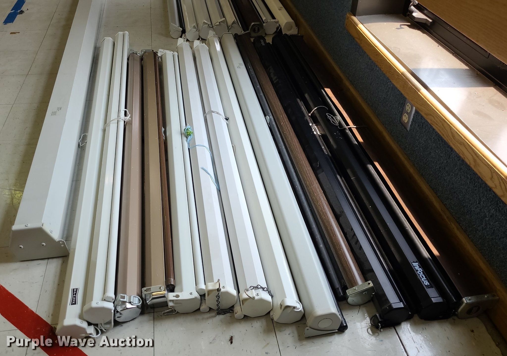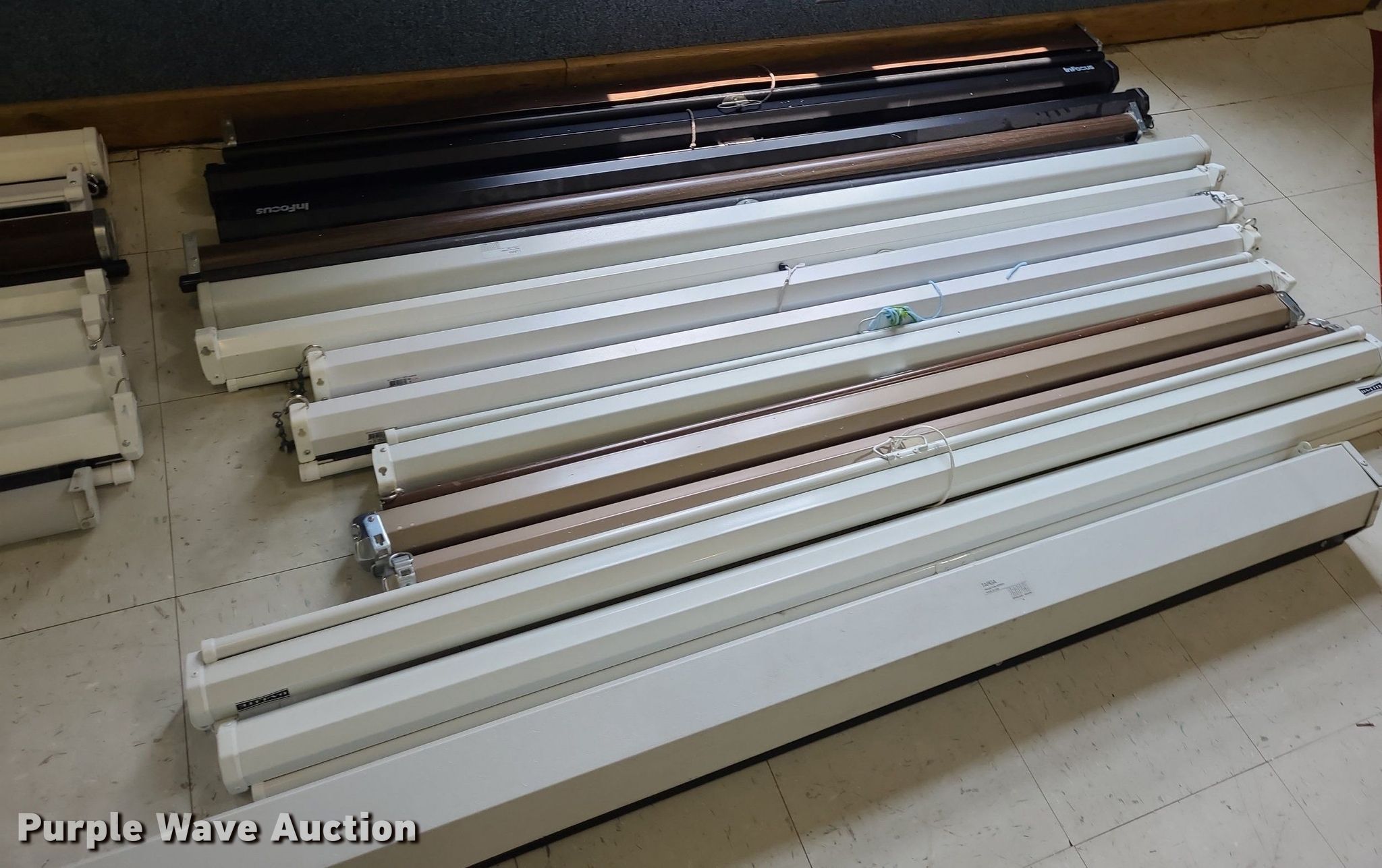 Purple Wave is selling a used Office Supplies and Equip. in Kansas. This item is a (22) projector screens with the following: 12' 7", Electric, (4) 85", (8) 70", (3) 60", (3) 65", (3) 95"