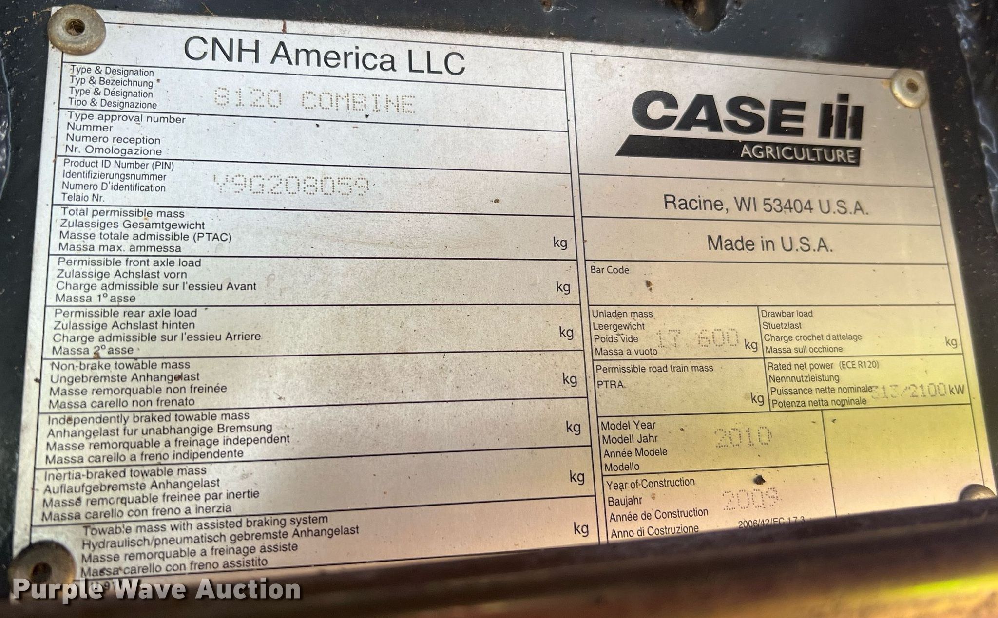 Purple Wave is selling a used Combine in Missouri. This item is a 2010 Case IH 8120 RWA combine with the following: Engine hours: 3,070 on meter, Separator hours: 2,077 on meter, Miles or hours may vary, unit still in use, Serial: Y9G208059