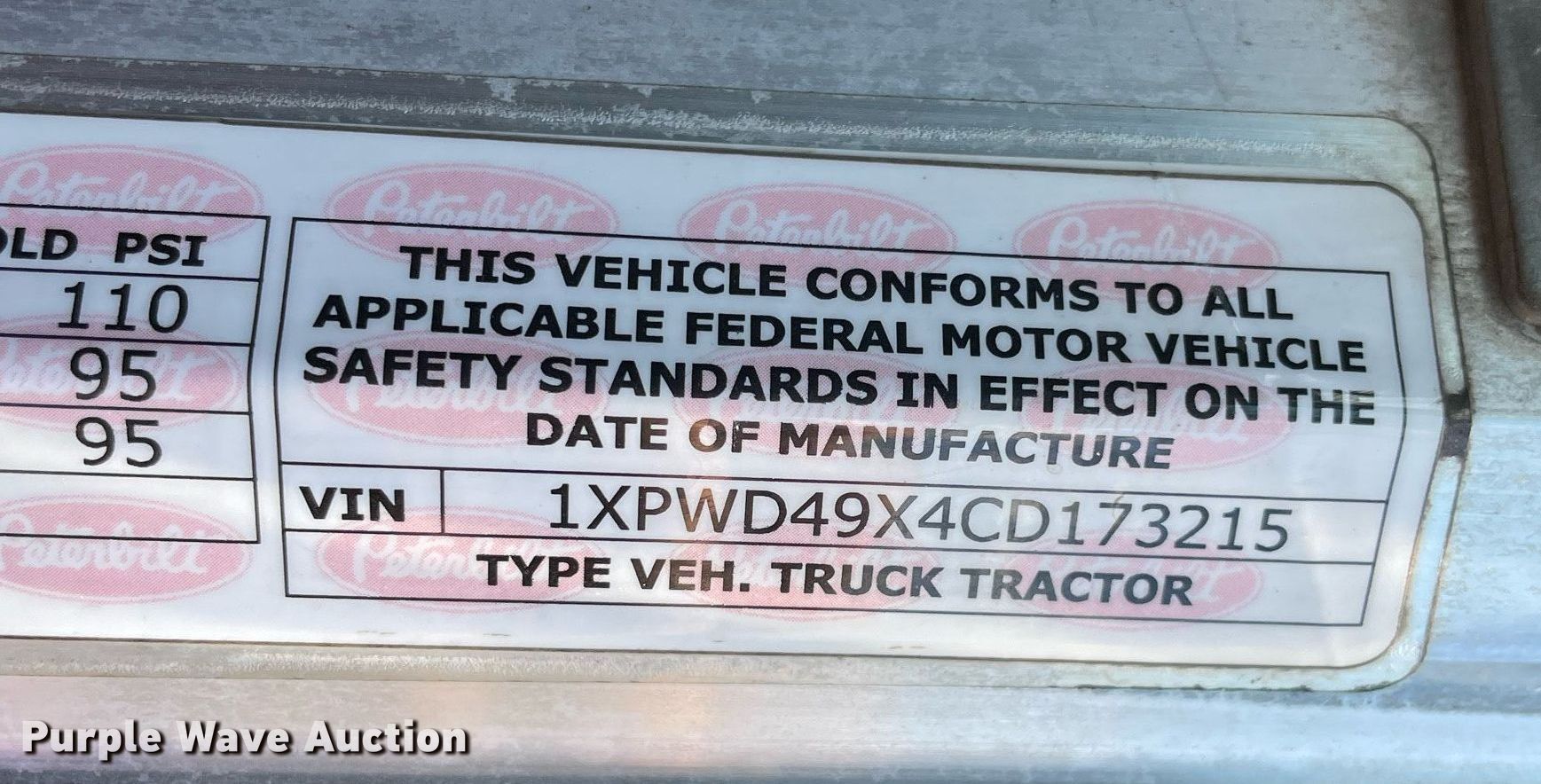 Purple Wave is selling a used Truck Tractor in Oklahoma. This item is a 2012 Peterbilt 388 semi truck with the following: Miles: 734,140 on odometer, Hours: 23,530 on meter, VIN: 1XPWD49X4CD173215