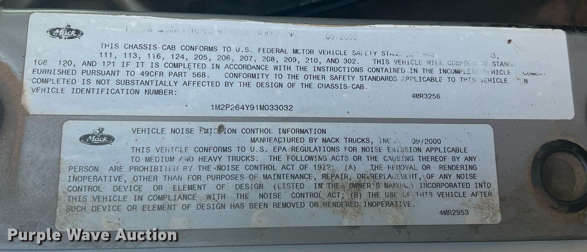 Purple Wave is selling a used Construction Dump Truck in Oklahoma. This item is a 2001 Mack RD690S dump truck with the following: Miles: 224,077 on odometer, Hours: 14,274 on meter, VIN: 1M2P264Y91M033032
