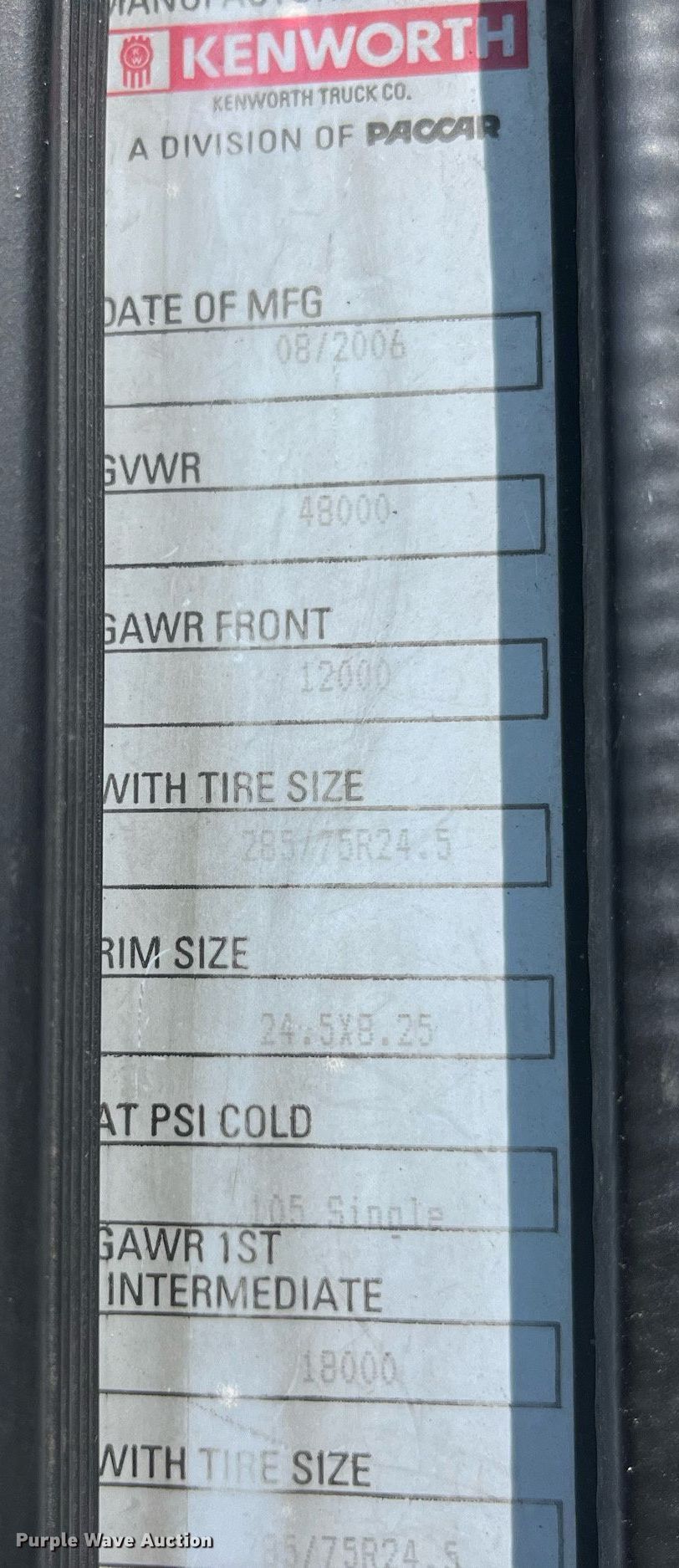 2007 Kenworth T600 semi truck. Miles: 1,263,038 on odometer, Hours: 34,869 on meter, VIN: 1XKADB9X17J146212. Engine Caterpillar C15 Acert, Serial: NXS04544, Displacement: 14.6L, Cylinders: 6, Fuel type: Diesel, Engine brake. Transmission Eaton Fuller, Manual. Chassis Axles: Tandem, Differential lock: Inter-axle, Suspension: Air Dump valves, Brakes: Air, GVWR: 48,000 lbs FAWR: 12,000 lbs, IAWR: 18,000 lbs, RAWR: 18,000 lbs. Interior AC, Heat, Power locks, Cruise control, Air ride cab, Sleeper Sleeper length: 60", Beds: Double bunk, Rear climate control. Features Deck plate: Aluminum, Fifth wheel type: Air operated, Sliding, Fuel tank: Dual. Tires Front: 275/80R22.5, Rear: 295/75R22.5. Notes Windshield chipped or cracked. Missouri title. Title distribution may be delayed up to 14 days from verification of funds. 22894 Missouri 5. Linneus, MO 64653