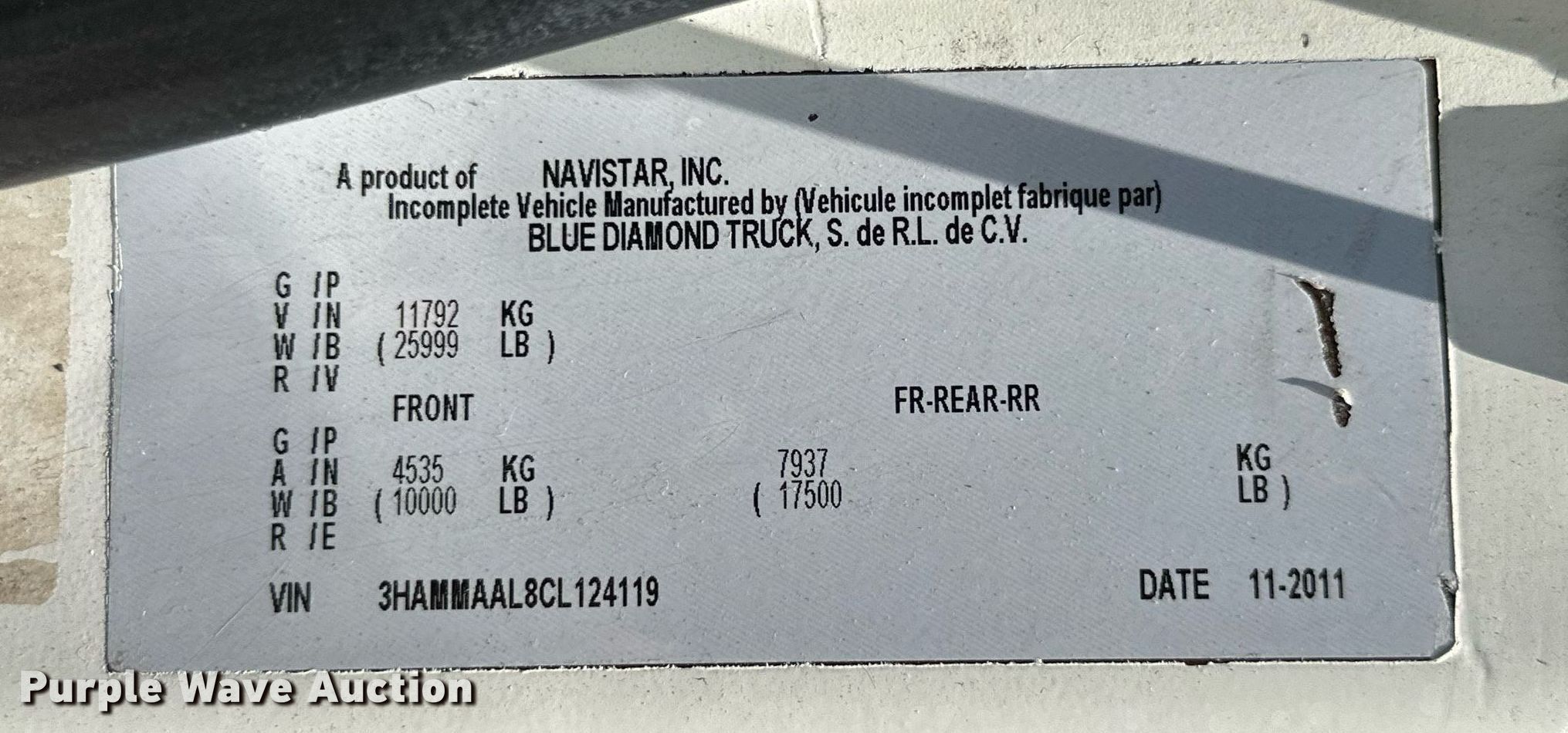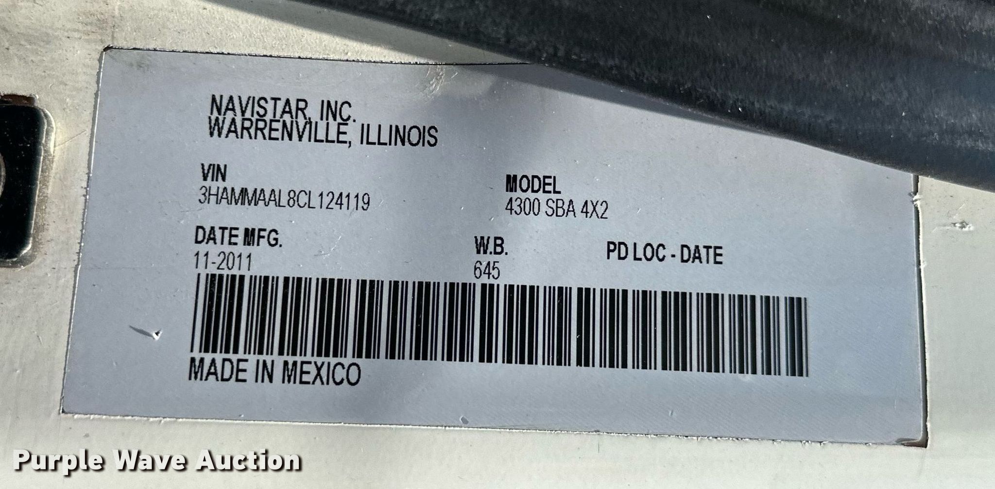 2012 International DuraStar 4300 box truck. Miles: 148,125 on odometer, VIN: 3HAMMAAL8CL124119. Engine International MaxxForce DT, Displacement: 7.6L, Cylinders: 6, Fuel type: Diesel. Transmission Automatic. Chassis Axles: Single, Suspension: Spring, Brakes: Air, GVWR: 25,999 lbs. Interior AC, Heat, Cruise control. Features Box bed 24' L x 96" W x 96" H, Floor: Wood, End gate lift. Tires Size: 275/80R22.5. Notes Exhaust system modified. Oklahoma title. Title distribution may be delayed up to 14 days from verification of funds. 13780 E 146th St N. Collinsville, OK 74021