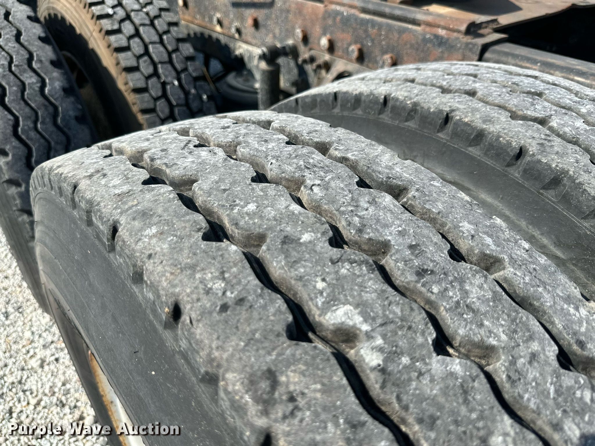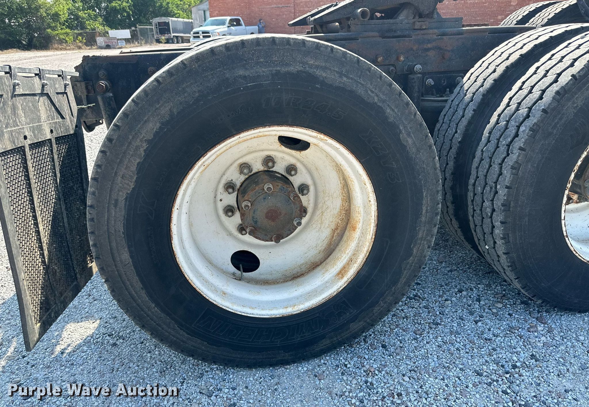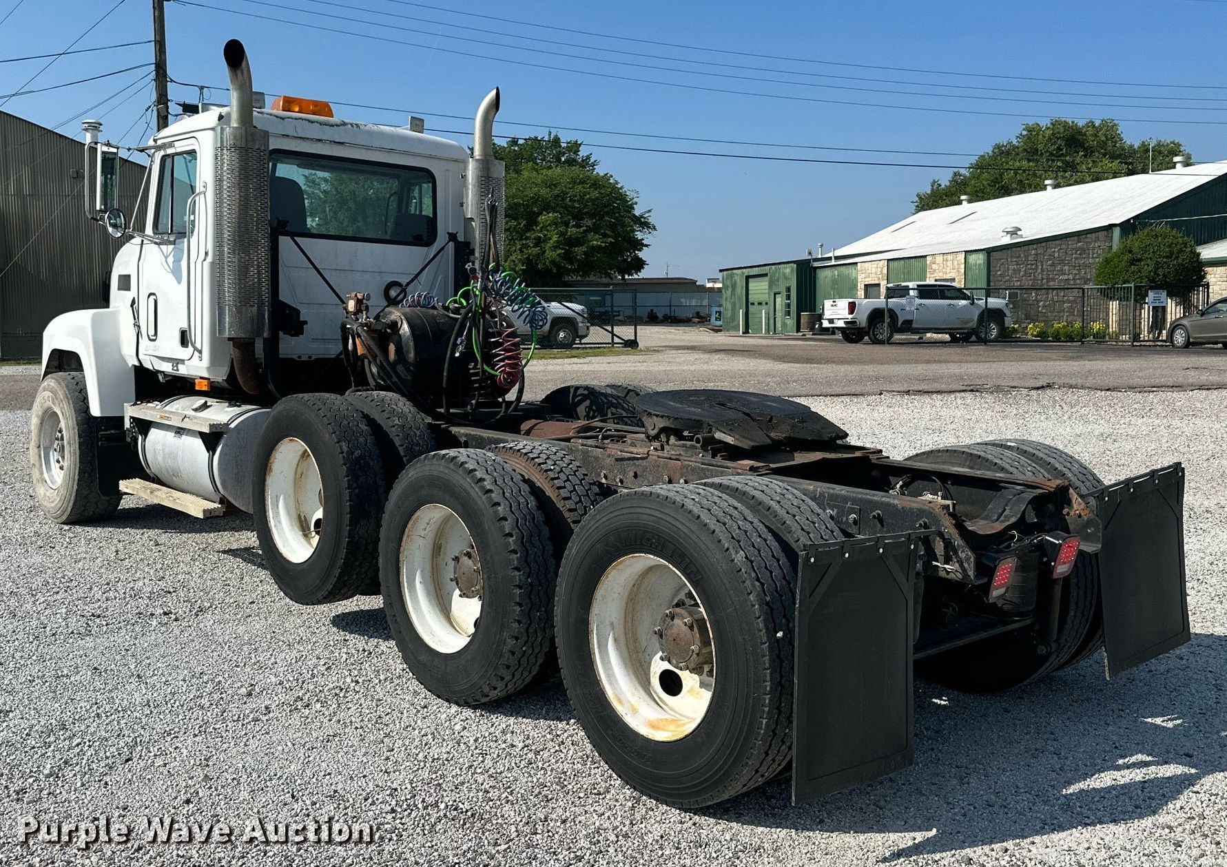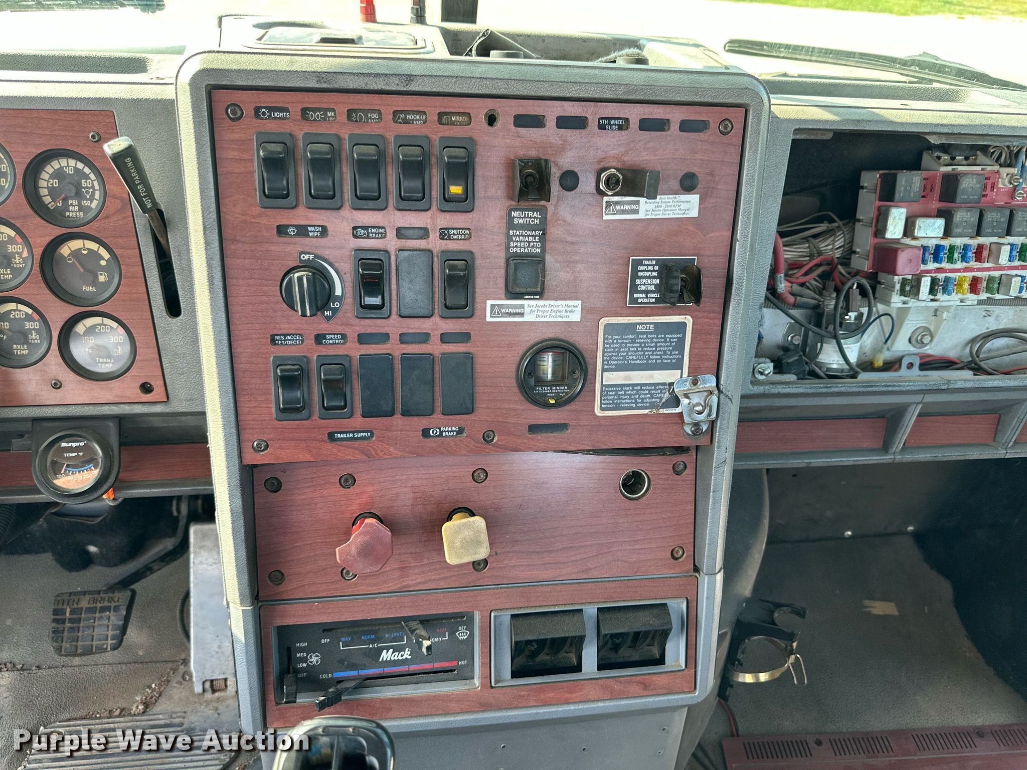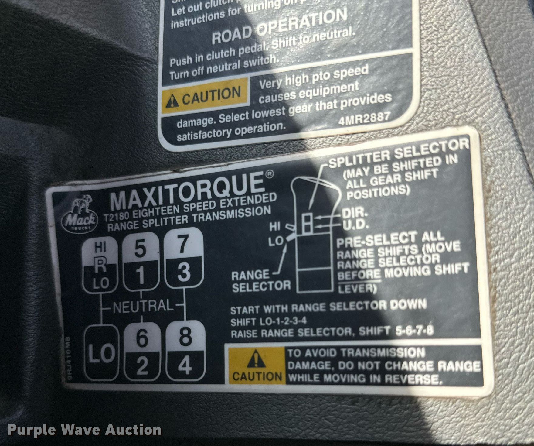 1997 Mack CH613 semi truck. Miles: 321,071 on odometer, Hours: 12,253 on meter, VIN: 1M2AA18Y9VW074213. Engine Mack, Displacement: 12.0L , Cylinders: 6, Fuel type: Diesel, Engine brake. Transmission Mack Maxitorque, Manual, Speed: 18. Chassis Axles: Triple, Pusher axle, Suspension: Air, Brakes: Air, PTO, Wet kit. Interior AC, Heat, Heated mirrors, Cruise control, Air ride cab. Features Fifth wheel type: Air operated, Sliding, Fuel tank: Dual, Double frame. Tires Front: 425/65R22.5, Rear: 11R24.5, Lift axle: 11R24.5. Notes Fifth wheel air line has been cut. Oklahoma title. Title distribution may be delayed up to 14 days from verification of funds. C3 Construction. 205 East Cottage Street. Ada, OK 74820