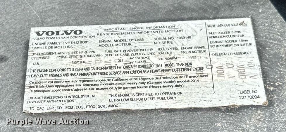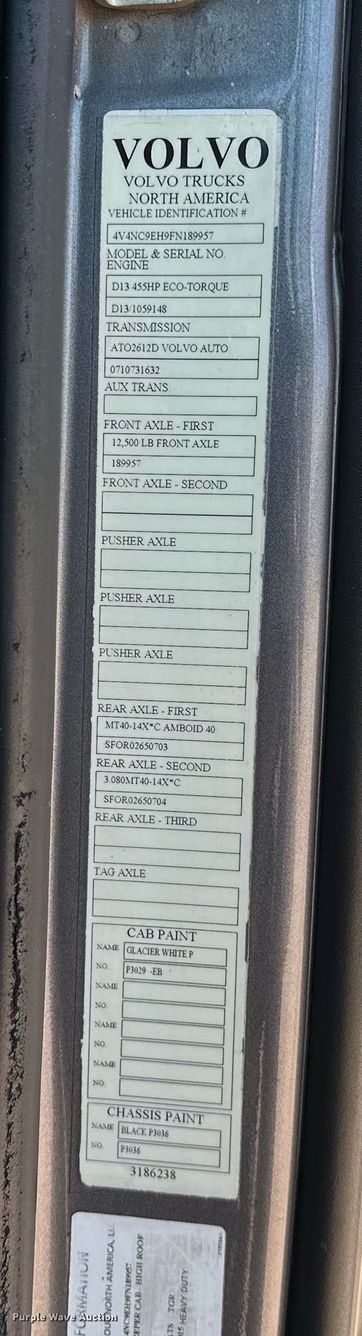 2015 Volvo VNL semi truck. Miles: 583,301 on odometer, VIN: 4V4NC9EH9FN189957. Engine Volvo D13J455, Serial: 1059148, Displacement: 12.8L, Cylinders: 6, Fuel type: Diesel, Engine brake. Transmission Volvo, Automatic. Chassis Axles: Tandem, Differential lock: Inter-axel, Suspension: Air Dump valves, Brakes: Air, GVWR: 50,500 lbs FAWR: 12,500 lbs, RAWR: 19,000 lbs. Interior AC, Heat, Heated mirrors, Power windows, Power locks, Cruise control , Air ride cab, Sleeper Sleeper length: 84", Beds: Double bunk, Refrigerator. Features Deck plate: Aluminum, Fifth wheel type: Air operated, Sliding, Fuel tank: Dual. Tires Size: 295/75R22.5. Notes Windshield chipped or cracked. Texas title. Title distribution may be delayed up to 14 days from verification of funds. 2005 North 10th Street. Enid, OK 73701
