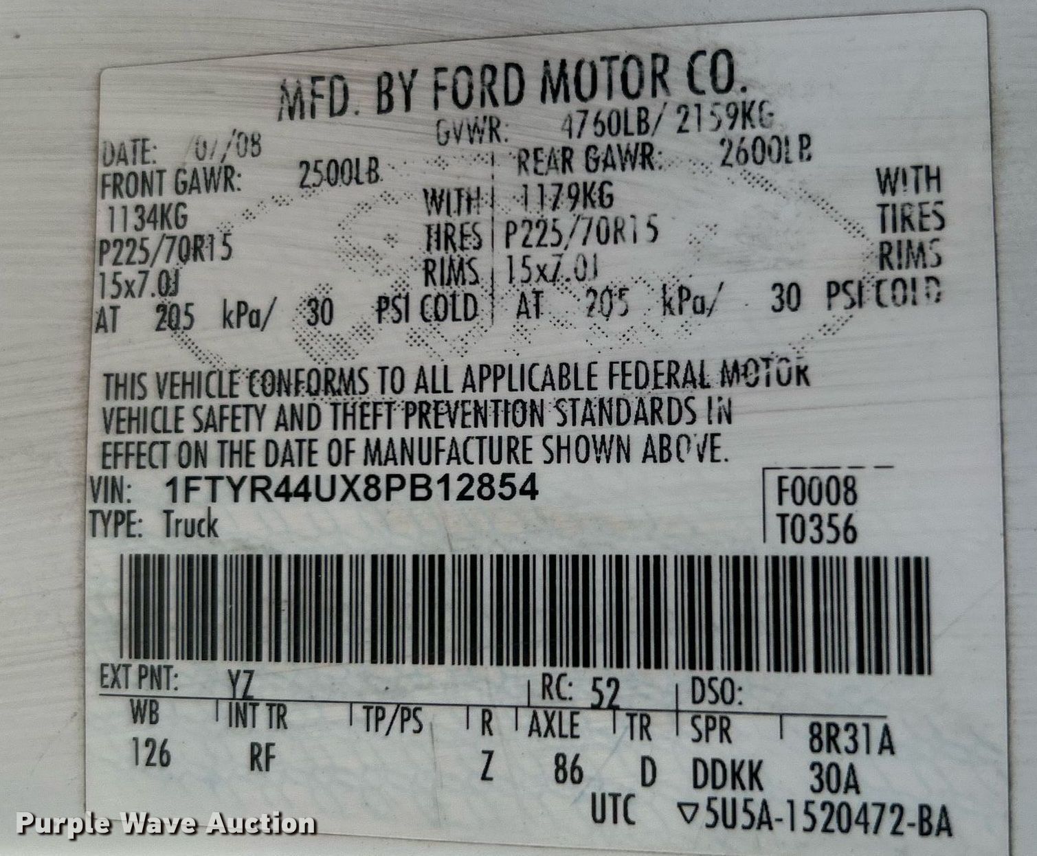 2008 Ford Ranger SuperCab pickup truck. Miles: 161,216 on odometer, VIN: 1FTYR44UX8PB12854, Unit #: 202055. Engine Displacement: 3.0L V6 OHV, Cylinders: 6, Fuel type: Gas. Transmission Automatic. Interior AC, Heat, Cruise control. Tires Size: 225/70R15. Oklahoma title. Title distribution may be delayed up to 14 days from verification of funds. TLS Group, Inc.. 1326 West 37th Place. Tulsa, OK 74107