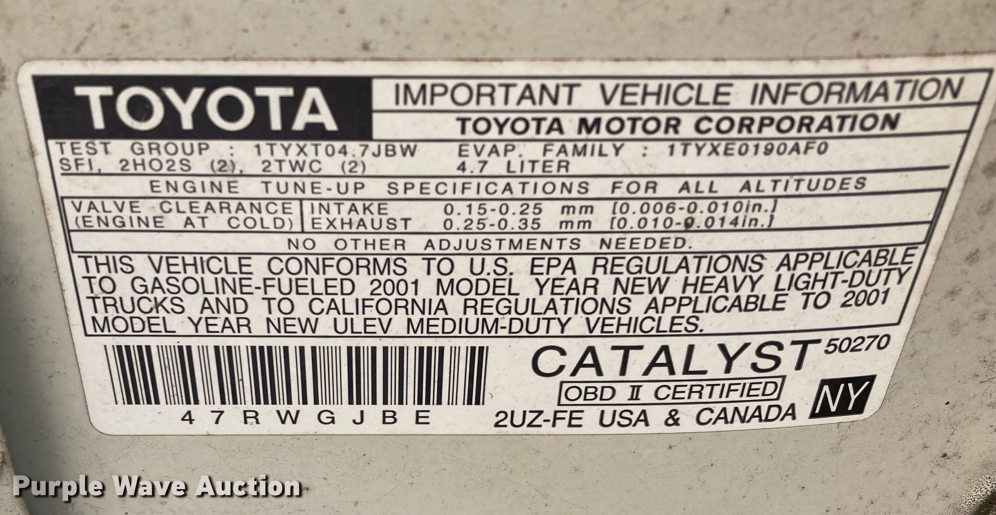 Take a look at this used 2001 Toyota Sequoia SUV being sold on July 19th, 2023 in the SOLD! July 19 Vehicles and Equipment Auction made by Toyota. Take a look at all of the item information below or take a look at similar auctions for Passenger Vehicles.