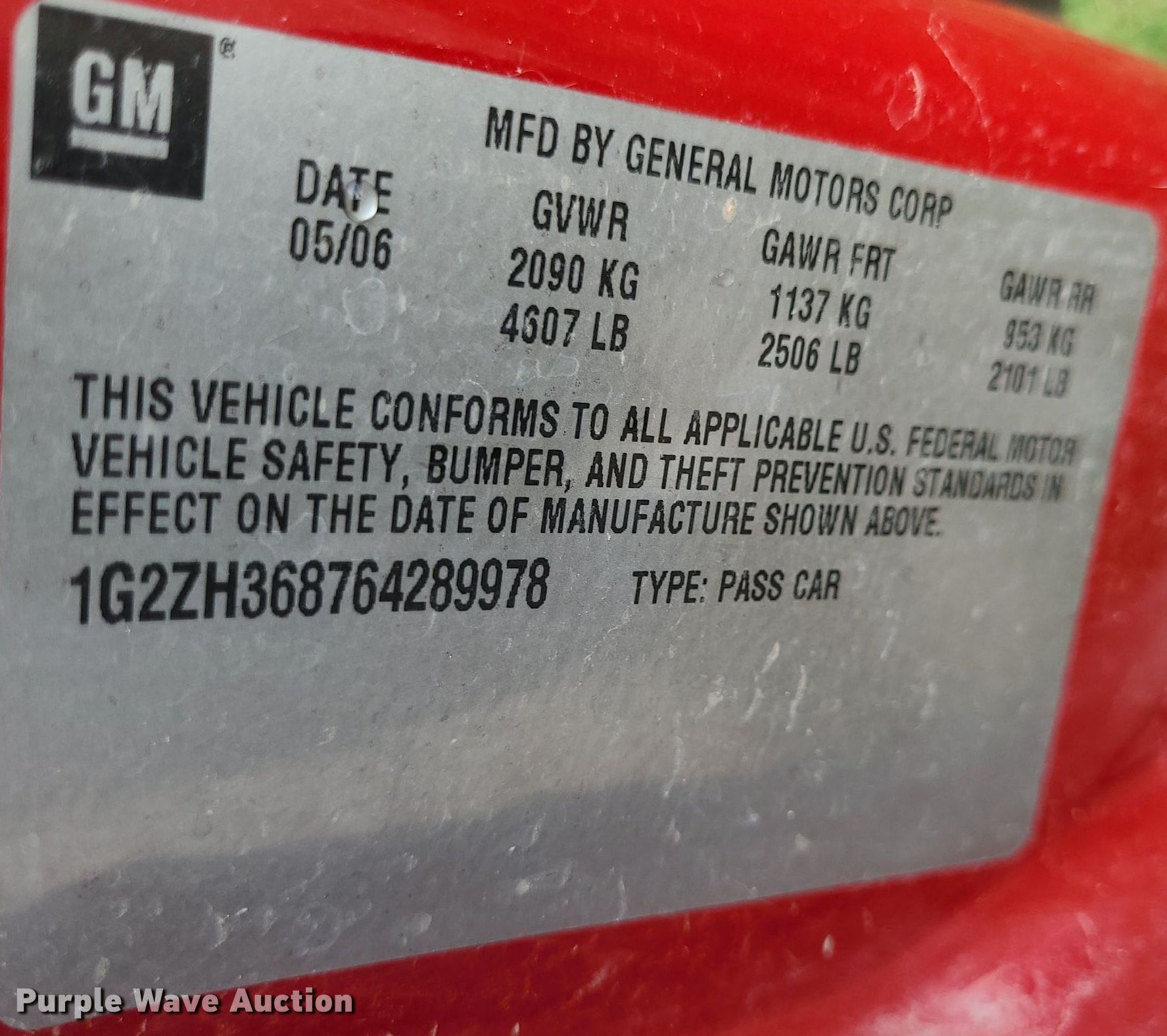 2006 Pontiac G6 GT convertible. Miles: 77,850 on odometer, VIN: 1G2ZH368764289978. Engine Displacement: 3.5L V6 OHV, Cylinders: 6, Fuel type: Gas. Transmission Automatic. Interior AC, Heat, Seat: Heated, Power driver, Power windows, Power locks, Cruise control. Tires Size: 225/50R18. View repairs. Kansas title. Virgina Allen Estate. Onaga, KS 66521