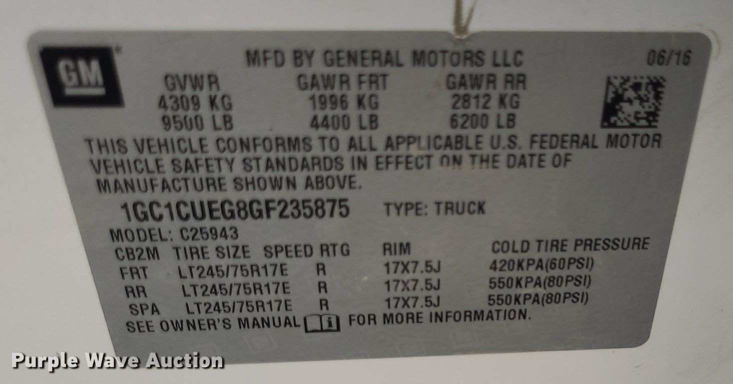 2016 Chevrolet Silverado 2500HD Crew Cab pickup truck. Miles: 146,466 on odometer, VIN: 1GC1CUEG8GF235875. Engine Displacement: 6.0L V8 OHV, Cylinders: 8, Fuel type: Gas. Transmission Automatic. Interior AC, Heat, Power windows, Power locks, Cruise control. Tires Size: 285/70R17. Notes Dash warning indicator: Check engine. Kansas title. Title distribution may be delayed up to 14 days from verification of funds. Hiawatha, KS 66434
