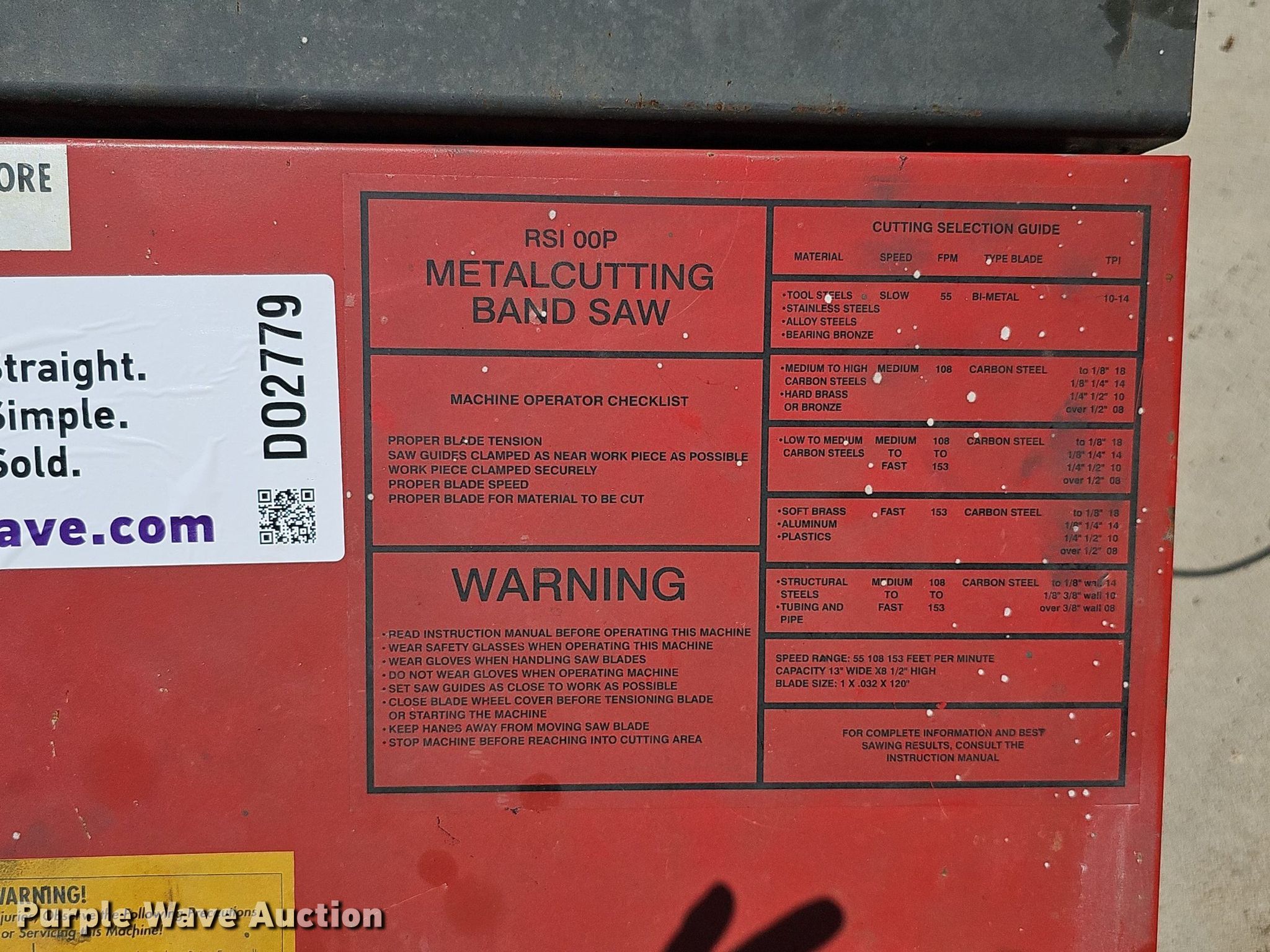 Purple Wave is selling a used Machine Shop Tools and Equip. in Nebraska. This item is a Ramco RS100P bandsaw with the following: Serial: 12124