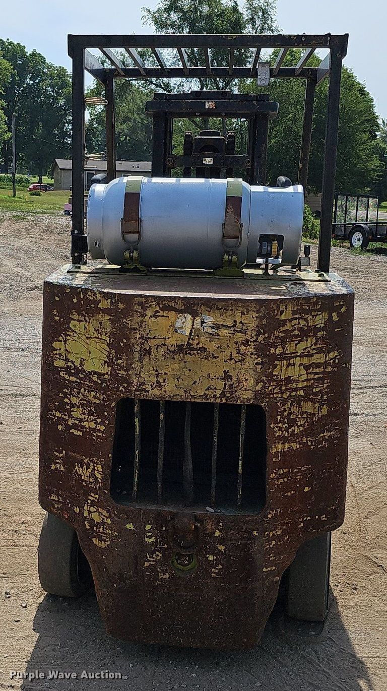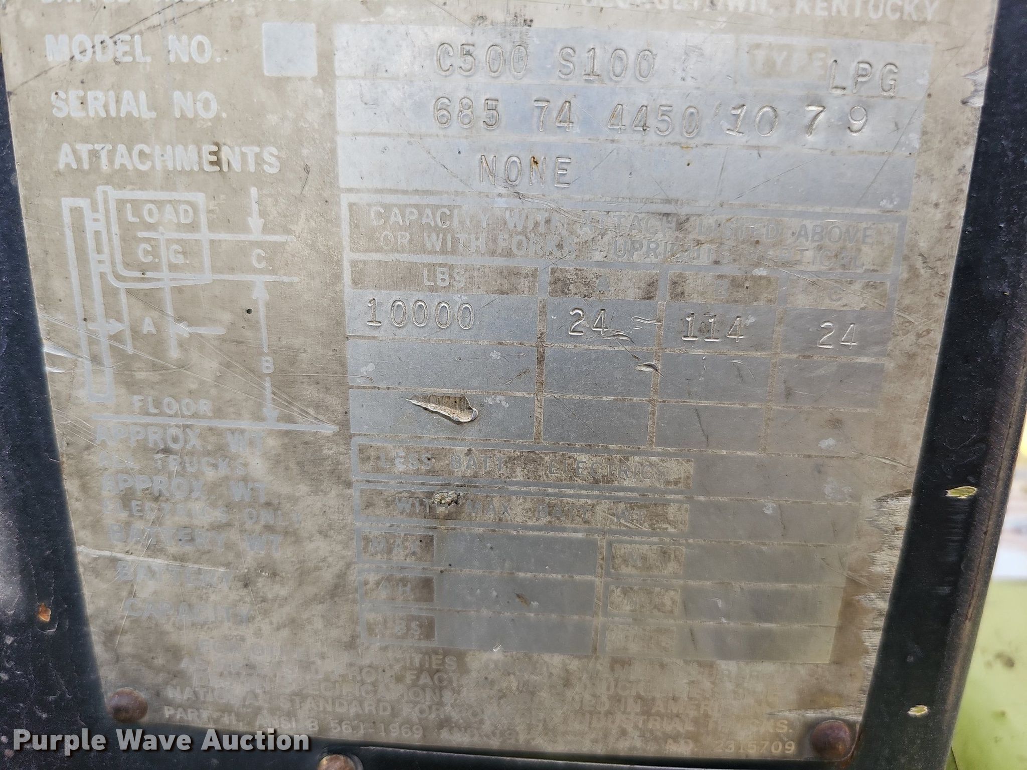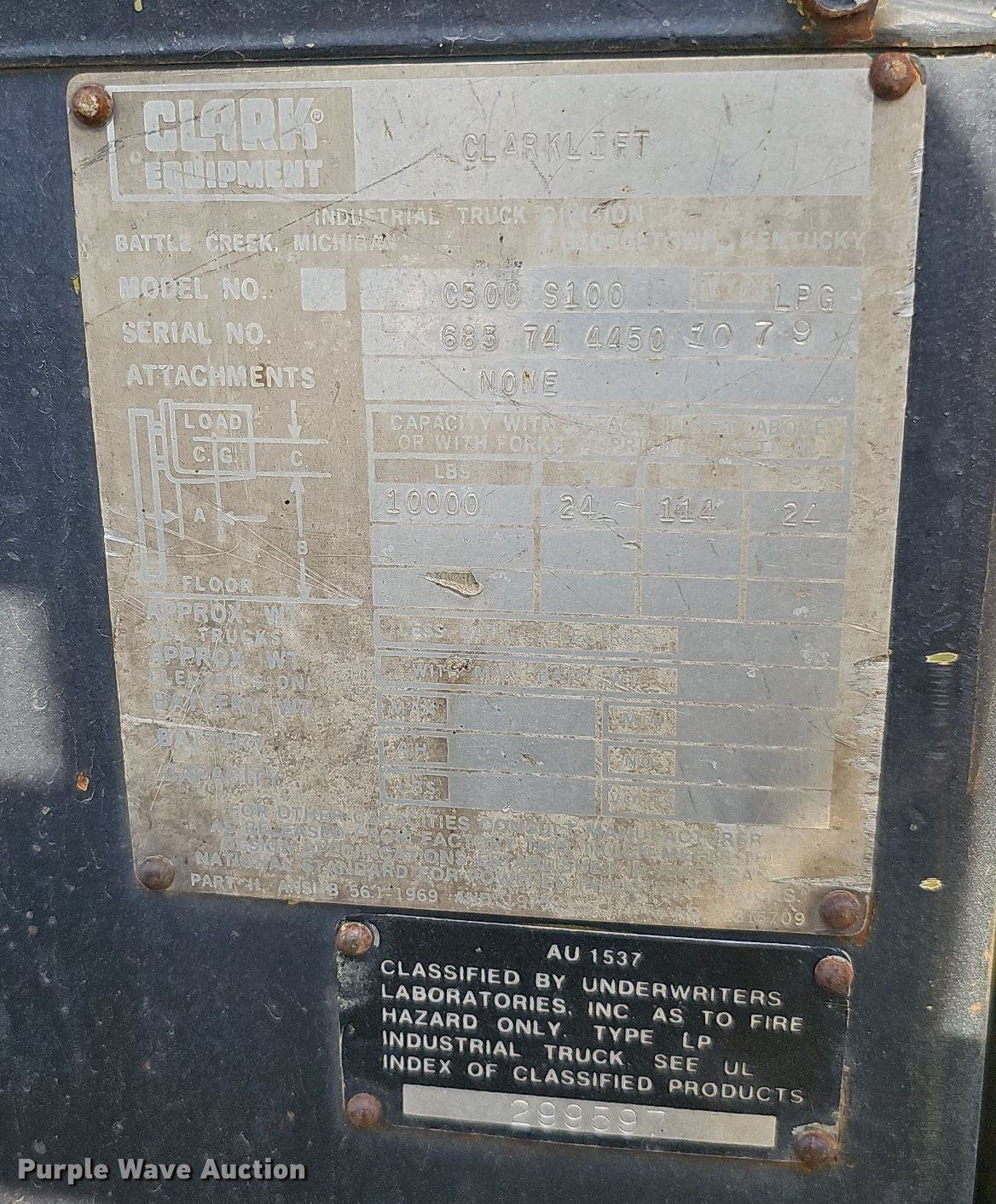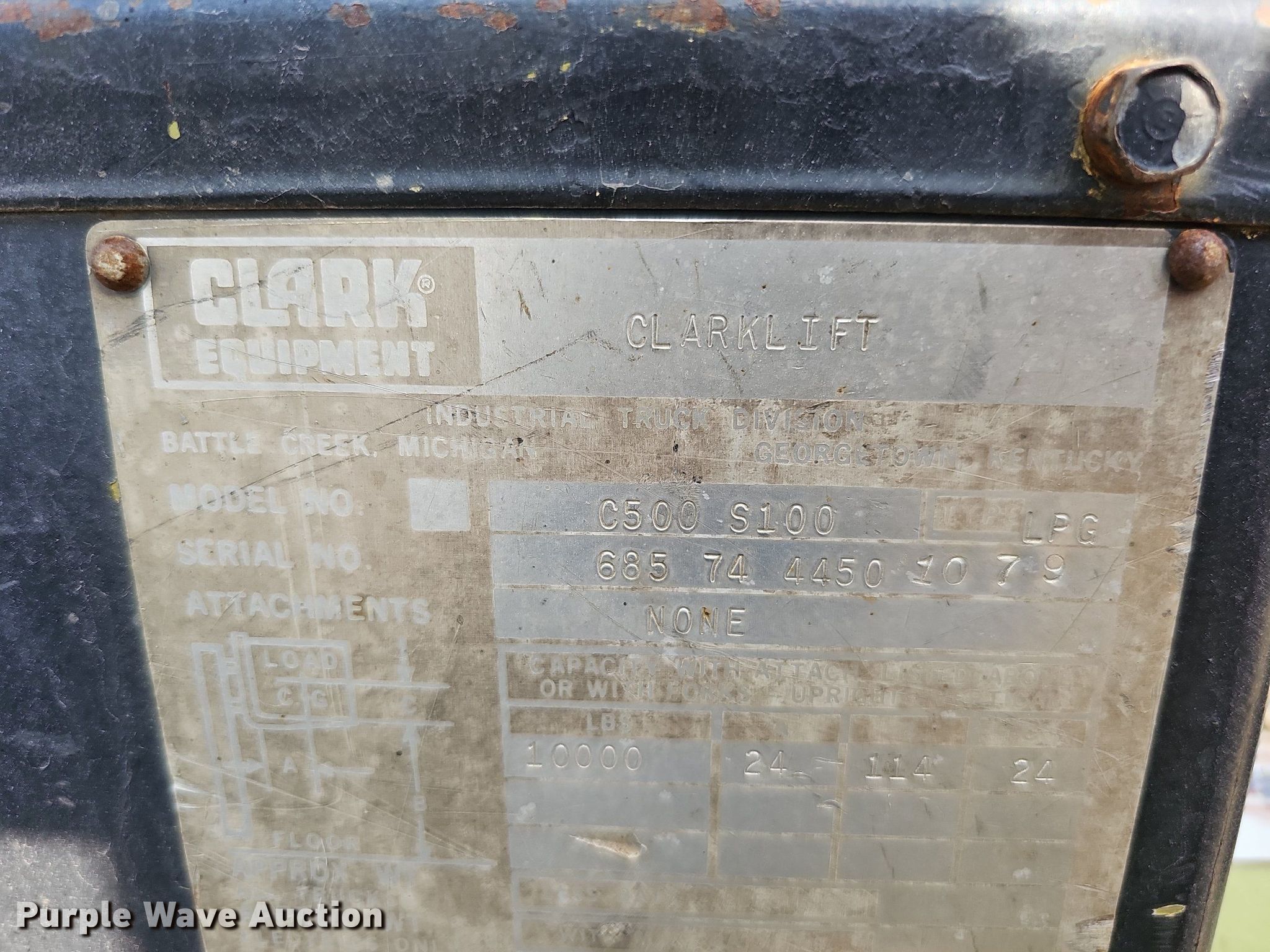 Clark C500-S100 forklift. Hours: 3,872 on meter, Serial: 6857444501079. Engine Cylinders: 6, Fuel type: LPG LP bottle: Included. Transmission Powershift. Operators station Canopy. Features Maximum lift capacity: 10,000 lbs, Maximum lift height: 114", Mast stages: 2, Mast tilt, Fork length: 47". Tires Front: 21x6x15, Rear: 17x6x12.125, Solid. 107 East Virginia Street. Highland, KS 66035