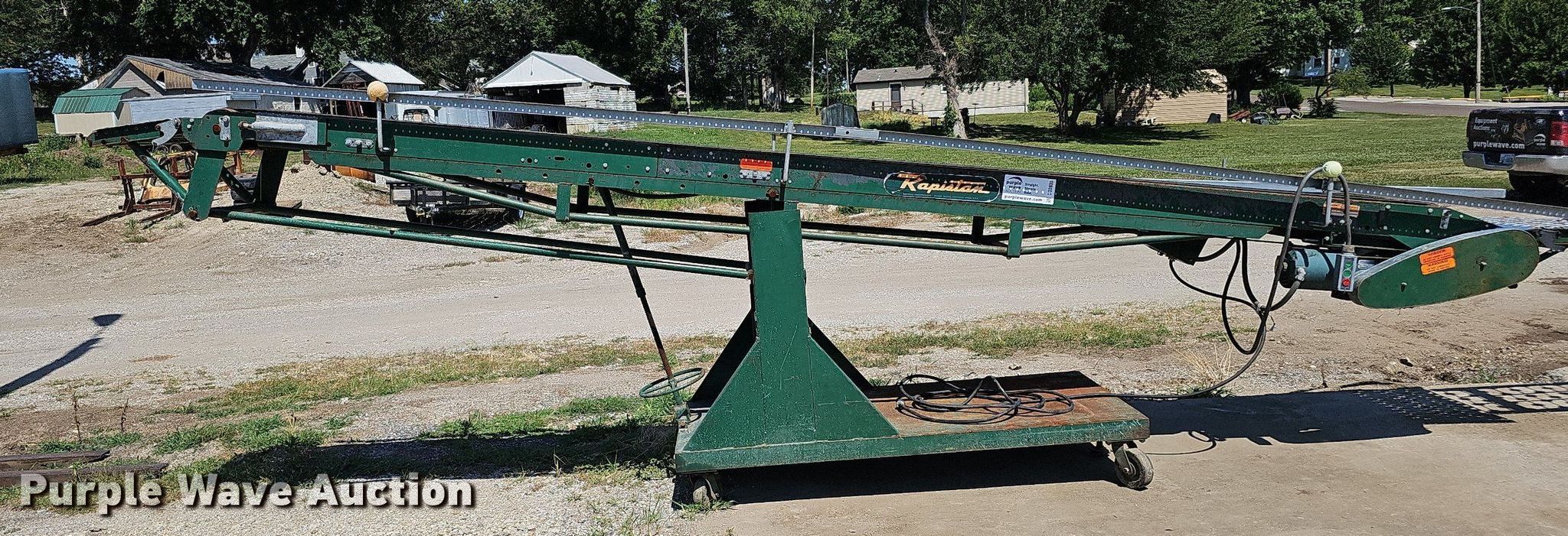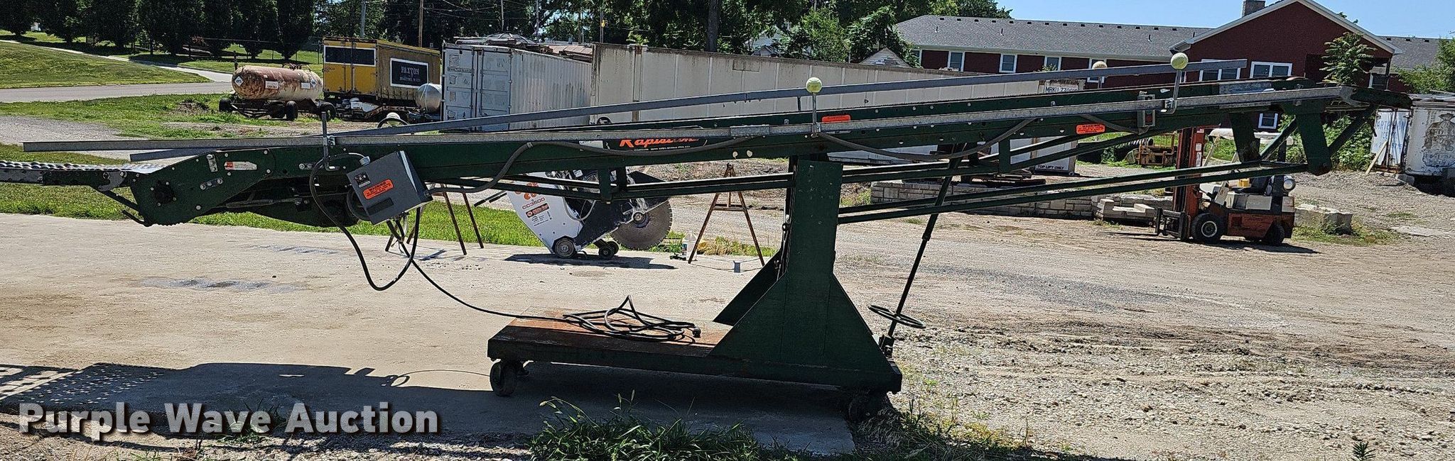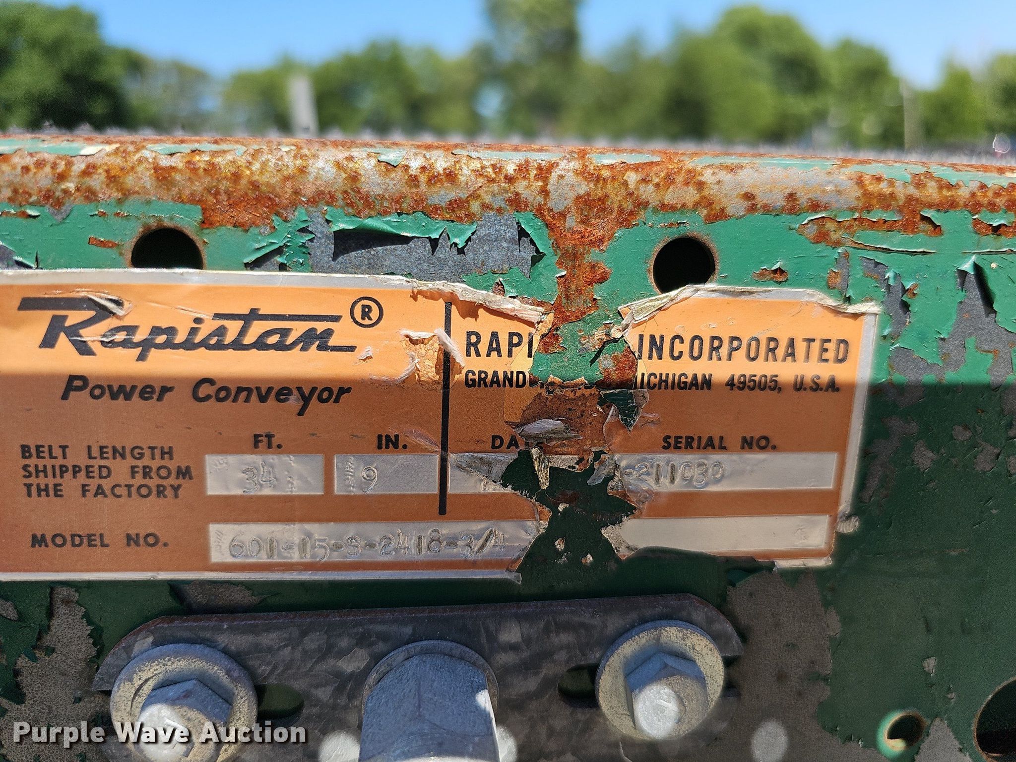 Purple Wave is selling a used Tools in Kansas. This item is a Rapistan 601-15-S-2418-3/4 box conveyor system with the following: Reliance electric motor, Volts: 115/230, Phase: Single, HP: 3/4, Hz: 60, Rapistan electric gear motor, HP: 0.77, Size: R56W616B, 34'9"L x 18"W belt, 18'L roller table, (4) 10'L x 18"W roller tables, Serial: 211030