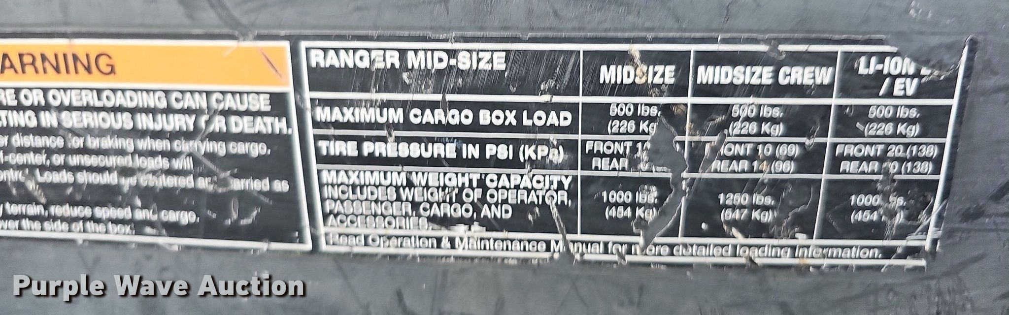 2018 Polaris Ranger 500 utility vehicle. Miles: 3,240 on odometer, Hours: 819 on meter, VIN: 3NSRMA505JE361547. Engine Displacement: 500cc, Cylinders: 1, Fuel type: Gas, Electric start. Transmission Automatic. Chassis Four wheel drive. Operators station EROPS, Passengers: 2. Features Grill guard, Receiver hitch, Dump bed 37" L x 51" W, Dump bed type: Manual. Tires Front: 25x8.00-12, Rear: 25x10.00-12. Nebraska title. Title distribution may be delayed up to 14 days from verification of funds. Neuvirth Construction. 3400 Old Mormon Bridge Rd. Crescent, IA 51526