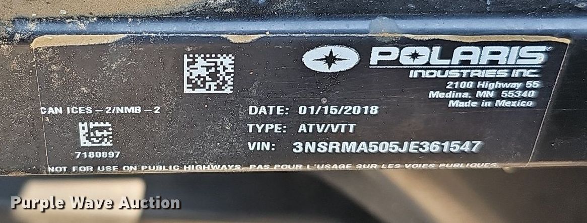 Purple Wave is selling a used Utility Vehicle in Iowa. This item is a 2018 Polaris Ranger 500 utility vehicle with the following: Miles: 3,240 on odometer, Hours: 819 on meter, VIN: 3NSRMA505JE361547