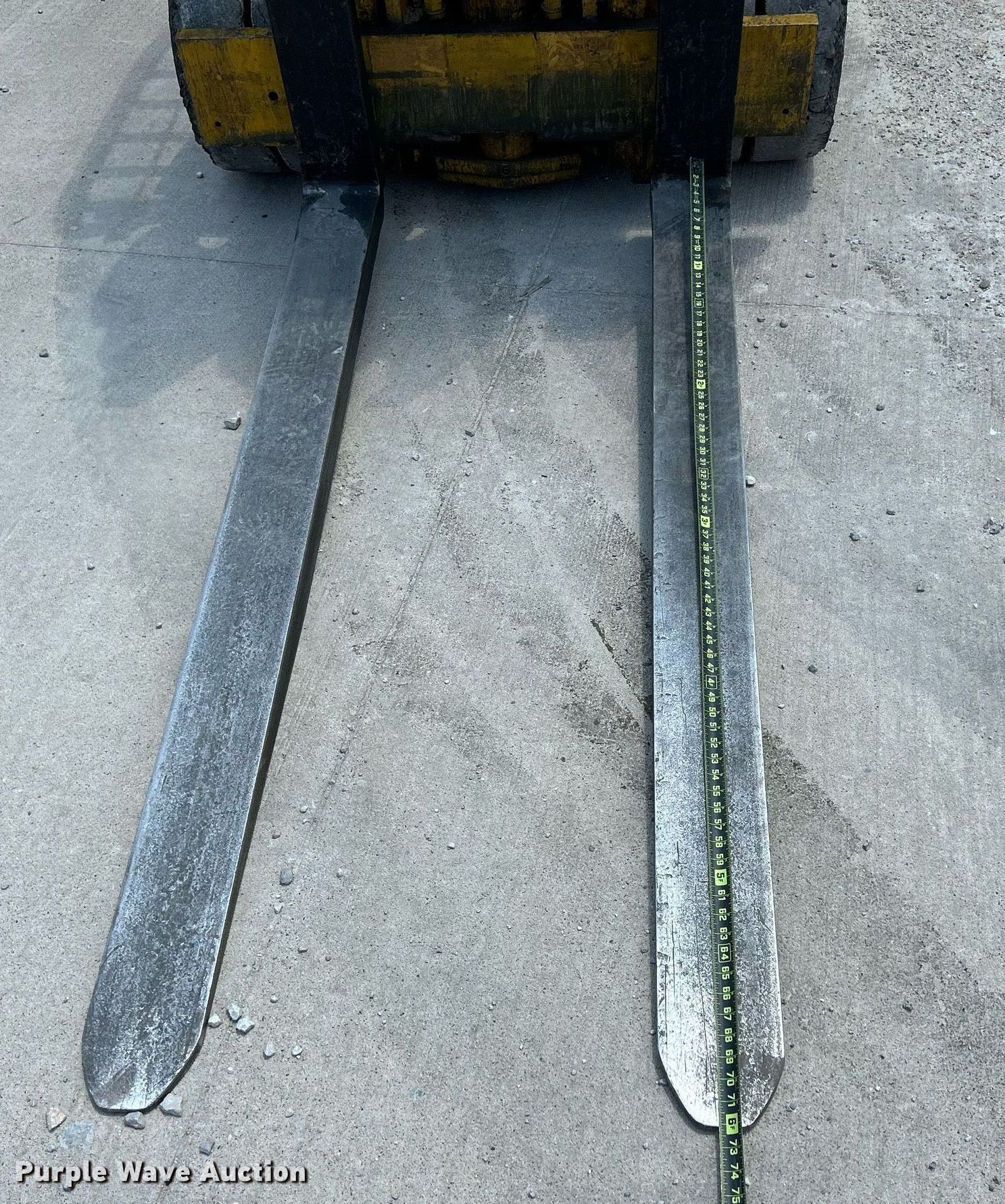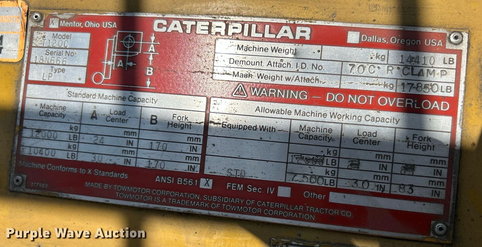 Caterpillar T120C forklift. Hours: 4,502 on meter, Serial: 18N666. Engine Caterpillar, Cylinders: 6, Fuel type: LPG LP bottle: Not included. Transmission Hydrostatic. Operators station Canopy. Features Maximum lift capacity: 12,000 lbs, Maximum lift height: 170", Mast stages: 2, Mast tilt, Fork length: 72". Tires Front: 22X4X16, Rear: 18X7X12 1/8, Solid. Quality Equipment. 1415 W Washington St. Mount Pleasant, IA 52641