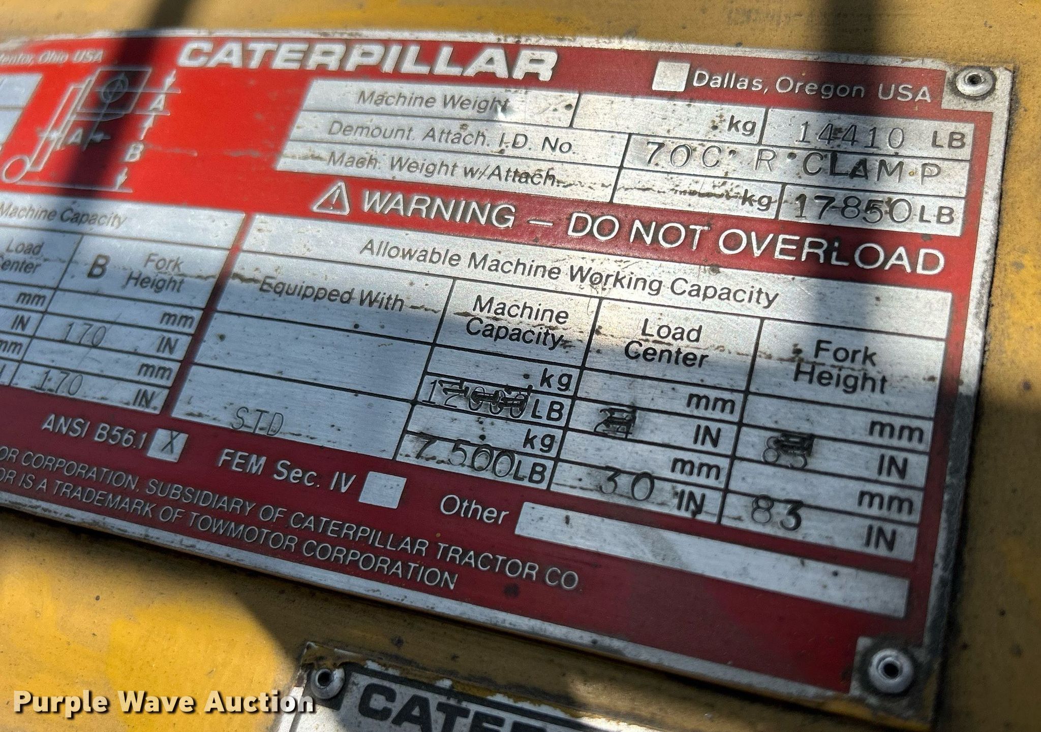 Purple Wave is selling a used Warehouse Forklift in Iowa. This item is a Caterpillar T120C forklift with the following: Hours: 4,502 on meter, Serial: 18N666
