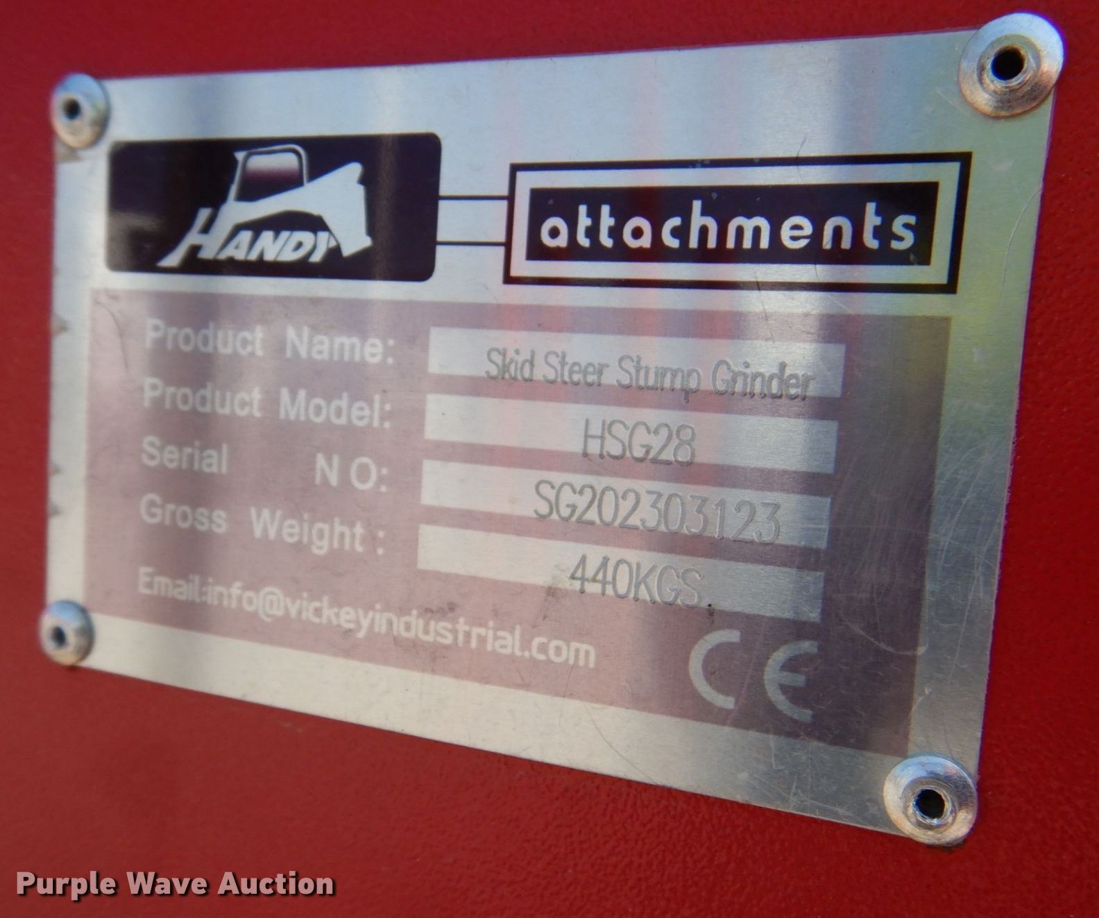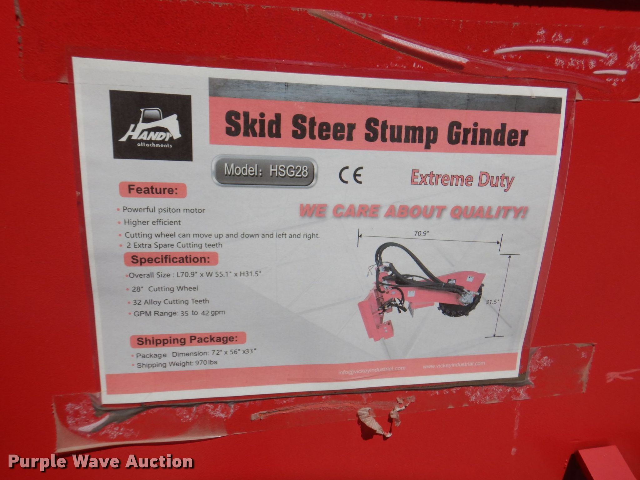 2023 Handy HSG28 skid steer stump grinder. Serial: SG202303123. Features Cutting head: 4"W x 28" diameter Bolt-on teeth, Boom length: 60", Remote. Notes Unused. Jordan Machinery / S & N Auto Sales. 25050 US Hwy 275. Waterloo, NE 68069