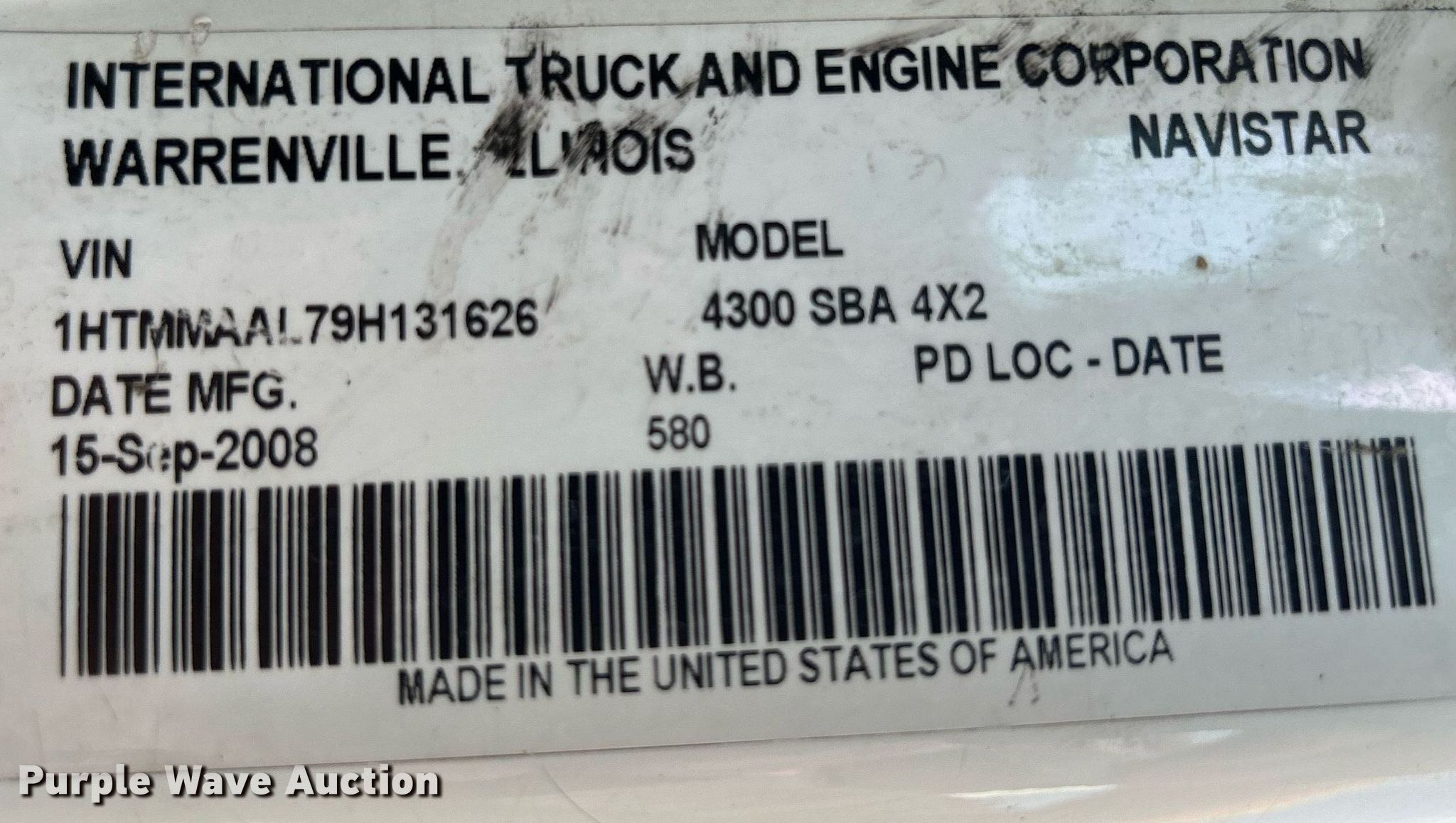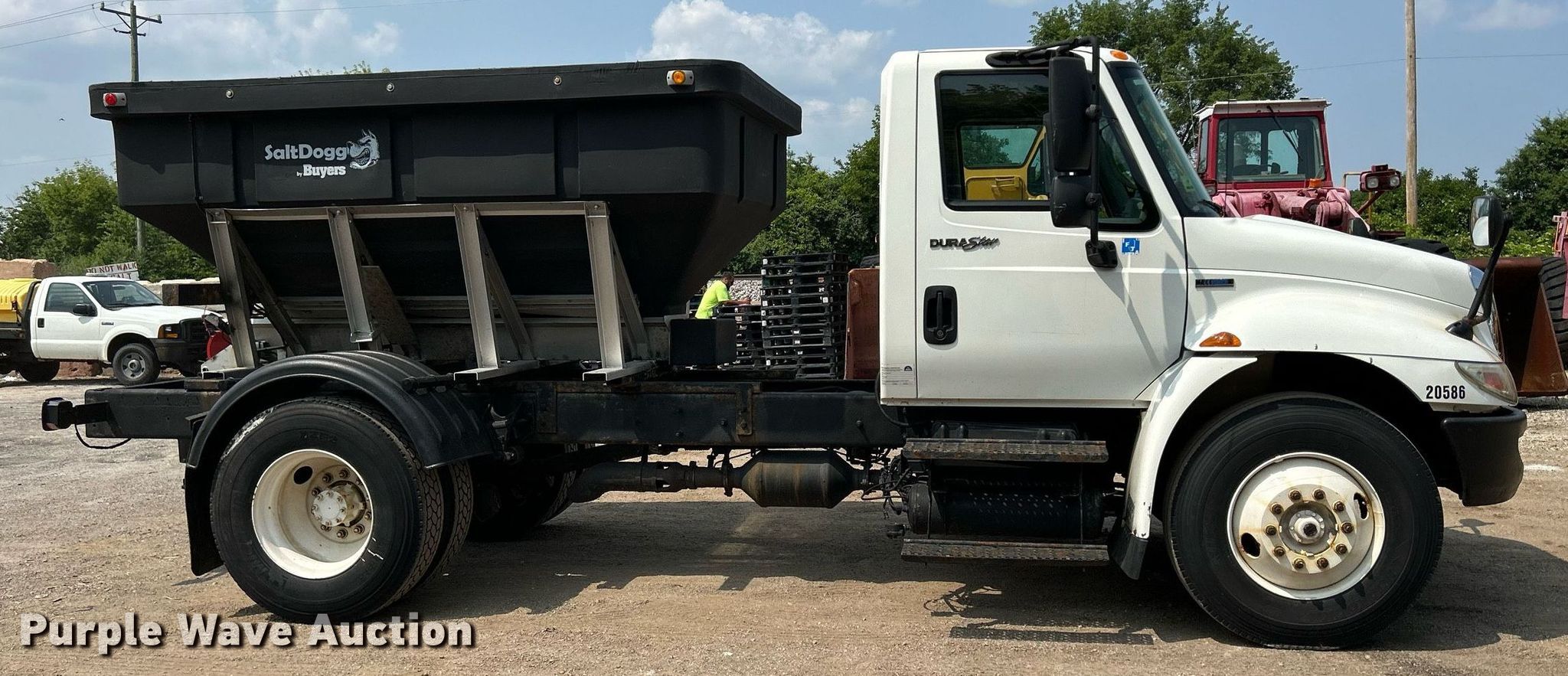 2009 International DuraStar 4300 spreader truck. Miles: 107,911 on odometer, VIN: 1HTMMAAL79H131626, Unit #: 1001. Engine International MaxxForce DT, Displacement: 7.6L, Cylinders: 6, Fuel type: Diesel. Transmission Automatic. Chassis Axles: Single, Suspension: Spring, Brakes: Air, Wheelbase: 168". Interior AC, Heat, Heated mirrors, Power windows, Power locks, Cruise control. Features Spreader SaltDogg , 10' L x 6' W, Bed vibrator. Tires Size: 11R22.5. Pursuant to Illinois law, Purple Wave will not be collecting sales taxes on any of the purchases made in this business liquidation auction... Illinois title. Title distribution may be delayed up to 14 days from verification of funds. Snow Management Equipment Auction - Open inspection July 12 and 18. 31W377 Spaulding Road. Elgin, IL 60120
