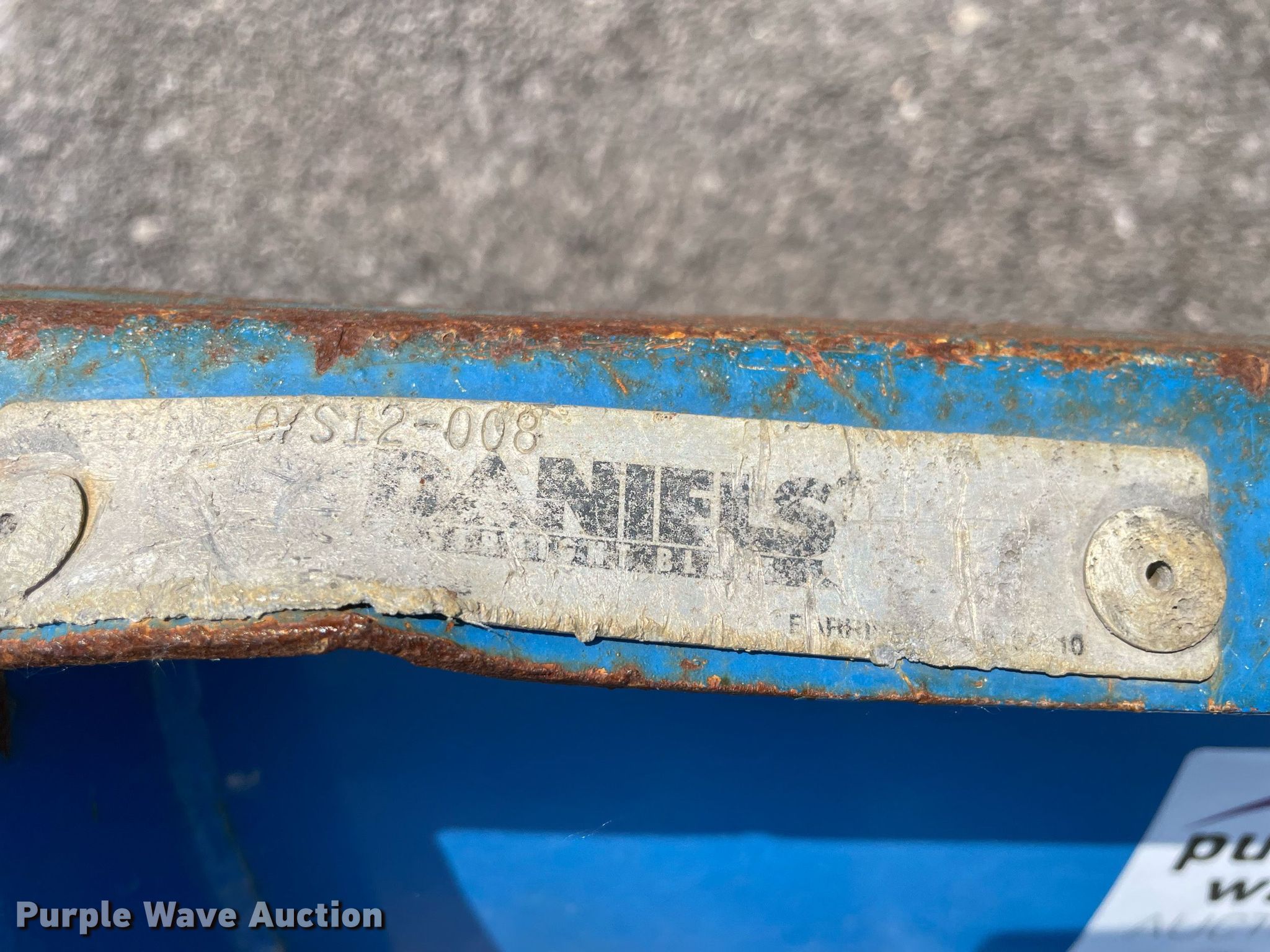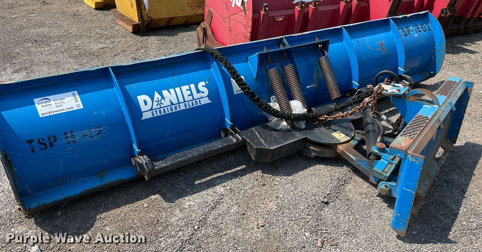 Daniels skid steer snow plow. Serial: 07S12-008, Width: 12', Unit #: TSP-12-03. Pursuant to Illinois law, Purple Wave will not be collecting sales taxes on any of the purchases made in this business liquidation auction. Snow Management Equipment Auction - Open inspection July 12 and 18. 31W377 Spaulding Road. Elgin, IL 60120