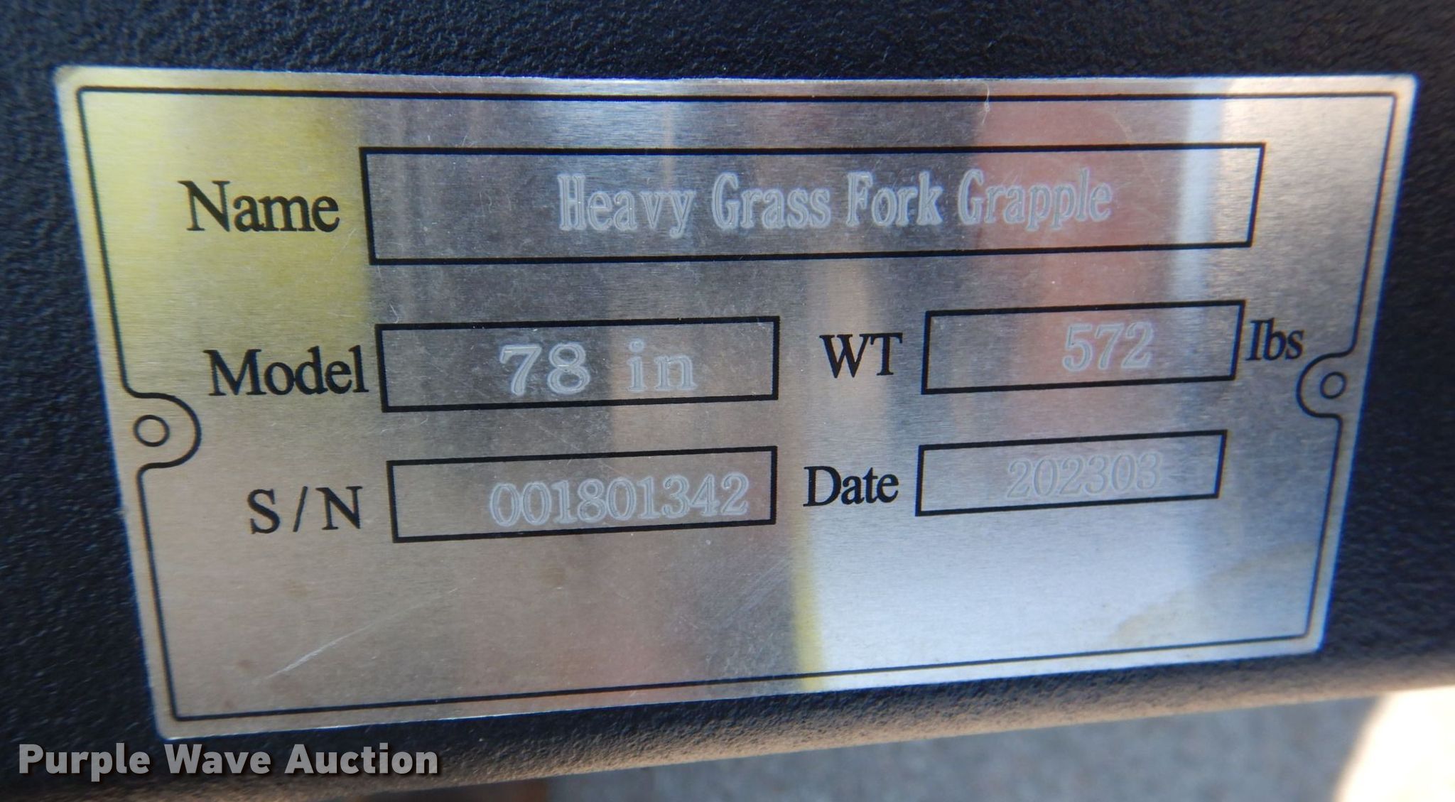 Skid steer grapple bucket. Serial: 001801342, Width: 78", Teeth: Bolt-on. Notes Unused. Jordan Machinery / S & N Auto Sales. 25050 US Hwy 275. Waterloo, NE 68069
