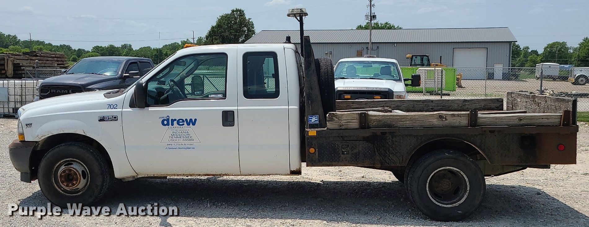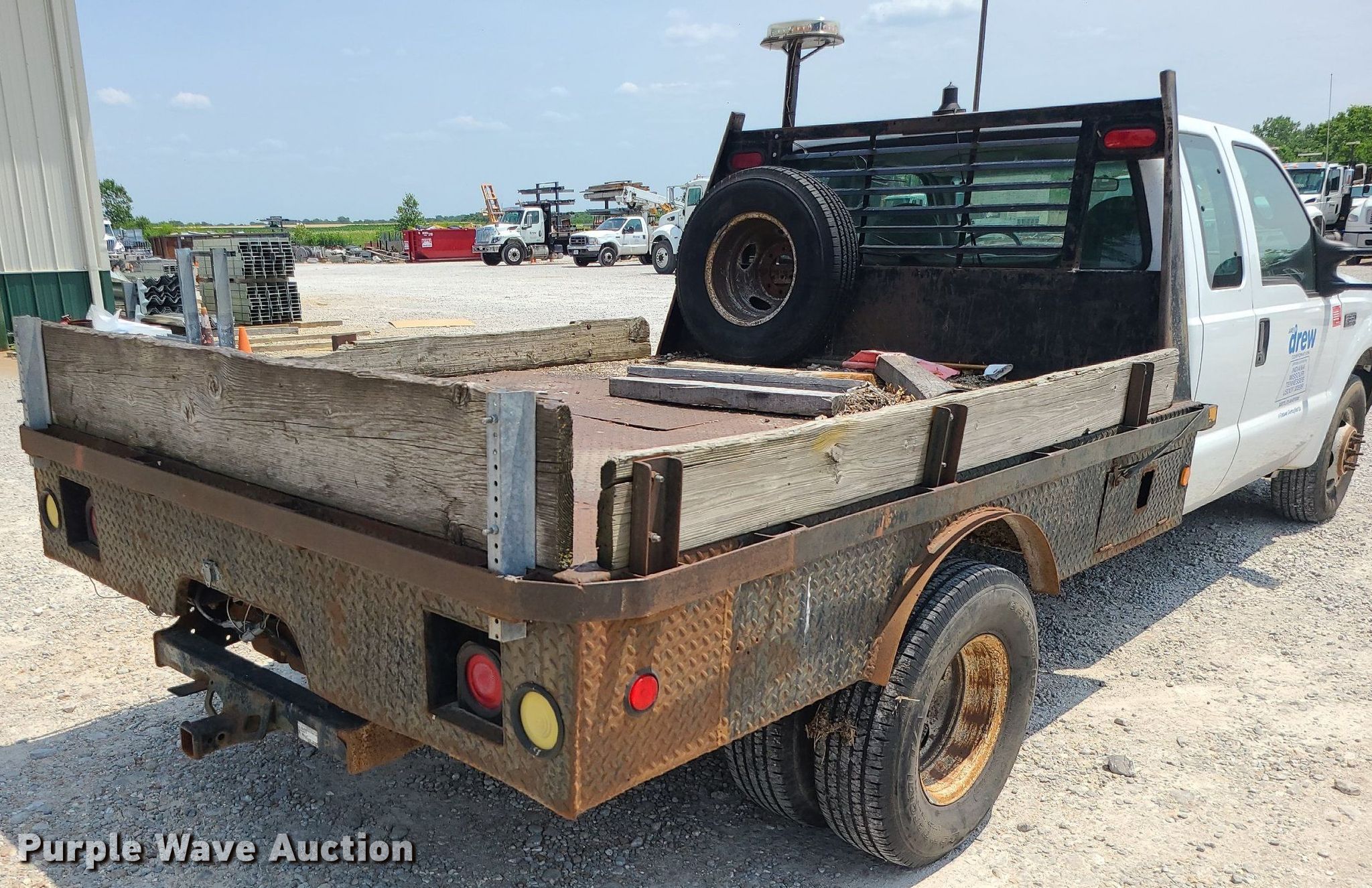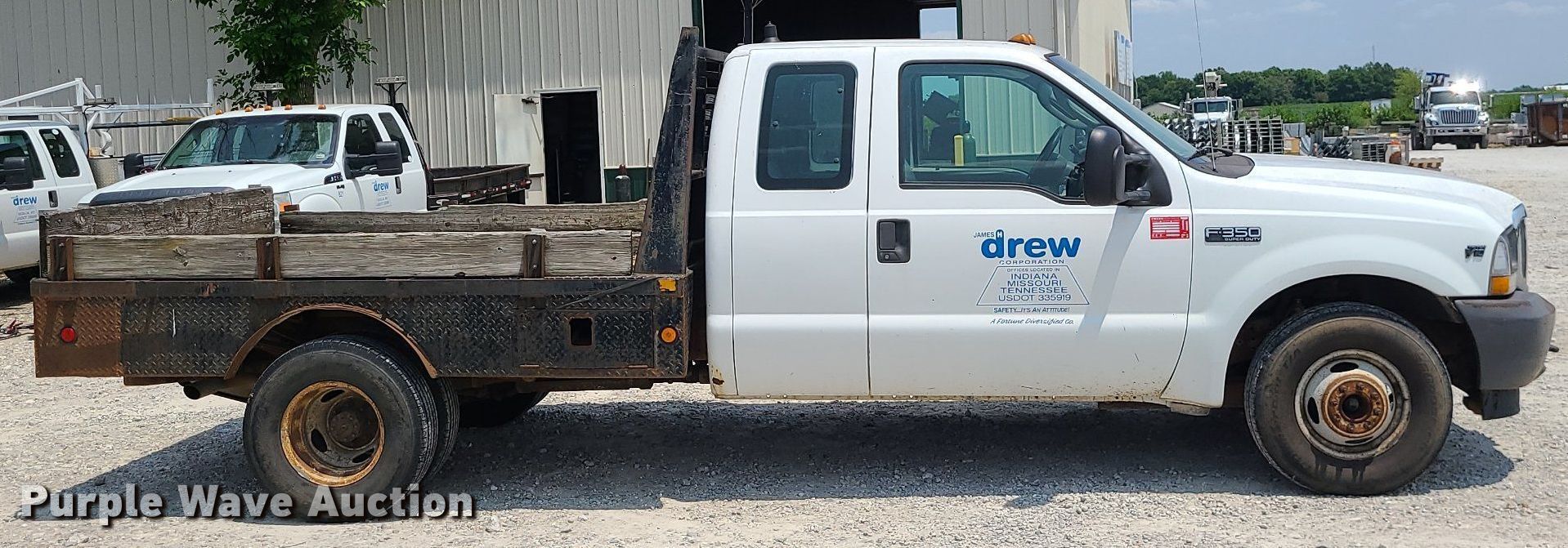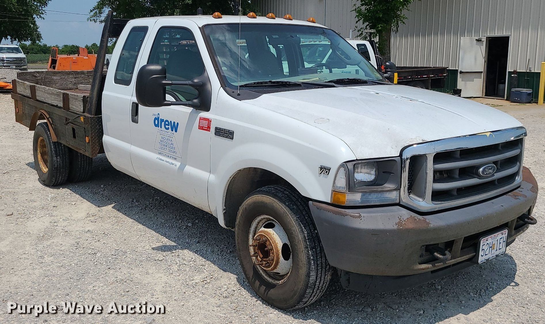 2004 Ford F350 Super Duty SuperCab flatbed pickup truck. Miles: 287,347 on odometer, VIN: 1FDWX36S94EA49671. Engine Displacement: 6.8L V10 SOHC, Cylinders: 10, Fuel type: Gas. Transmission Automatic. Interior AC, Heat. Features Flatbed 9' L x 94" W. Tires Size: 235/85R16. Notes Dead battery, Non-operational AC. Missouri title. James H. Drew Corp.. 1578 E Boonville St. Sedalia, MO 65301