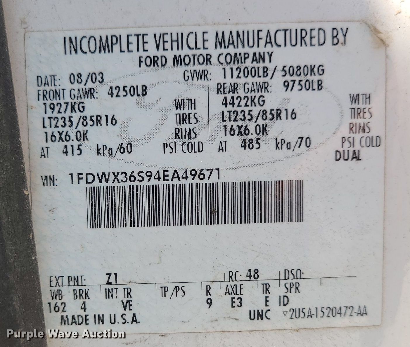 - VIN: 1FDWX36S94EA49671