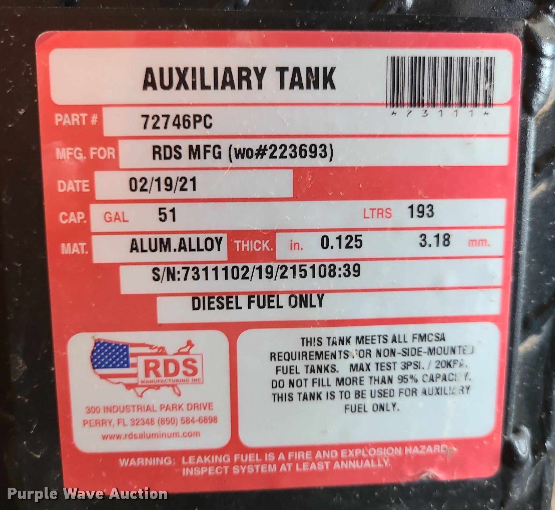 Purple Wave is selling a used Automotive Parts or Acces. in Missouri. This item is a RDS auxiliary fuel tank/toolbox with the following: Capacity: 51 gallons