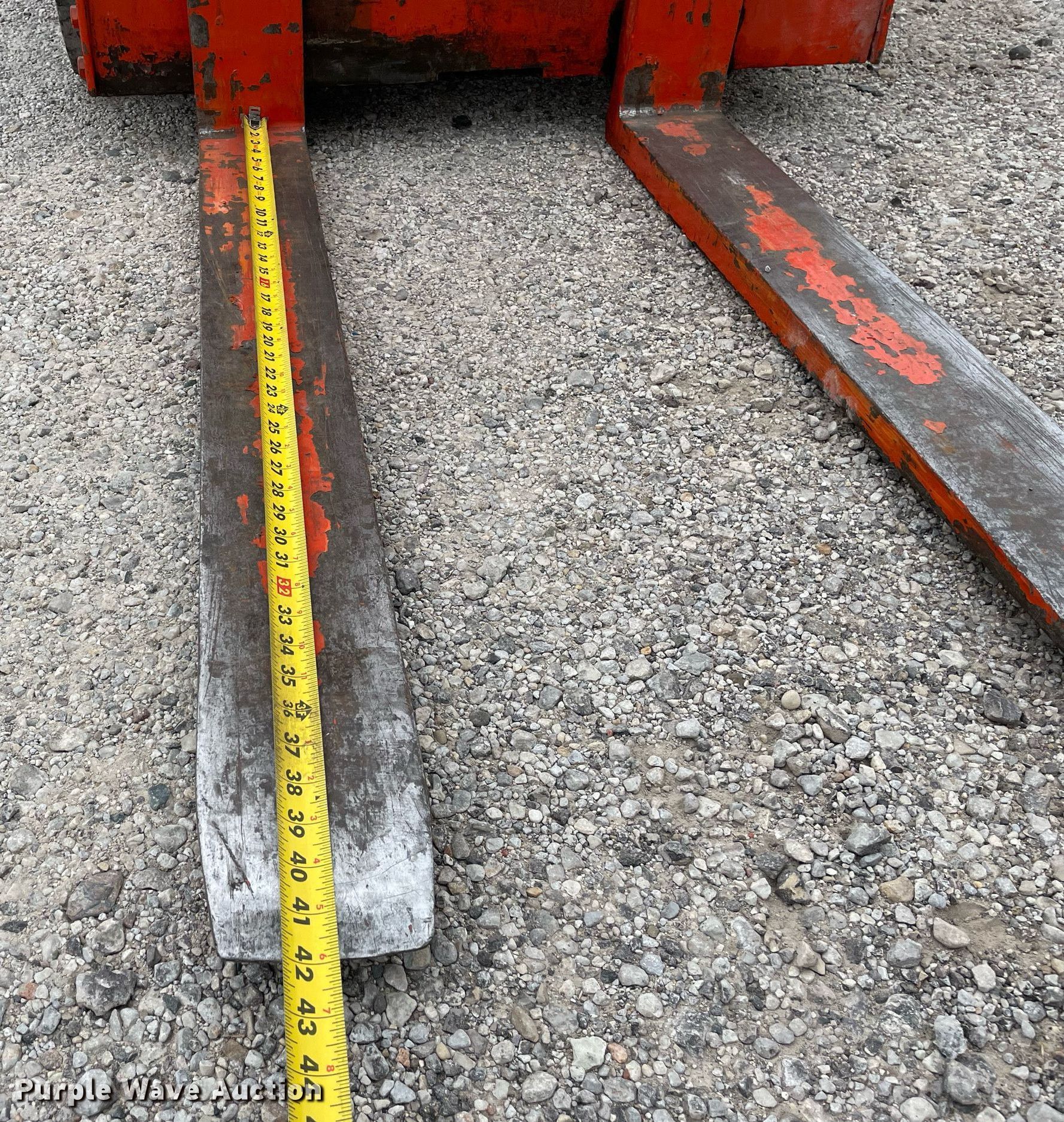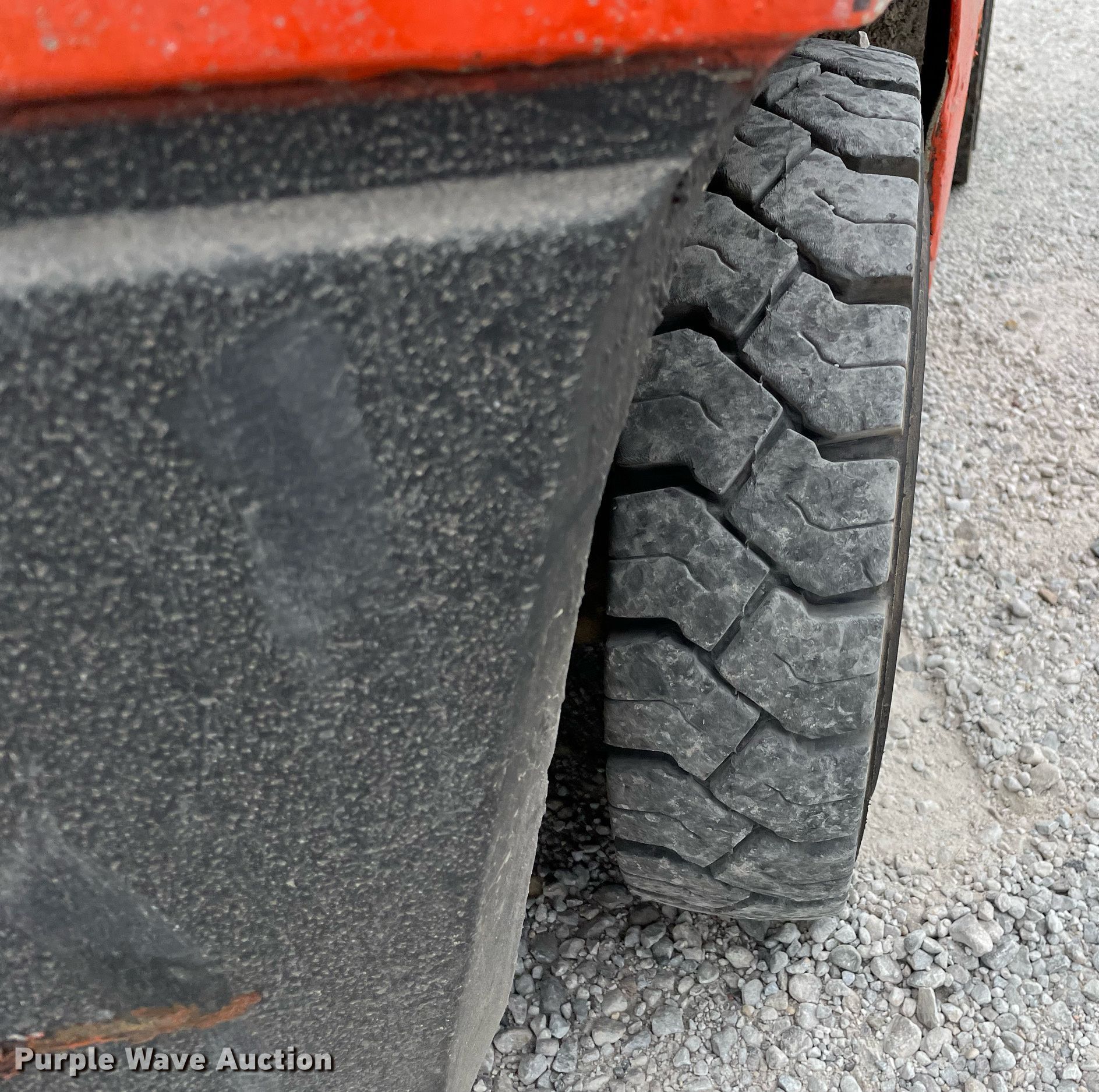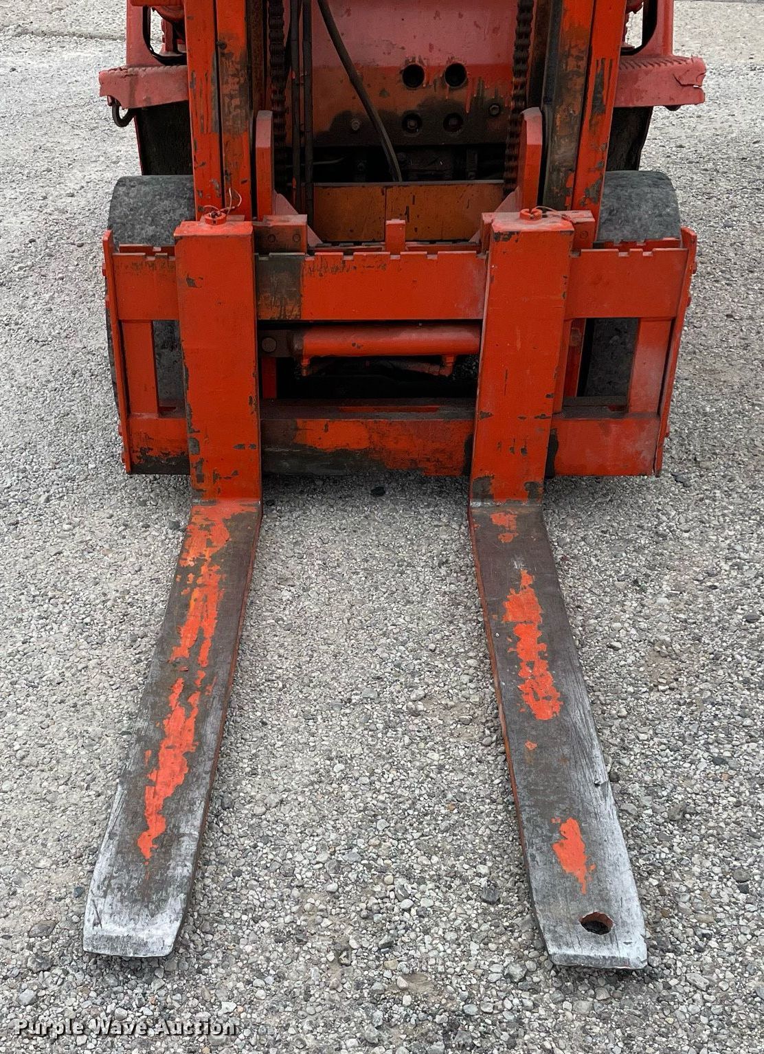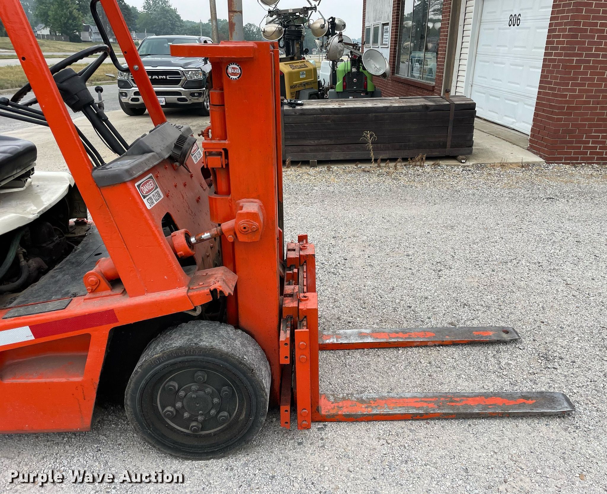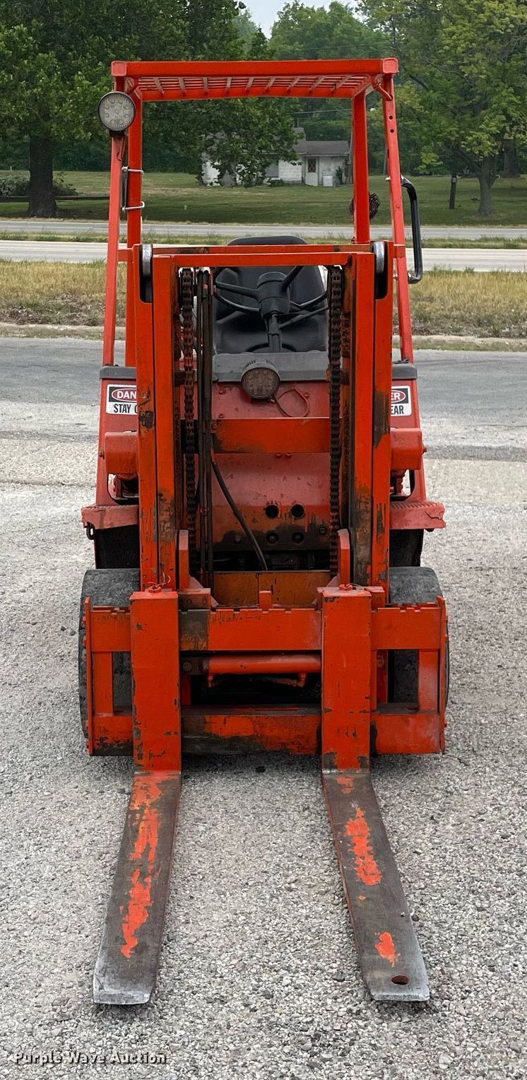 Toyota 42-4FGC20 forklift. Hours: 8,425 on meter, Serial: 404FGC25-12427. Engine Cylinders: 4, Fuel type: LPG LP bottle: Not included. Transmission Powershift, 1F - 1R. Operators station Canopy. Features Maximum lift capacity: 4,000 lbs, Maximum lift height: 79", Mast stages: 2, Side shift, Mast tilt, Fork length: 42". Tires Front: 21x7x15, Rear: 18x5x12.25, Solid. Notes Side shift hydraulic leak. Lancaster Construction Co.. 806 Warrington Ave. Danville, IL 61832