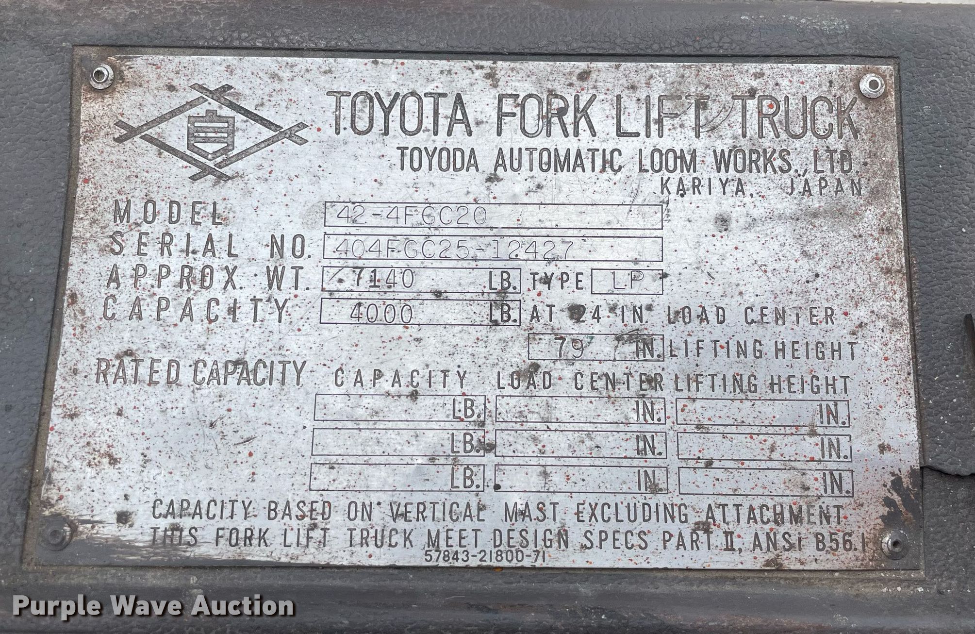 Purple Wave is selling a used Warehouse Forklift in Illinois. This item is a Toyota 42-4FGC20 forklift with the following: Hours: 8,425 on meter, Serial: 404FGC25-12427