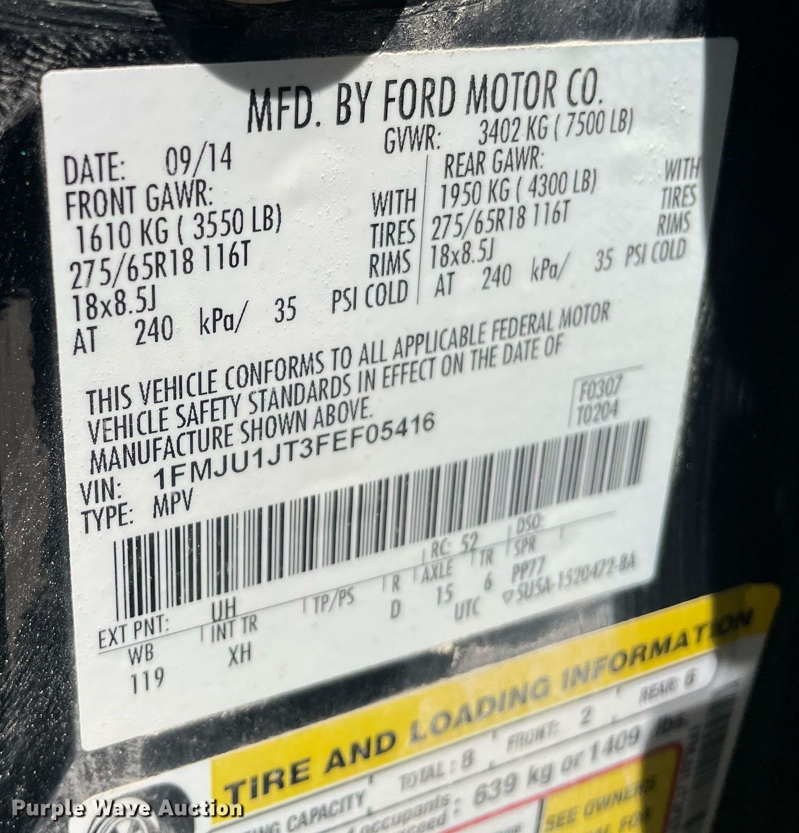 2015 Ford Expedition SUV. Miles: 155,410 on odometer, VIN: 1FMJU1JT3FEF05416. Engine Displacement: 3.5L V6 DOHC, Cylinders: 6, Fuel type: Gas. Transmission Automatic, Four wheel drive. Interior AC, Heat, Seat: Heated, Cooled, Power driver, Power passenger, Heated mirrors, Power windows, Power locks, Cruise control, Backup camera, Powered sunroof. Tires Size: 275/65R18. Notes Dash warning indicator: Check engine. Kansas rebuilt salvage title. Title distribution may be delayed up to 14 days from verification of funds. Marion, KS 66861