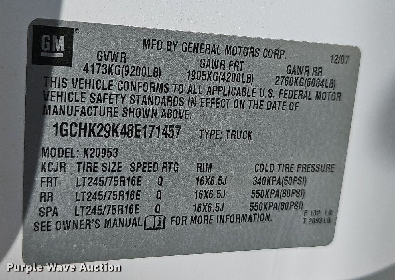 2008 Chevrolet Silverado 2500HD Ext. Cab pickup truck. Miles: 162,124 on odometer, VIN: 1GCHK29K48E171457. Engine Displacement: 6.0L V8 OHV, Cylinders: 8, Fuel type: Gas. Transmission Automatic, Four wheel drive. Interior AC, Heat, Heated mirrors, Power windows, Power locks, Cruise control. Tires Size: LT275/70R18. Notes Dash warning indicator: Check engine, TPMS, ABS, Airbag. Missouri title. Seller is a Missouri licensed motor vehicle dealer. Title will be assigned and distributed by the dealer. Please contact the seller for distribution questions. Marshfield Buildings. 550 Stonebrook Drive. Marshfield, MO 65706