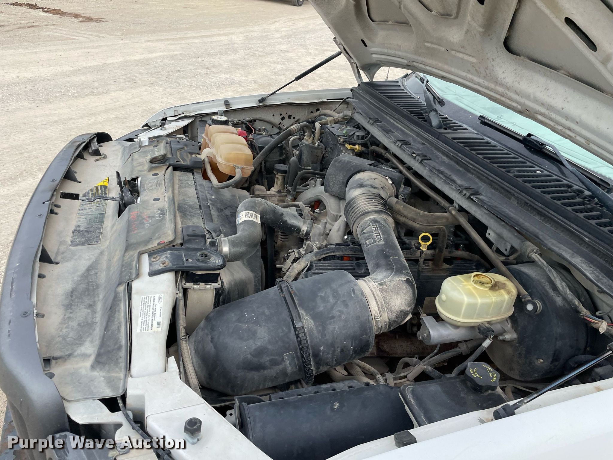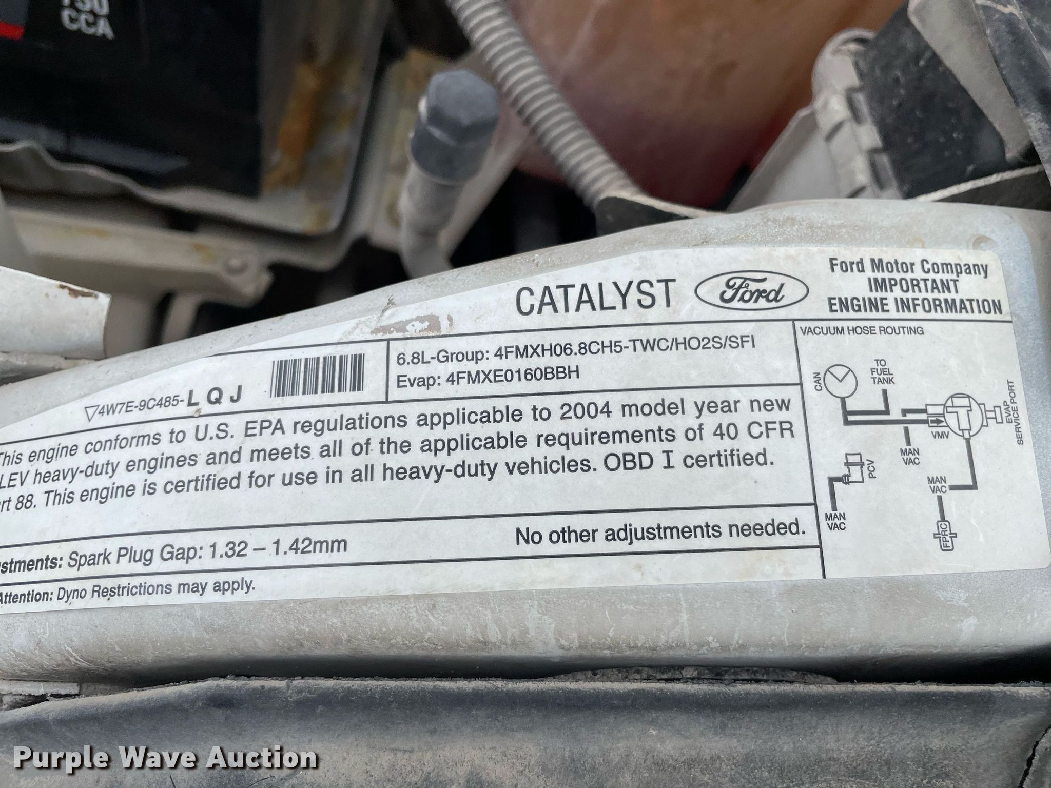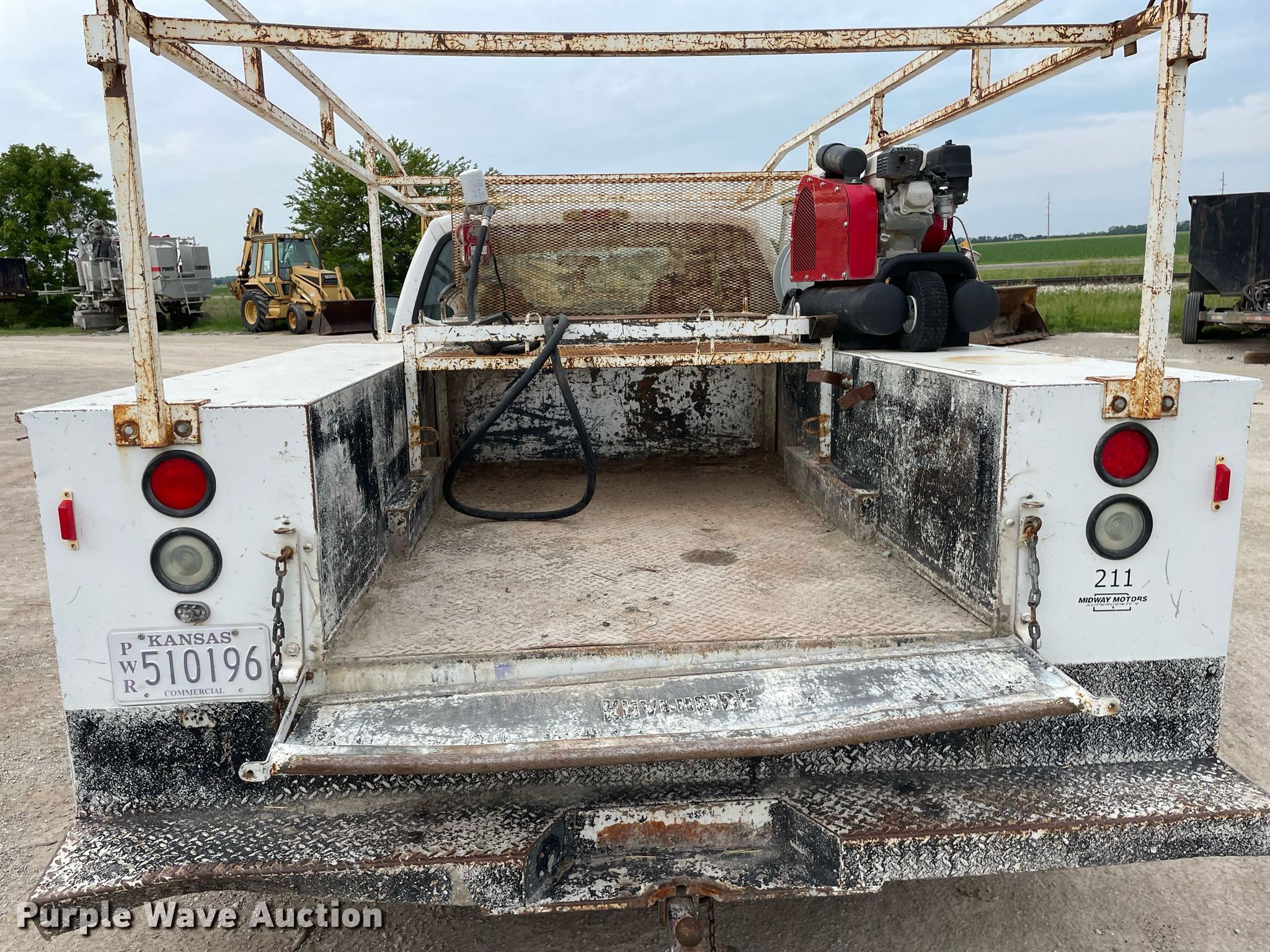 2004 Ford F350 Super Duty Crew Cab utility bed pickup truck. Miles: 206,273 on odometer, VIN: 1FTWW32S54ED17726, Unit #: 211. Engine Displacement: 6.8L V10 SOHC, Cylinders: 10, Fuel type: Gas. Transmission Automatic. Interior AC, Heat, Cruise control. Features Utility bed Knapheide, 8' 10" L x 96" W, Auxiliary fuel tank Fill Rite pump. Tires Size: 235/85R16. Notes Air compressor not included, will be removed prior to auction, Windshield chipped or cracked, Dead battery, Unknown operating condition of AC, Possible engine issues, runs rough. Kansas title. Vogts-Parga Construction LLC. Newton, KS 67114