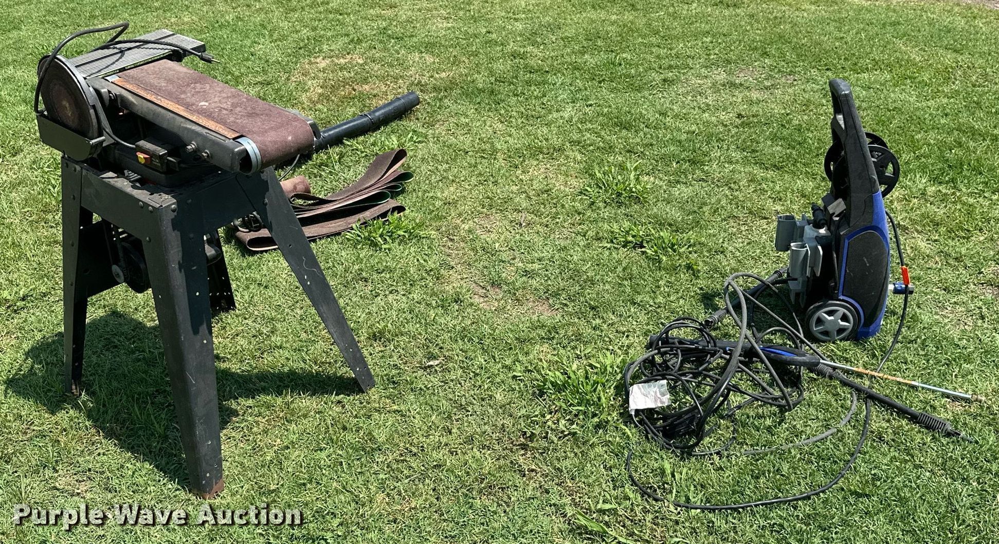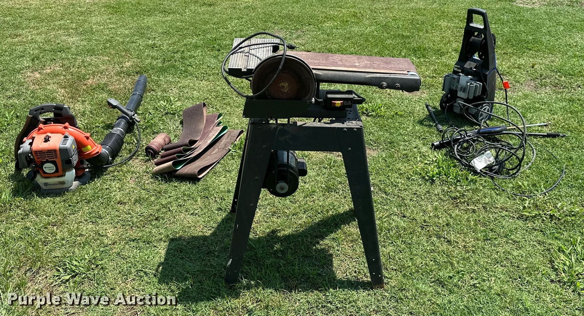 Purple Wave is selling a used Tools in Oklahoma. This item is a Tools with the following: Craftsman 113.225930 belt sander, Single phase, 6" sanding belt, Additional belts, Husqvarna 130BT leaf blower, Single cylinder gas engine, Blue Clean 383 pressure washer, 120V, Single phase, 1.5 GPM, 1,900 PSI